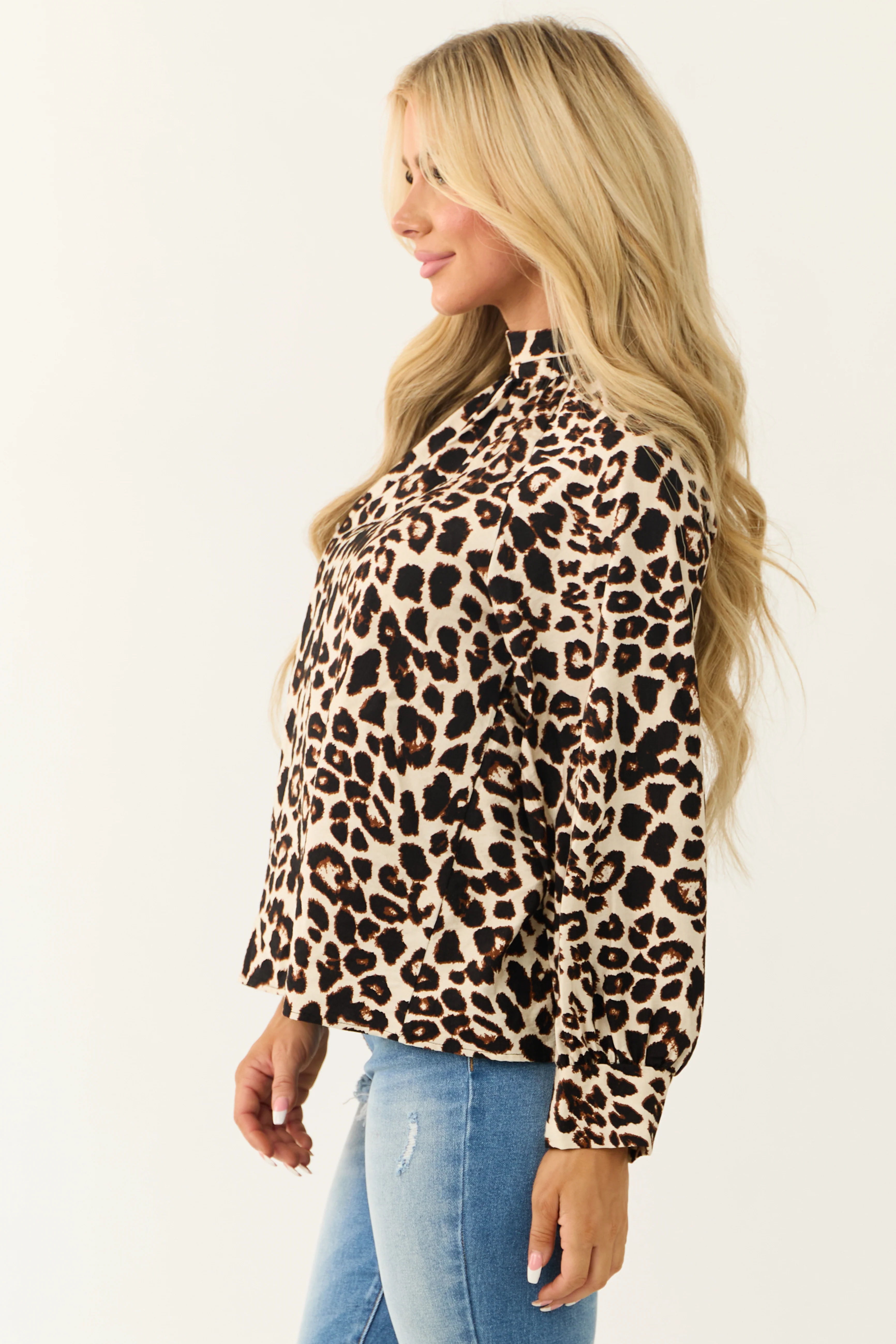 Ivory Leopard Print Mock Neck Long Sleeve Blouse