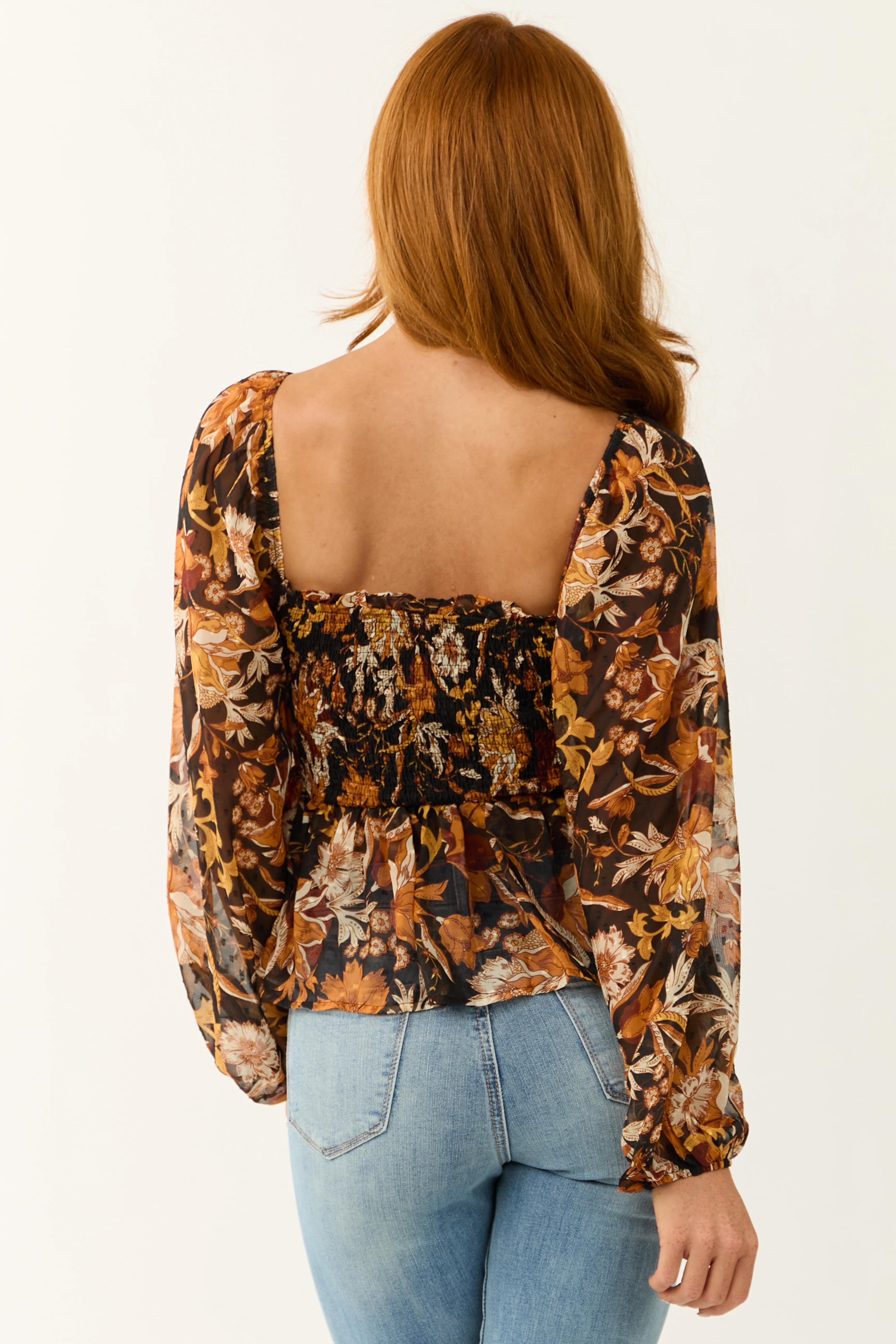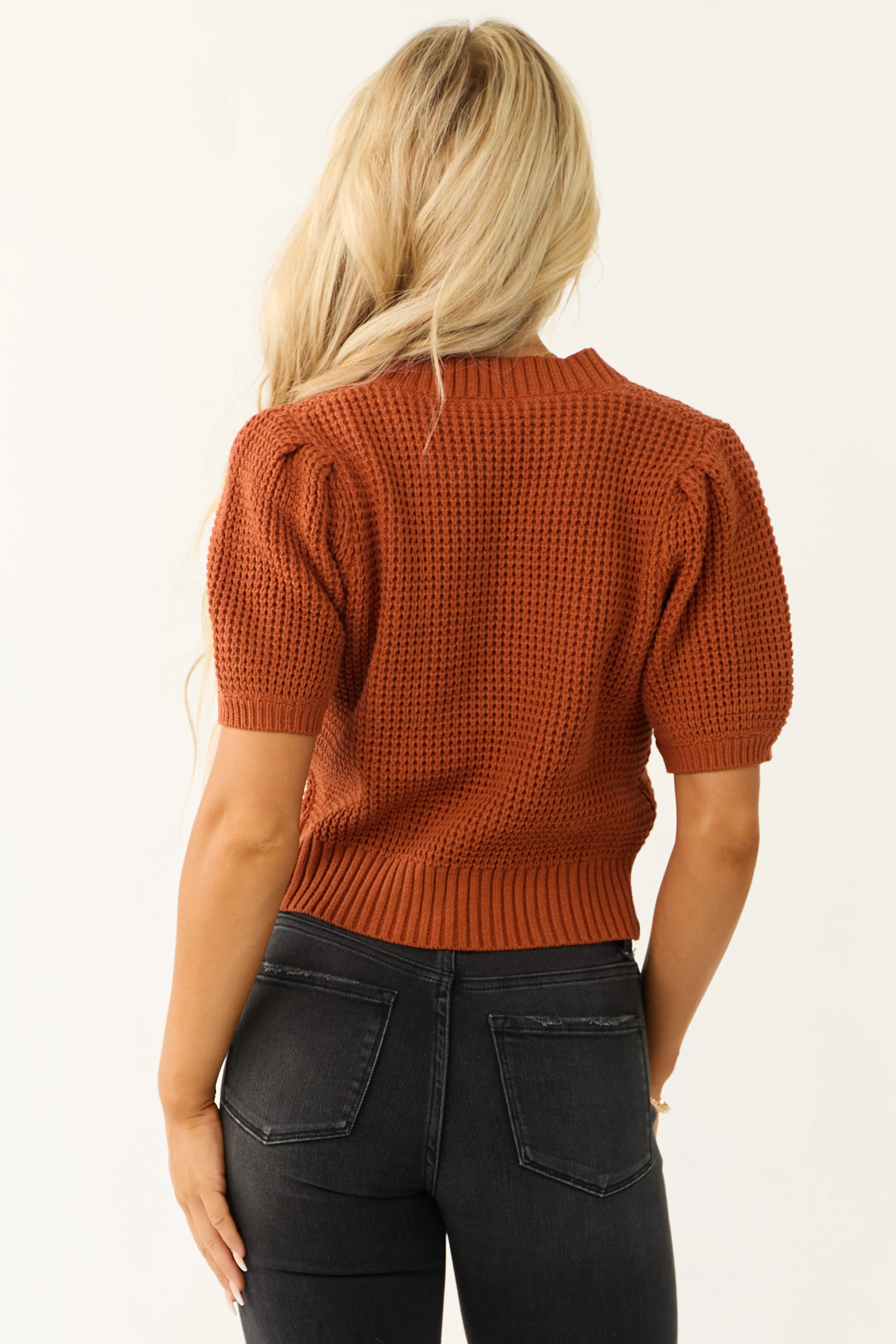 Burnt Orange Notched Neck Puff Sleeve Sweater Top