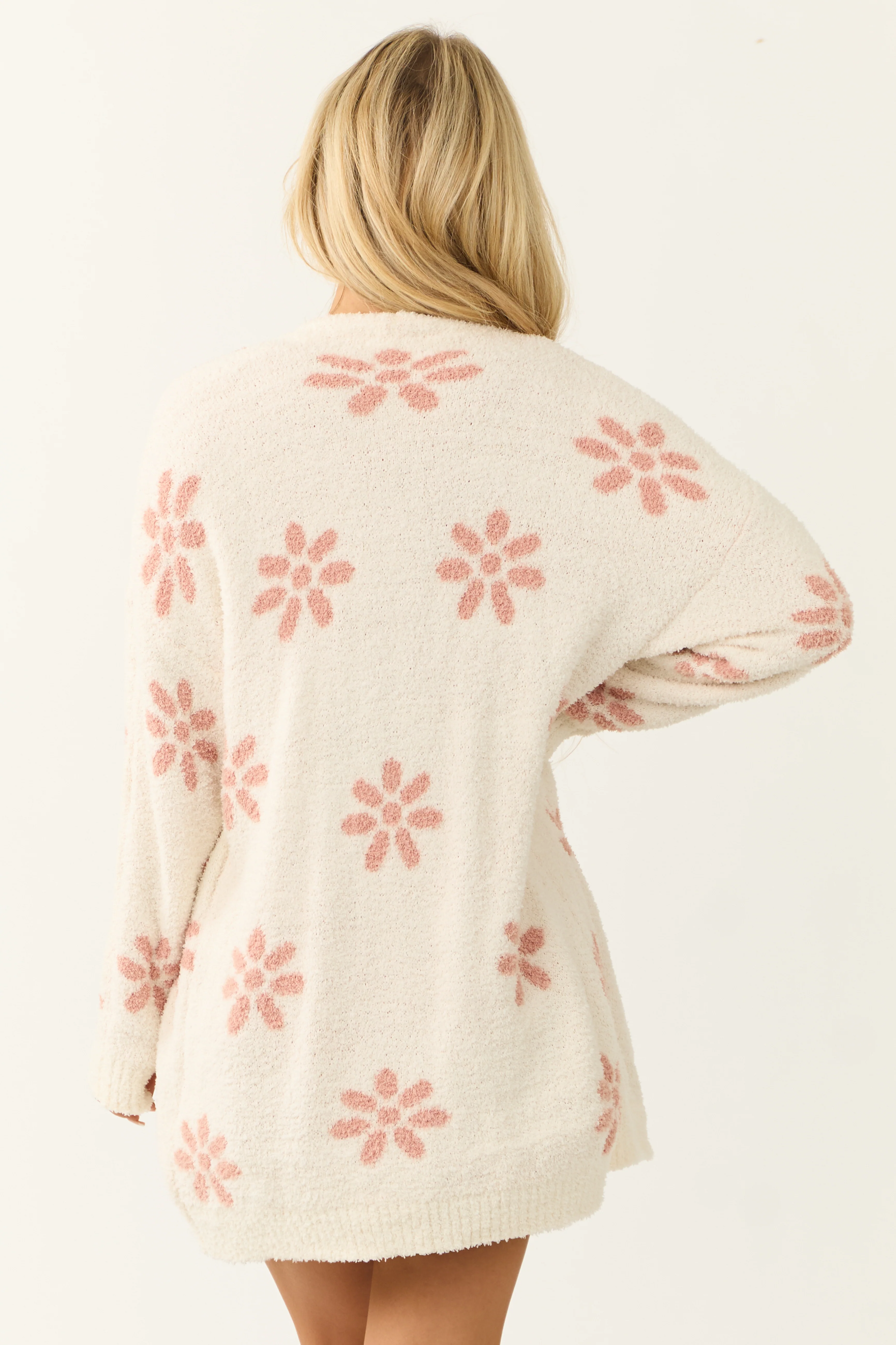 Ivory and Coral Floral Pattern Oversized Cardigan