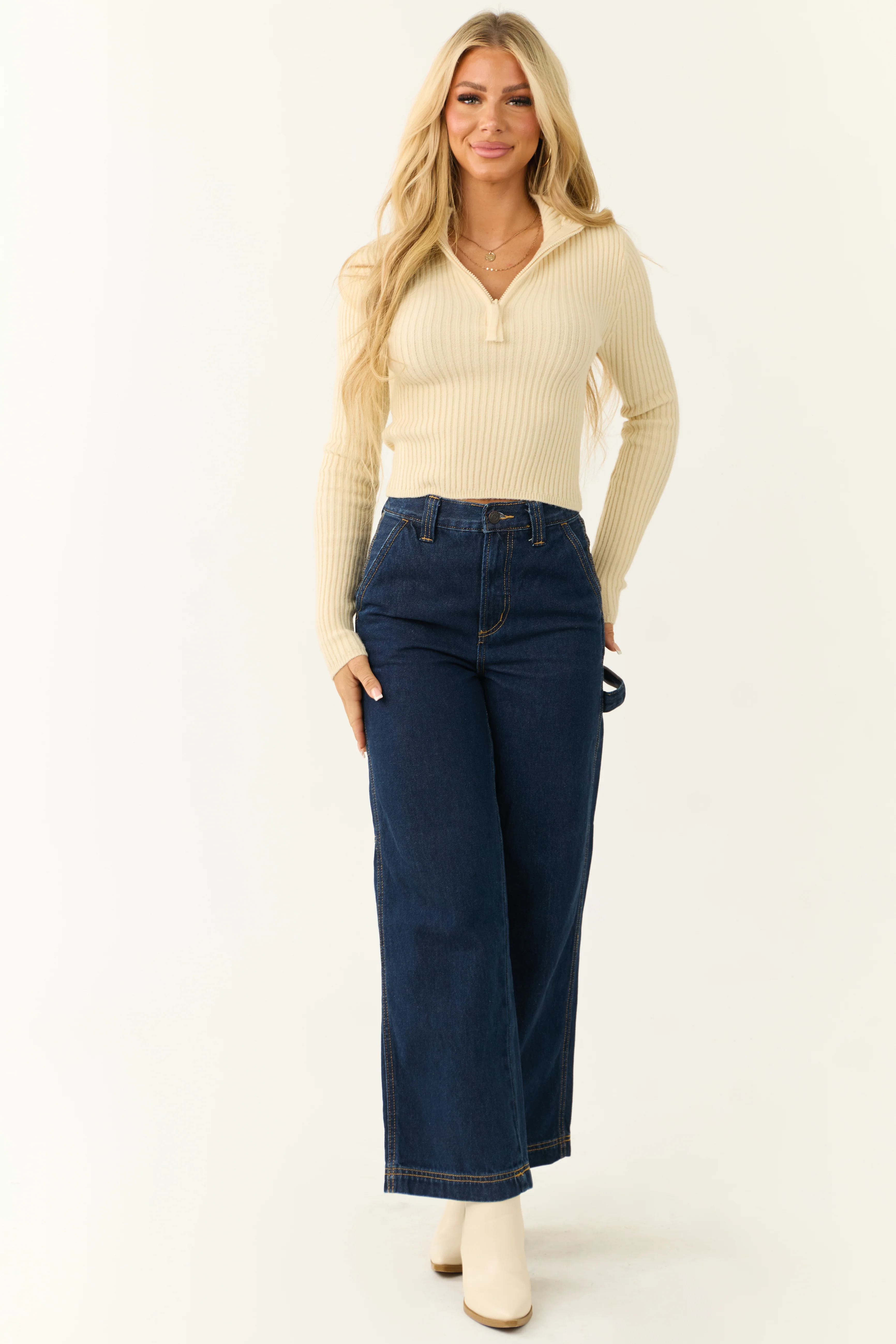 Cream Ribbed Knit Half Zip Fitted Top