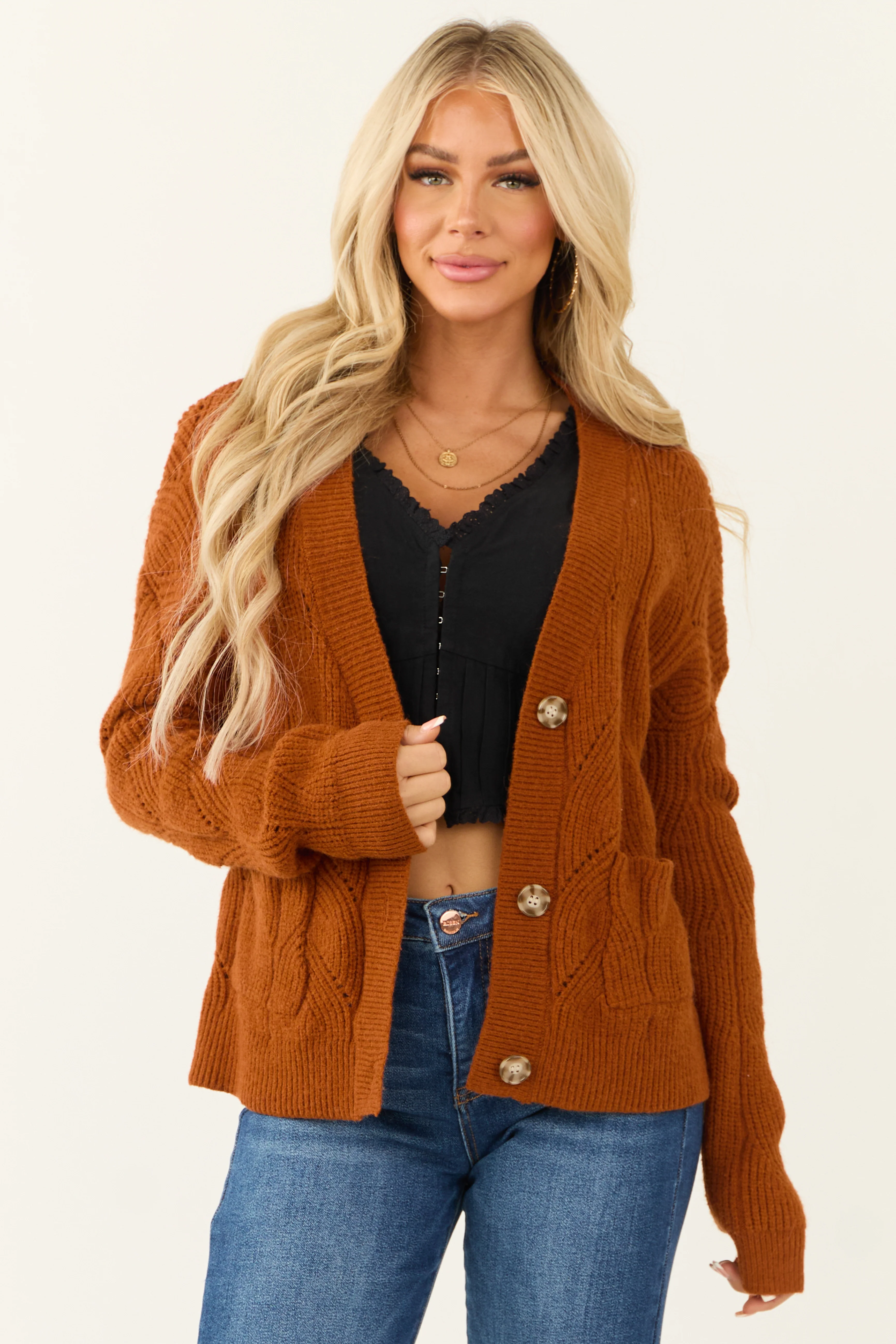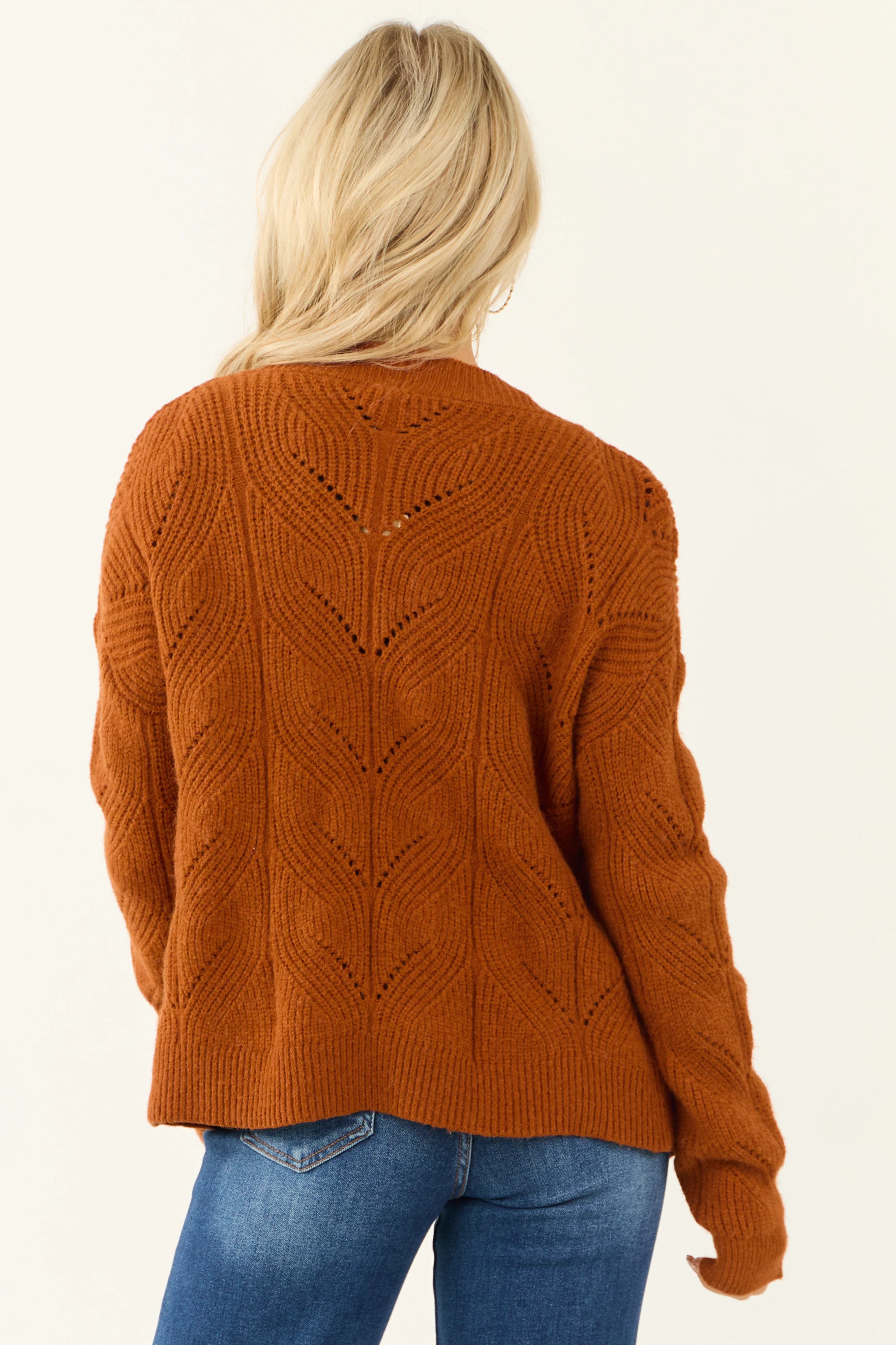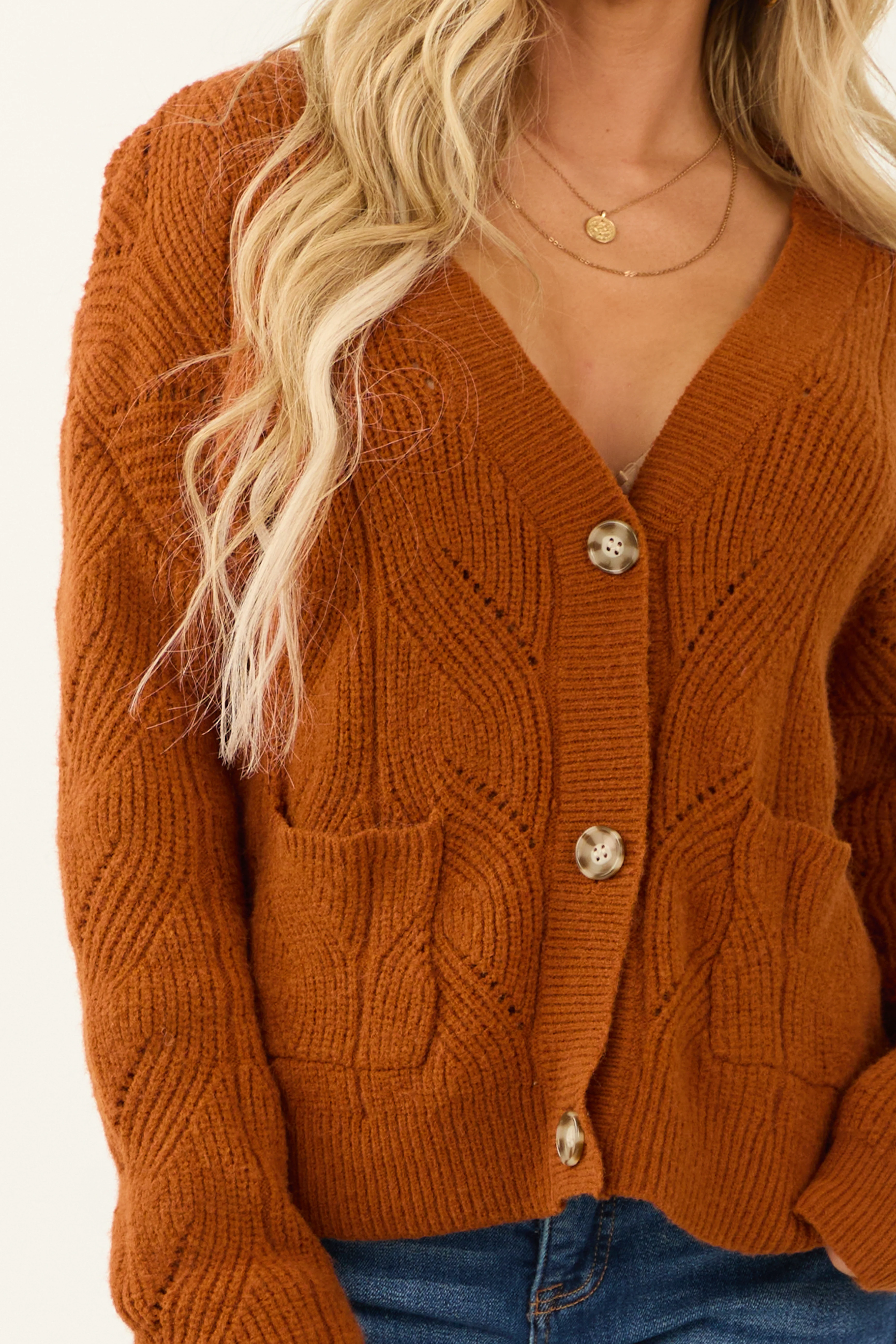 Rust Pointelle Button Down Long Sleeve Cardigan