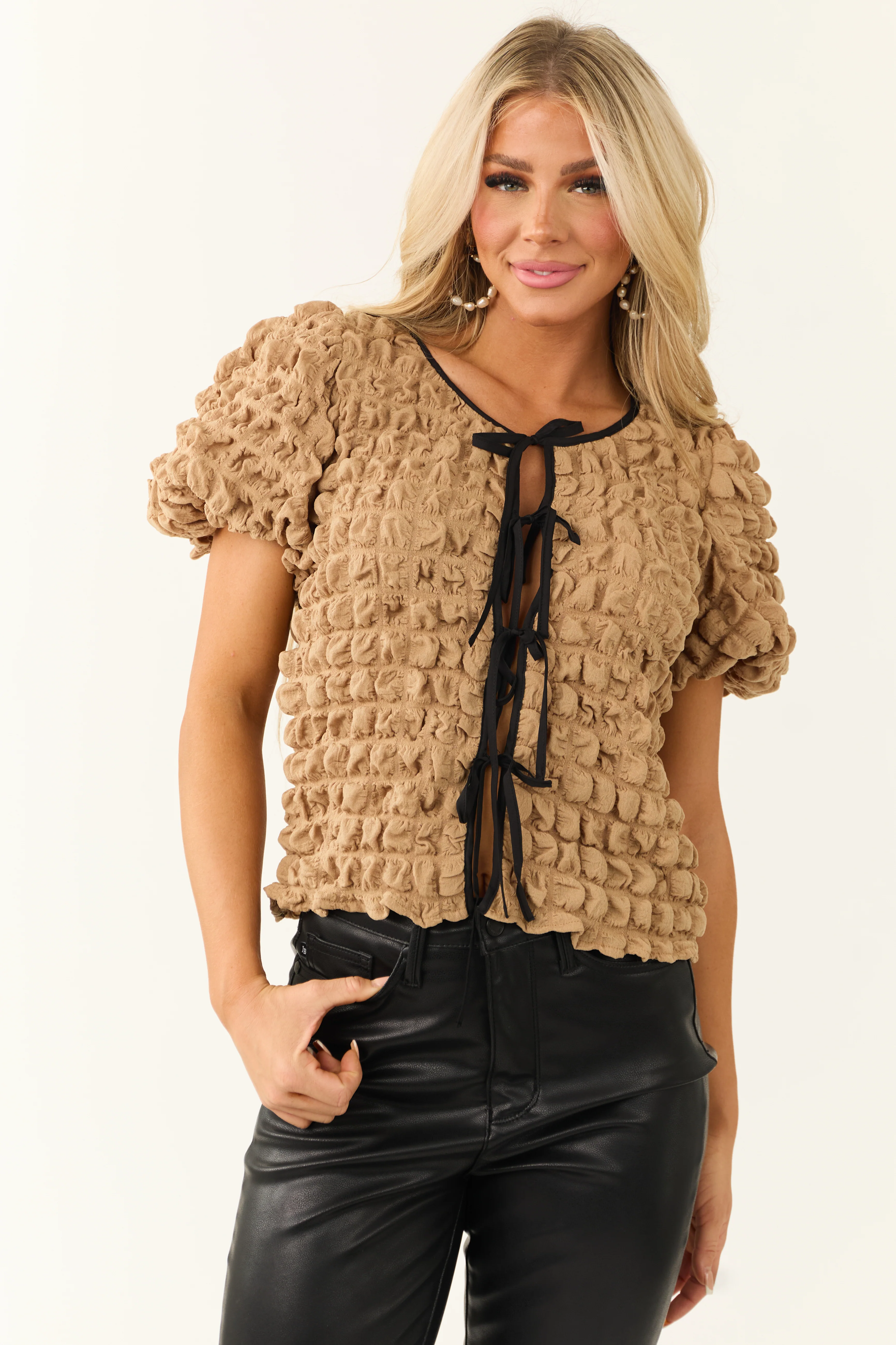 Brown Sugar Bubble Textured Front Tie Top