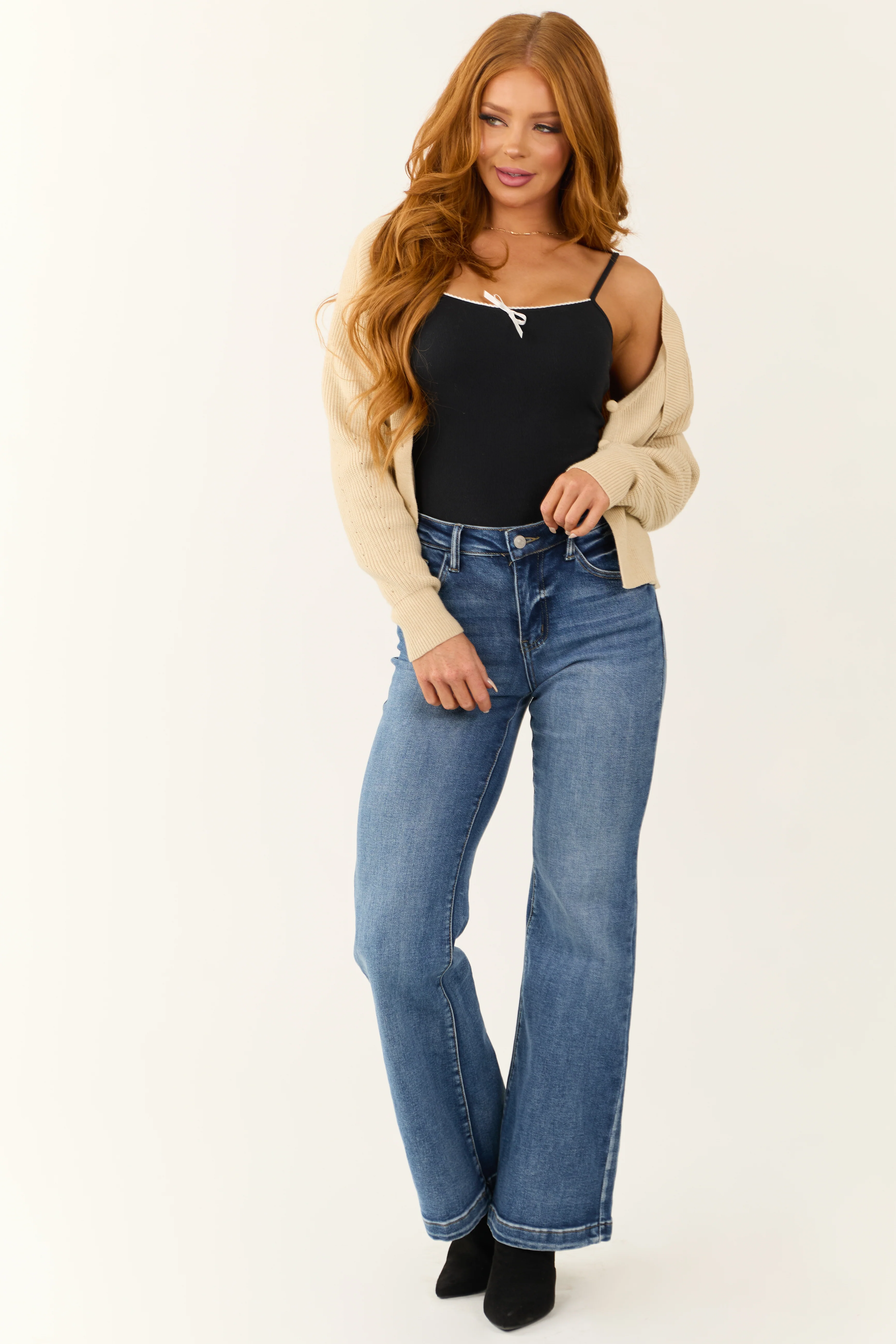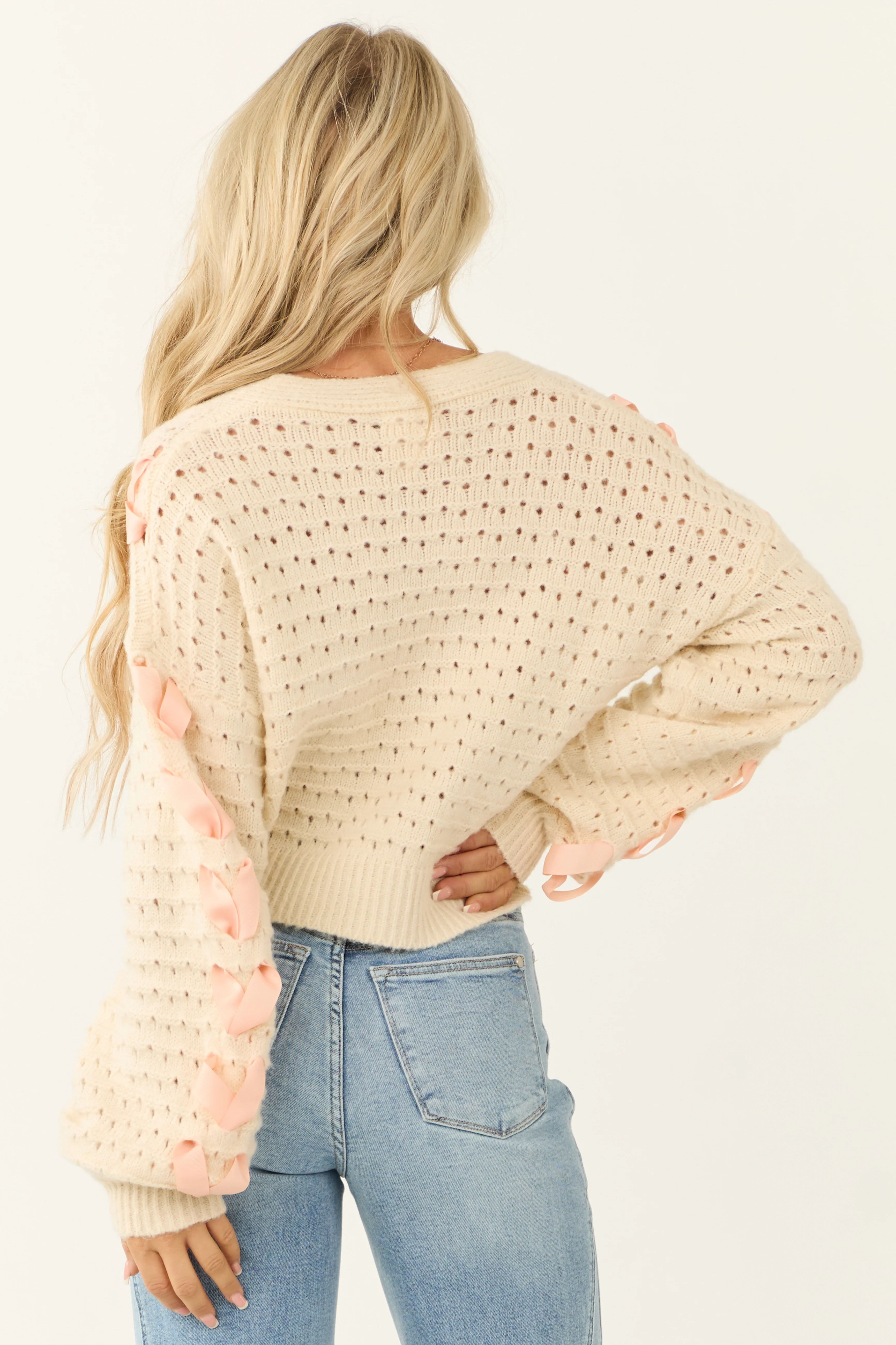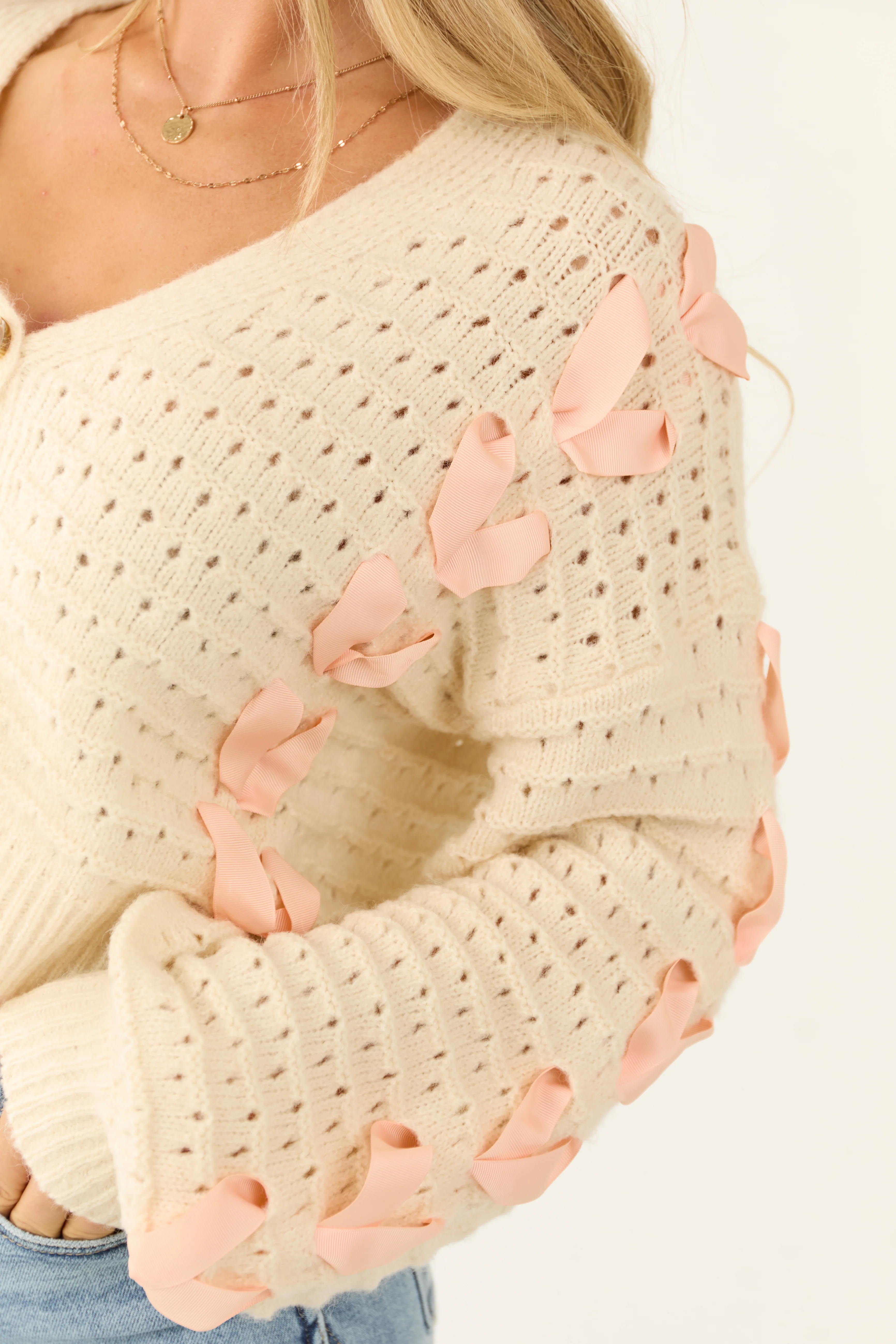 Ivory Ribbon Detail Pointelle Knit Cardigan