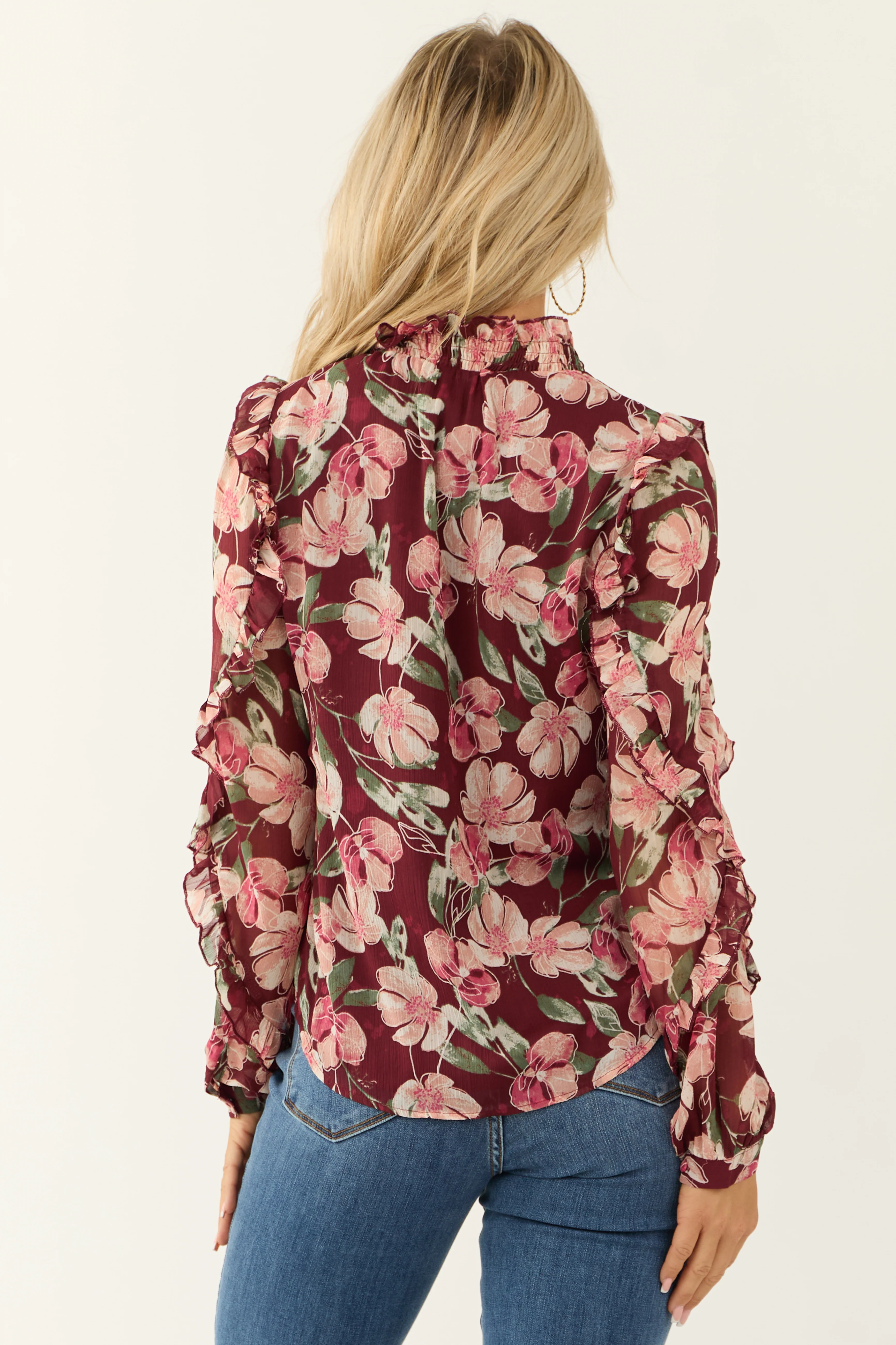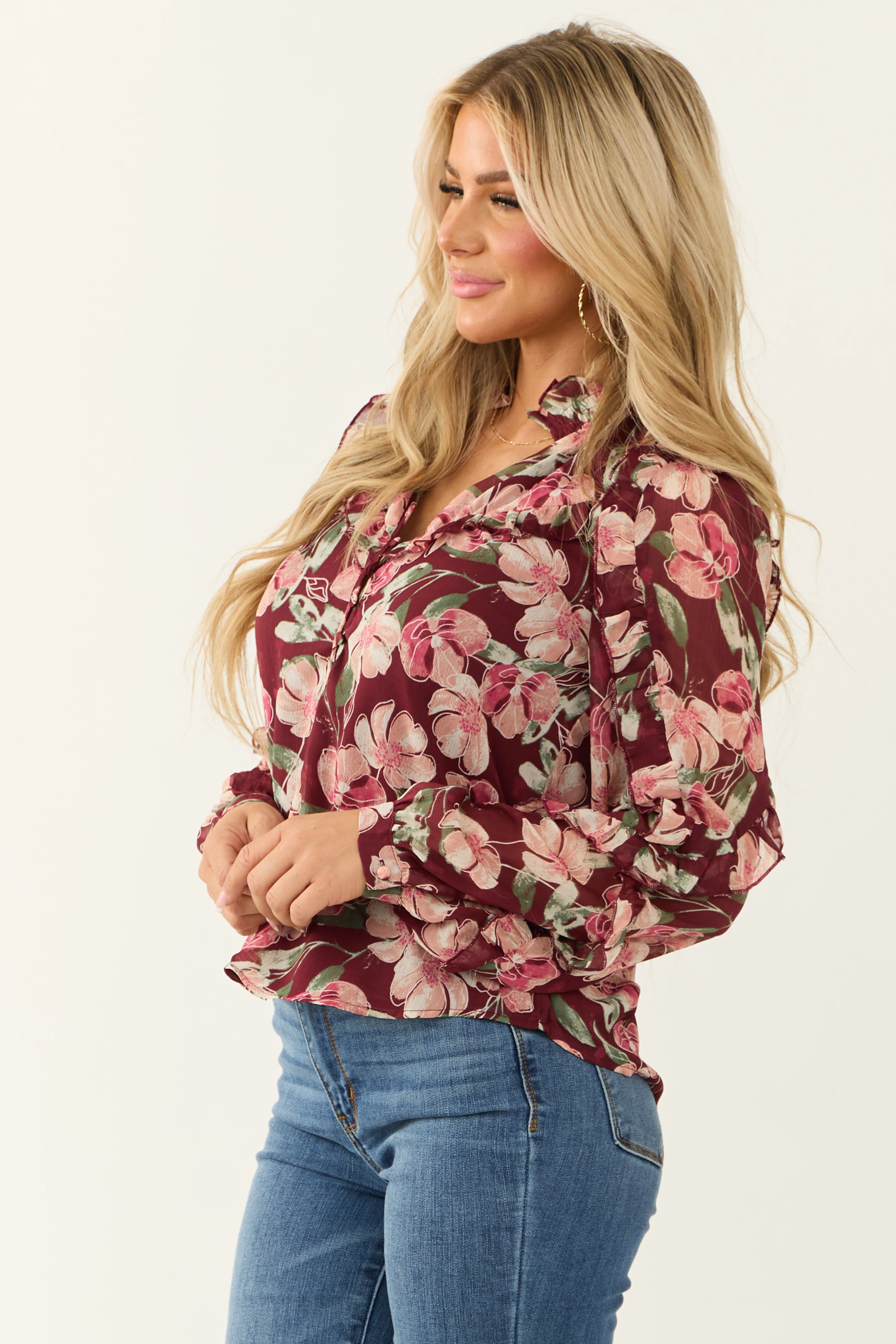 Deep Wine Floral Print Long Sleeve Blouse