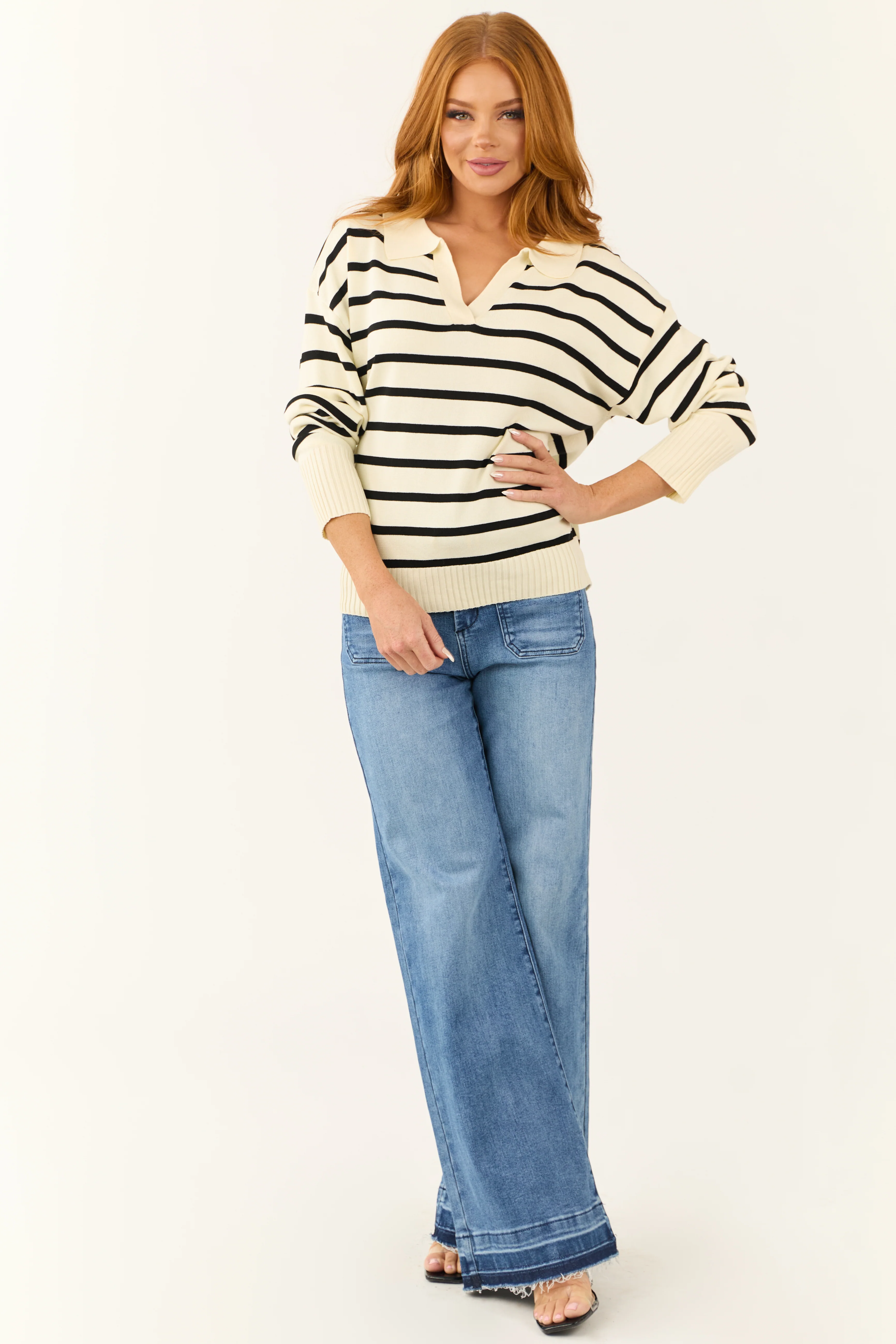 Cream and Black Striped Collared V Neck Sweater