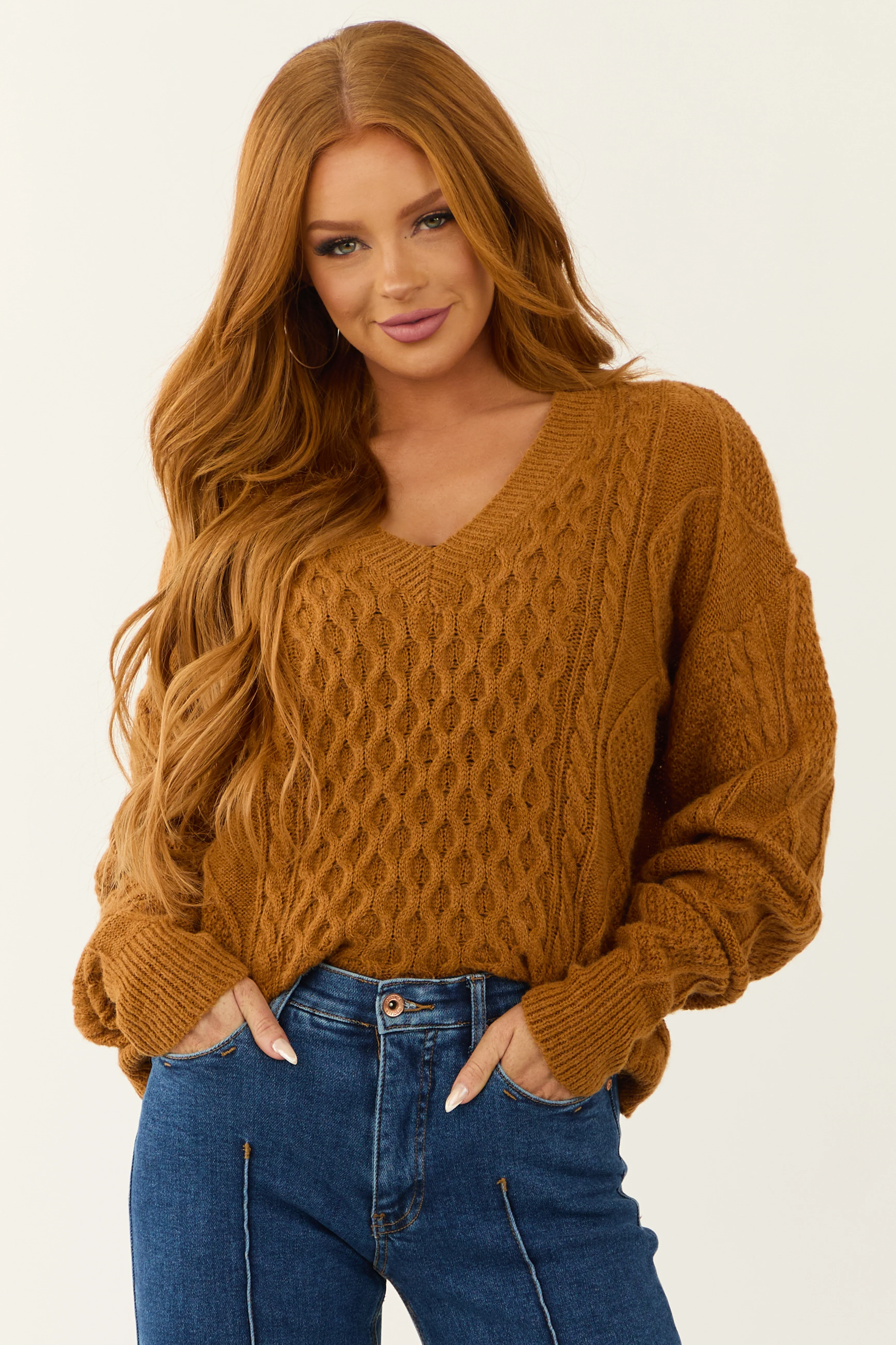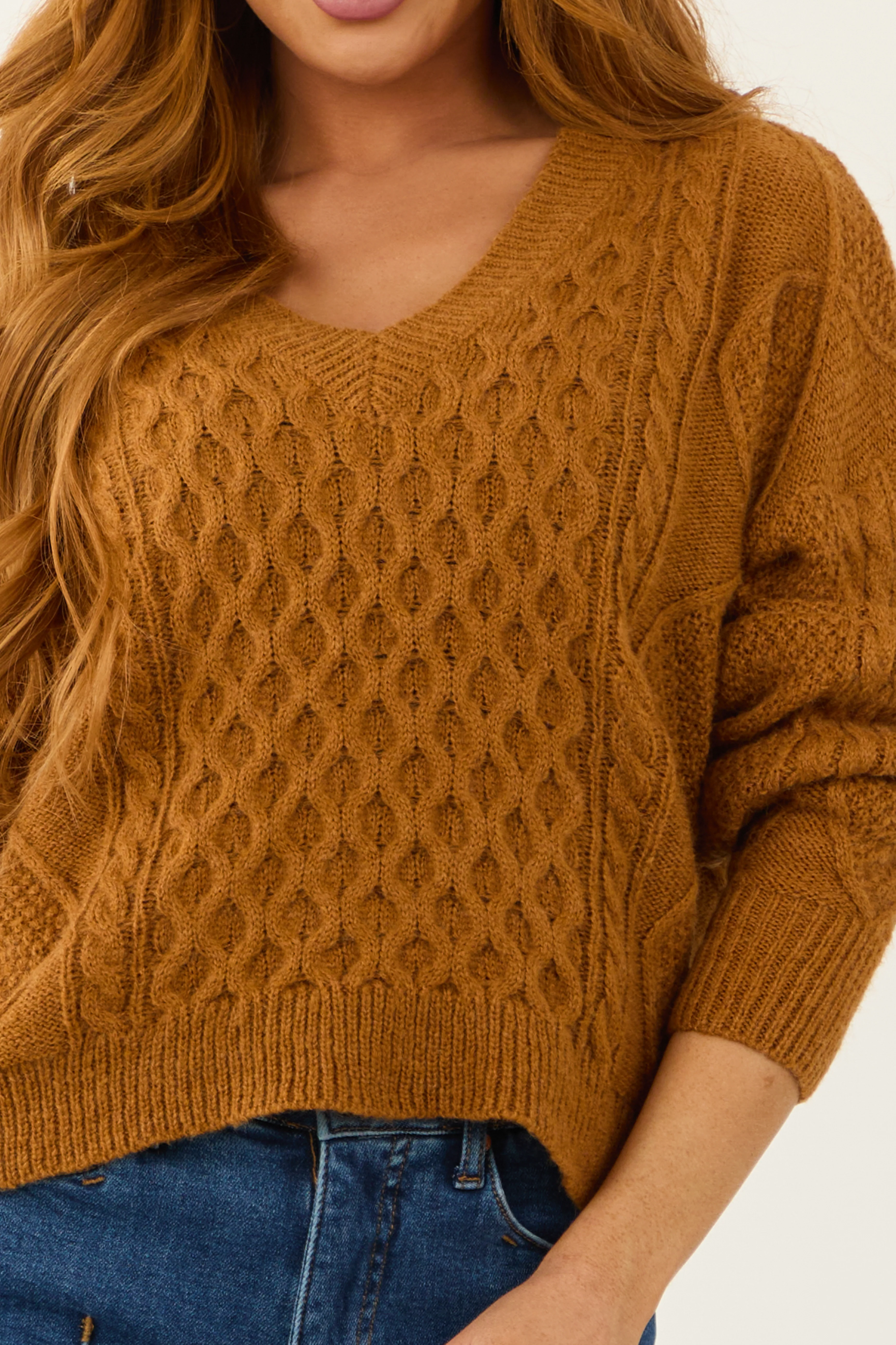 She+Sky Caramel V Neck Cable Knit Sweater