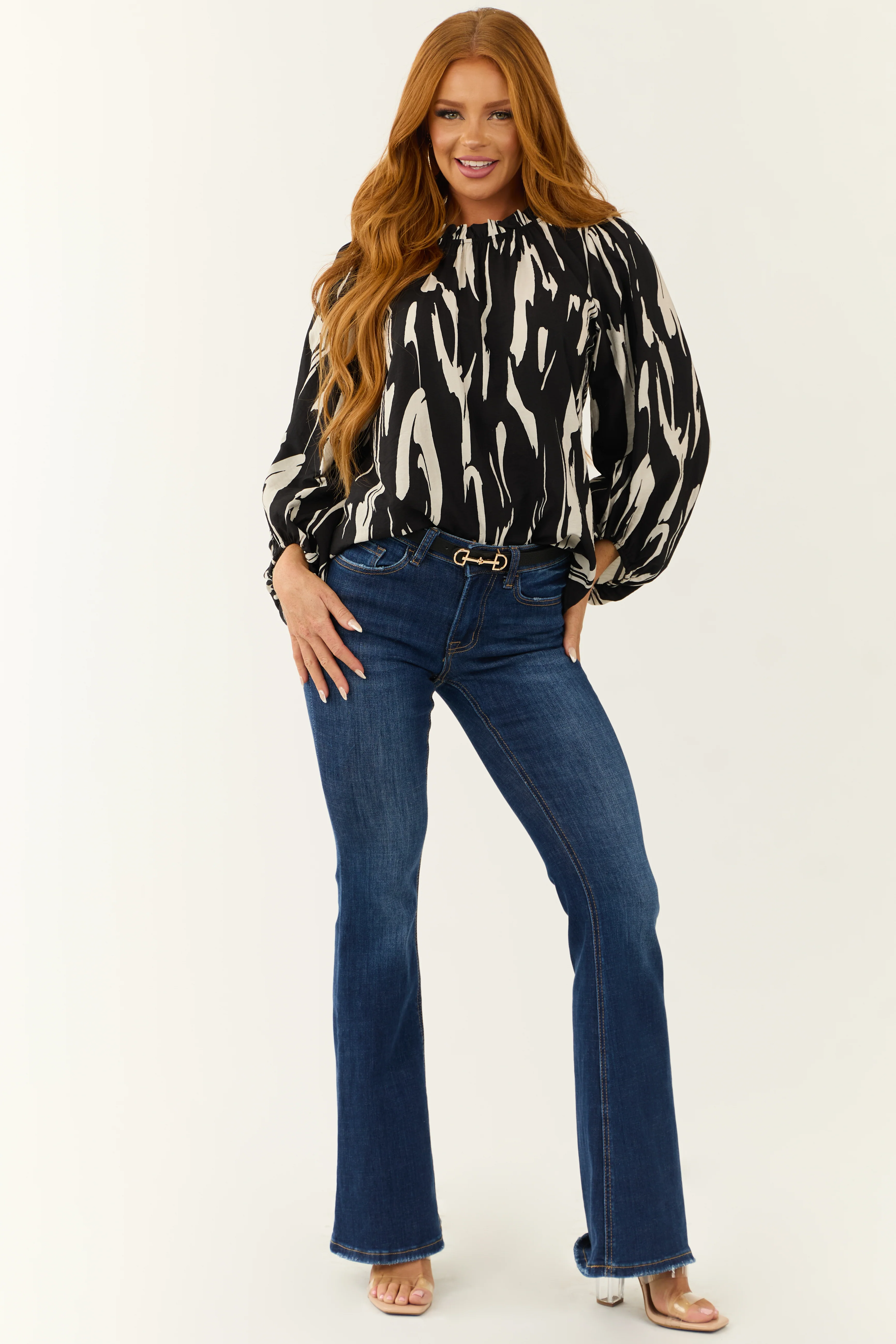 Black Abstract Print Long Puff Sleeve Top