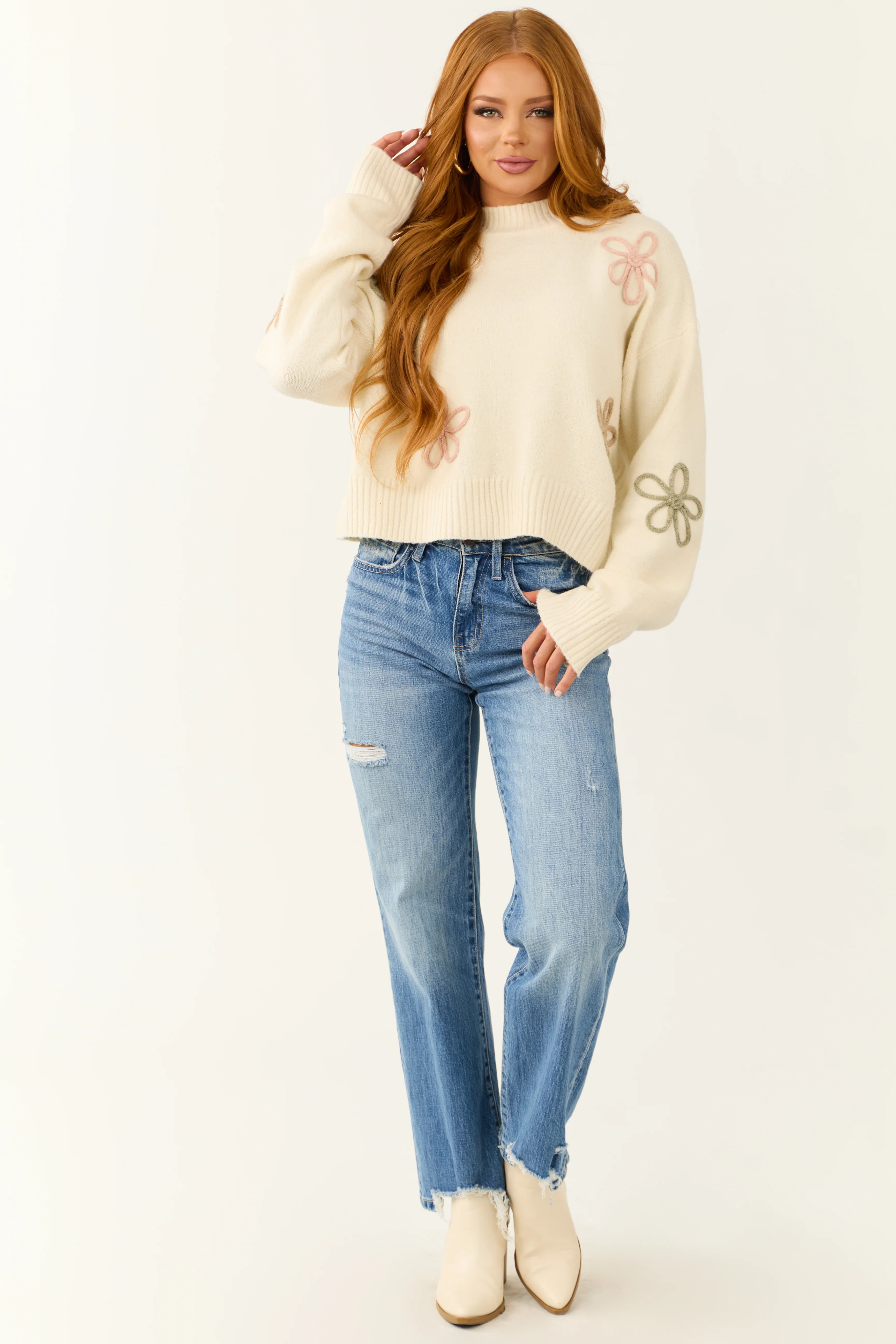 Cream Mock Neck Floral Applique Sweater
