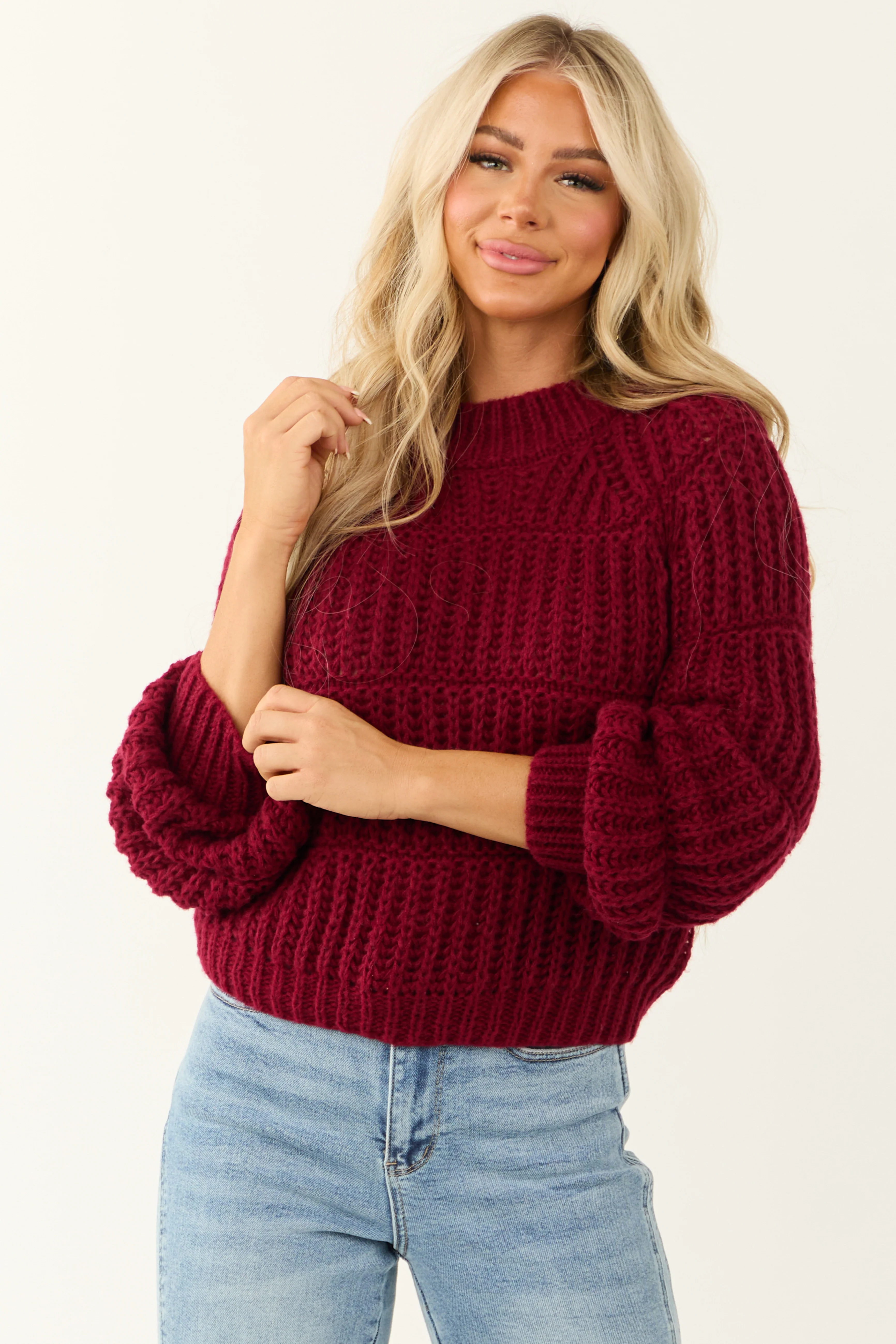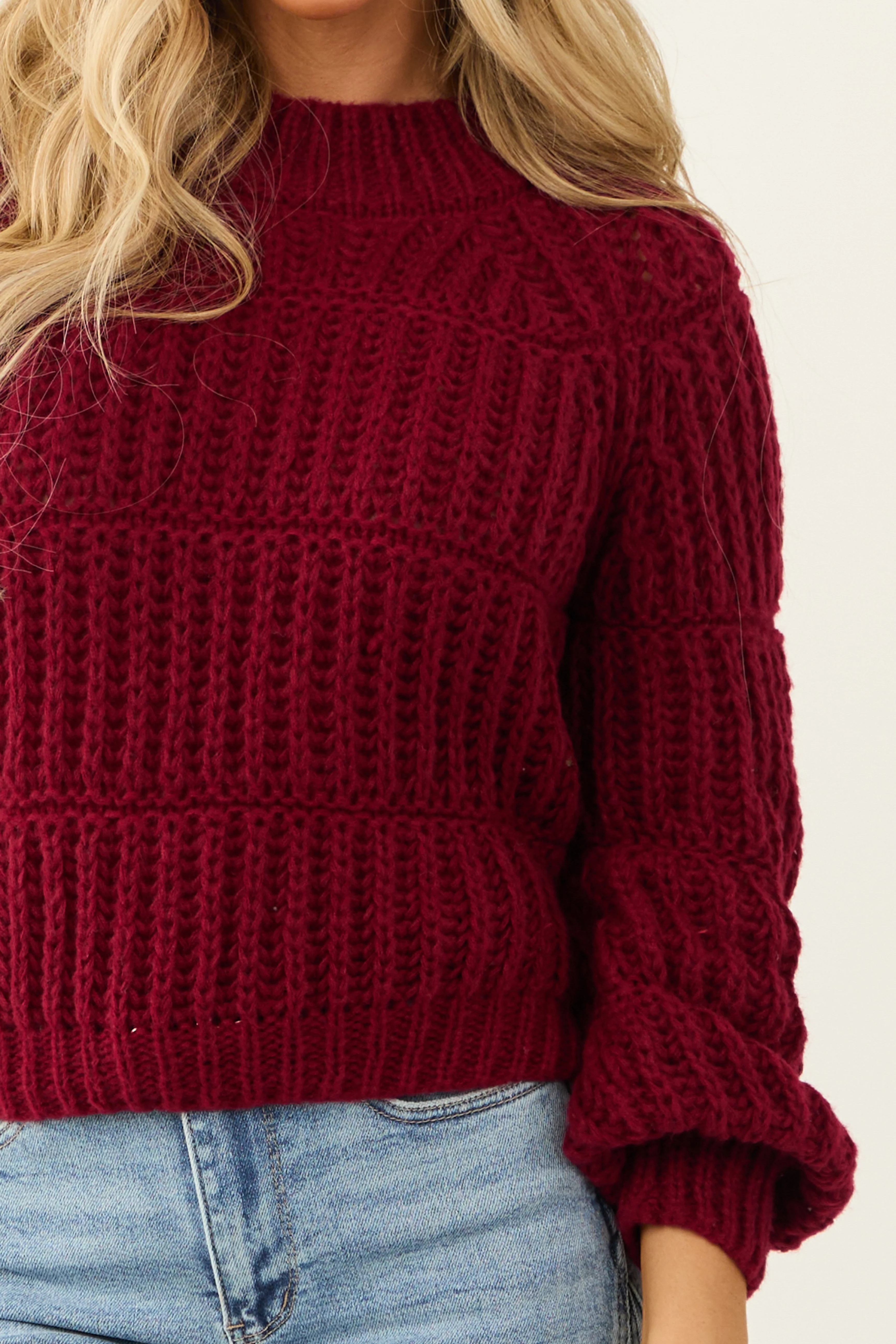 Wine Chunky Knit Mixed Weave Sweater