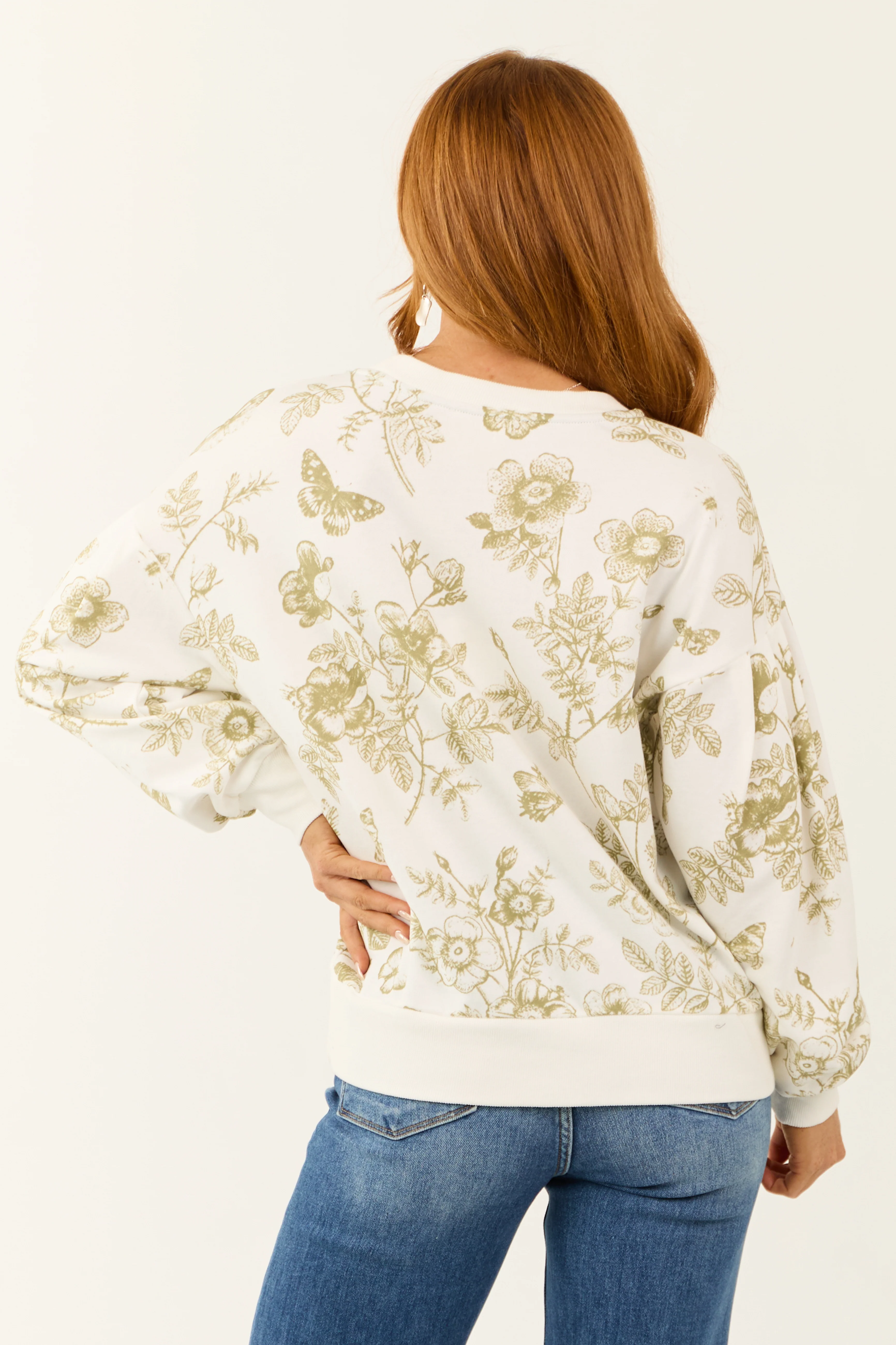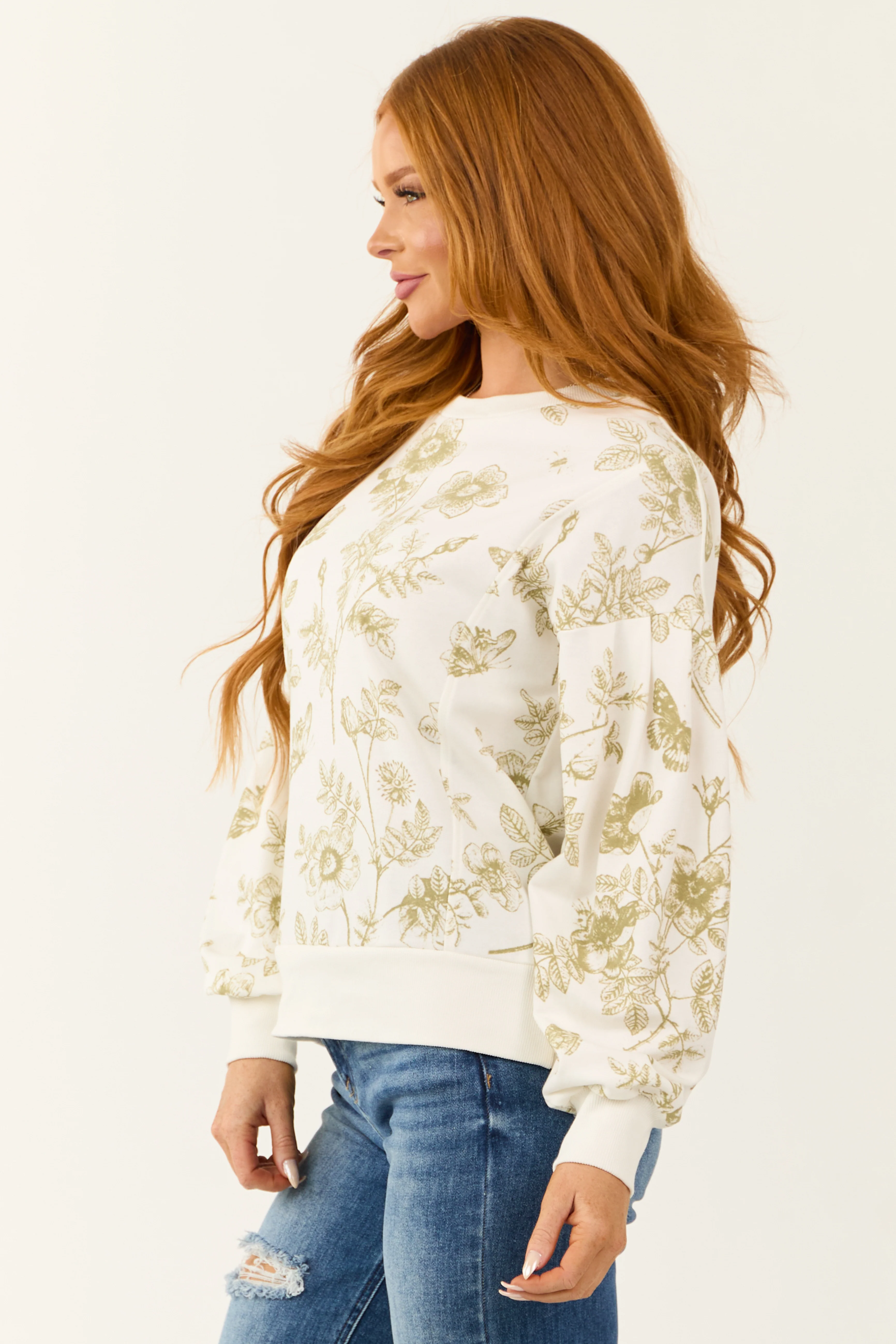 Ivory and Olive Floral Print Crew Neck Sweatshirt