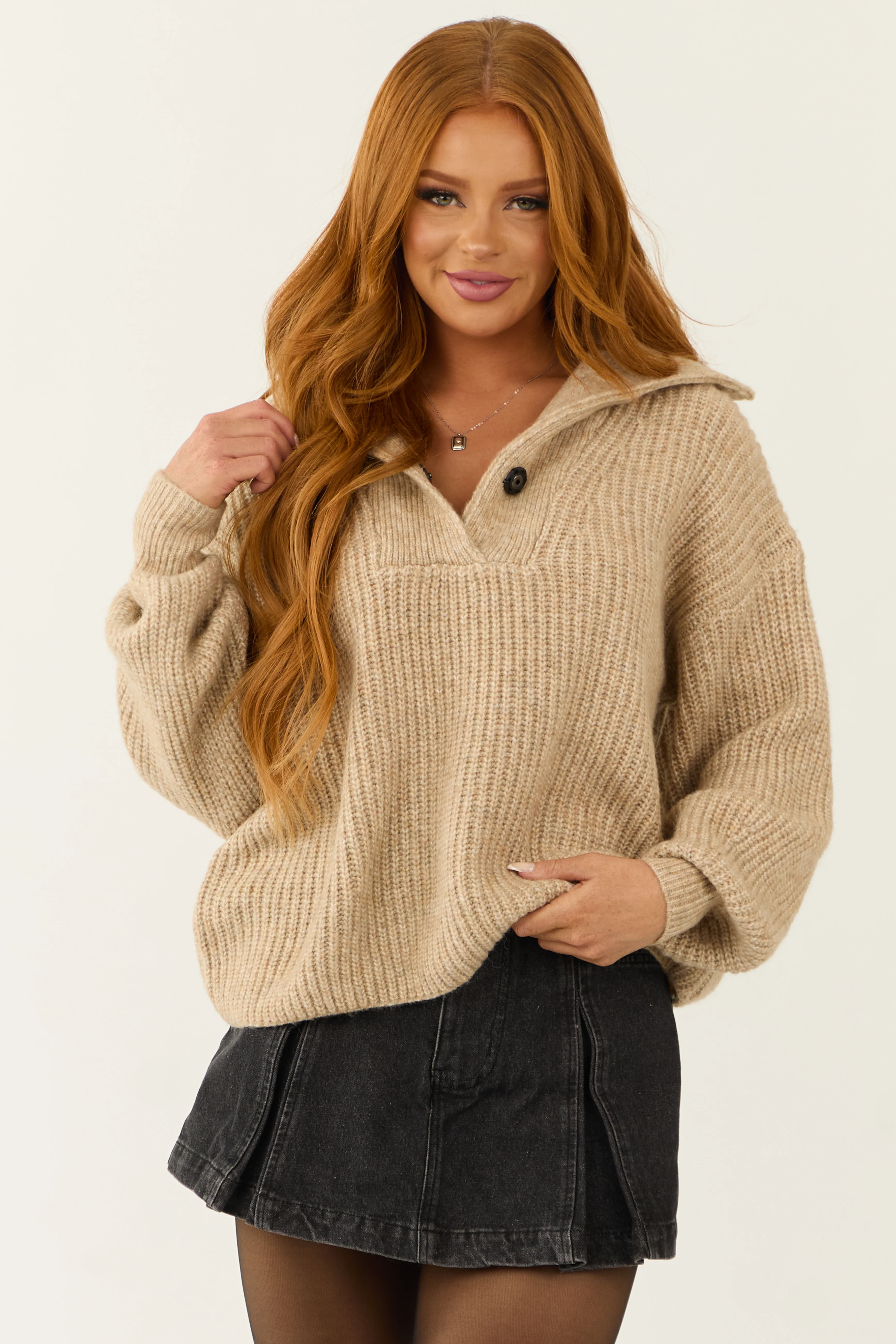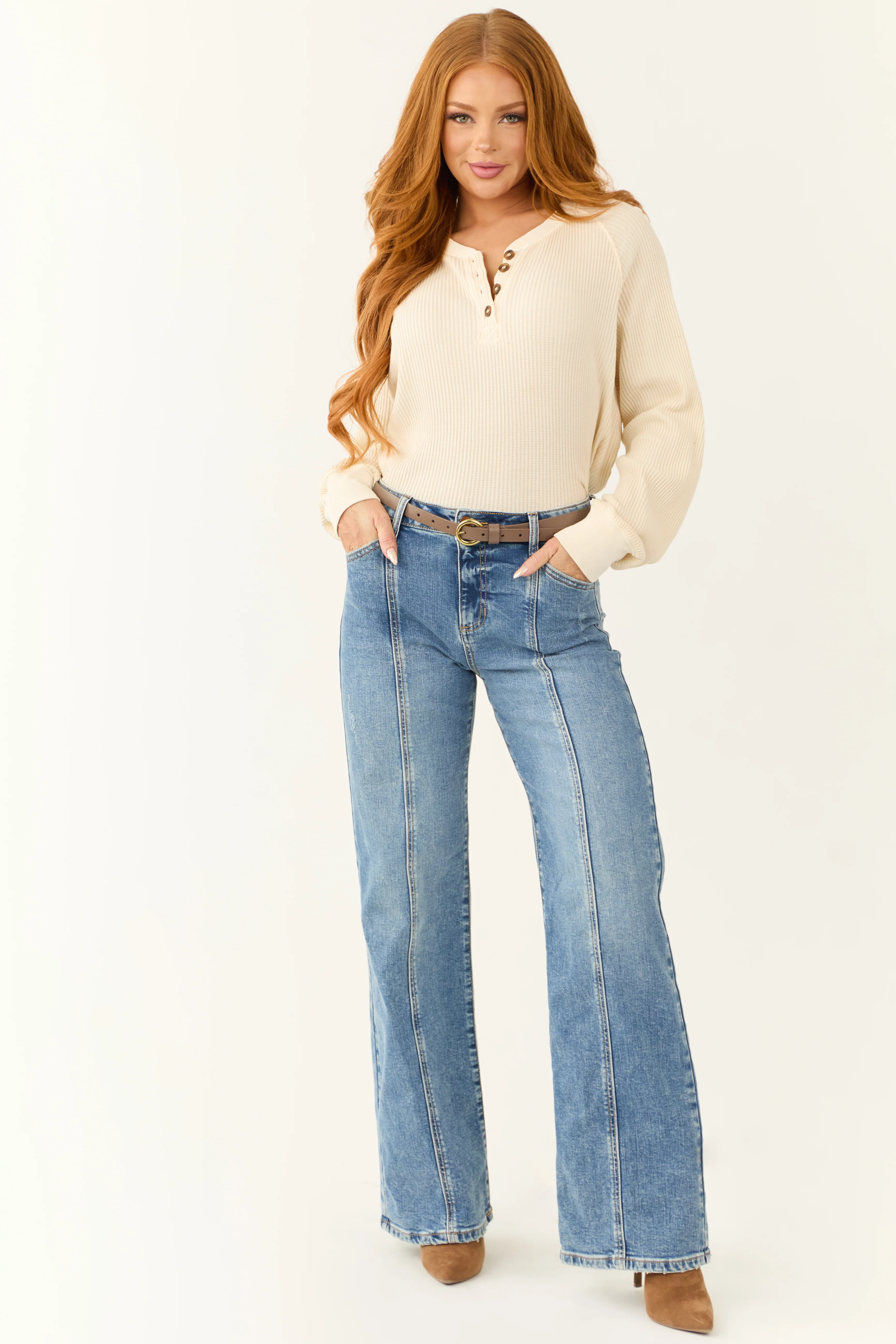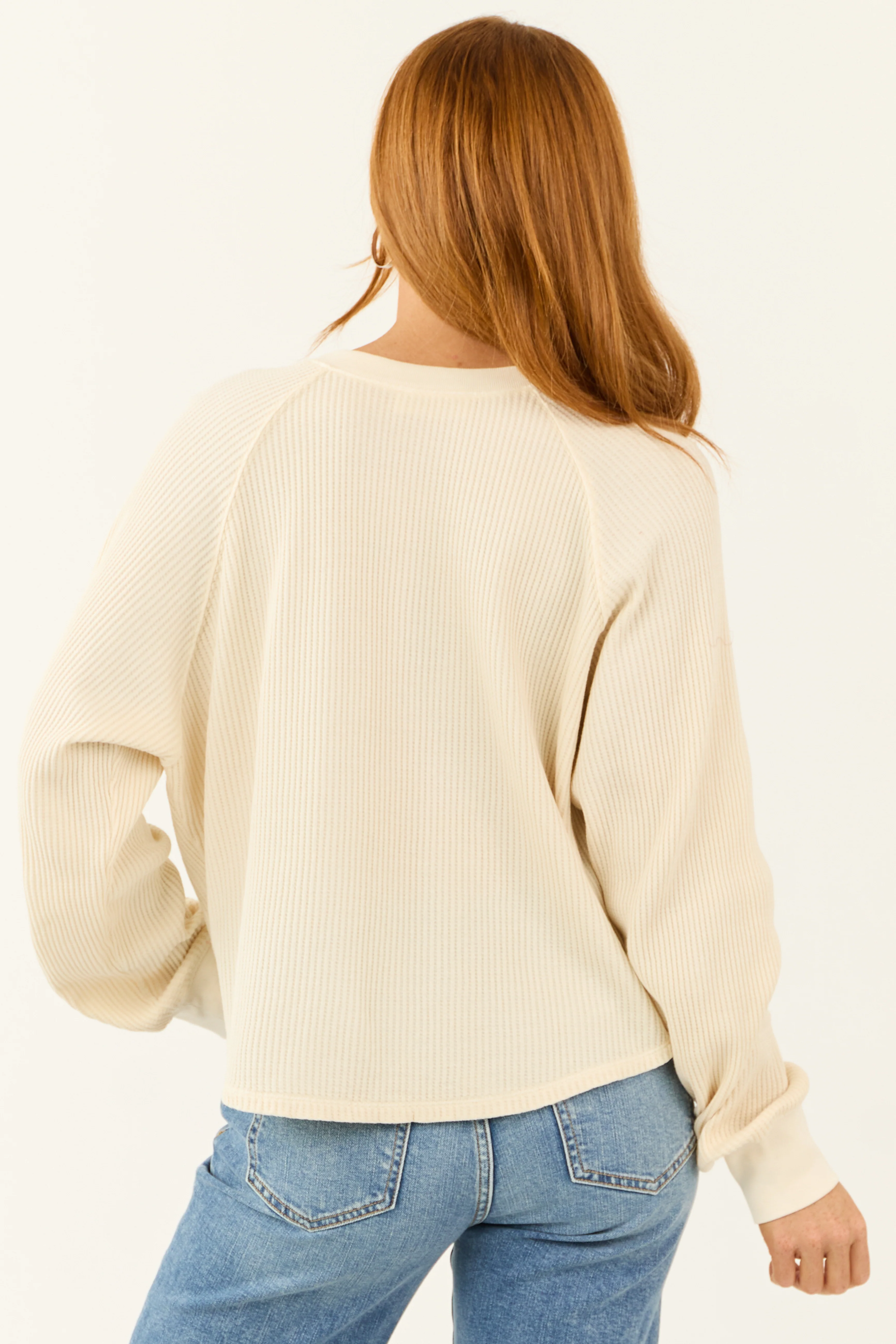 Cream Waffle Knit Half Button Long Sleeve Top