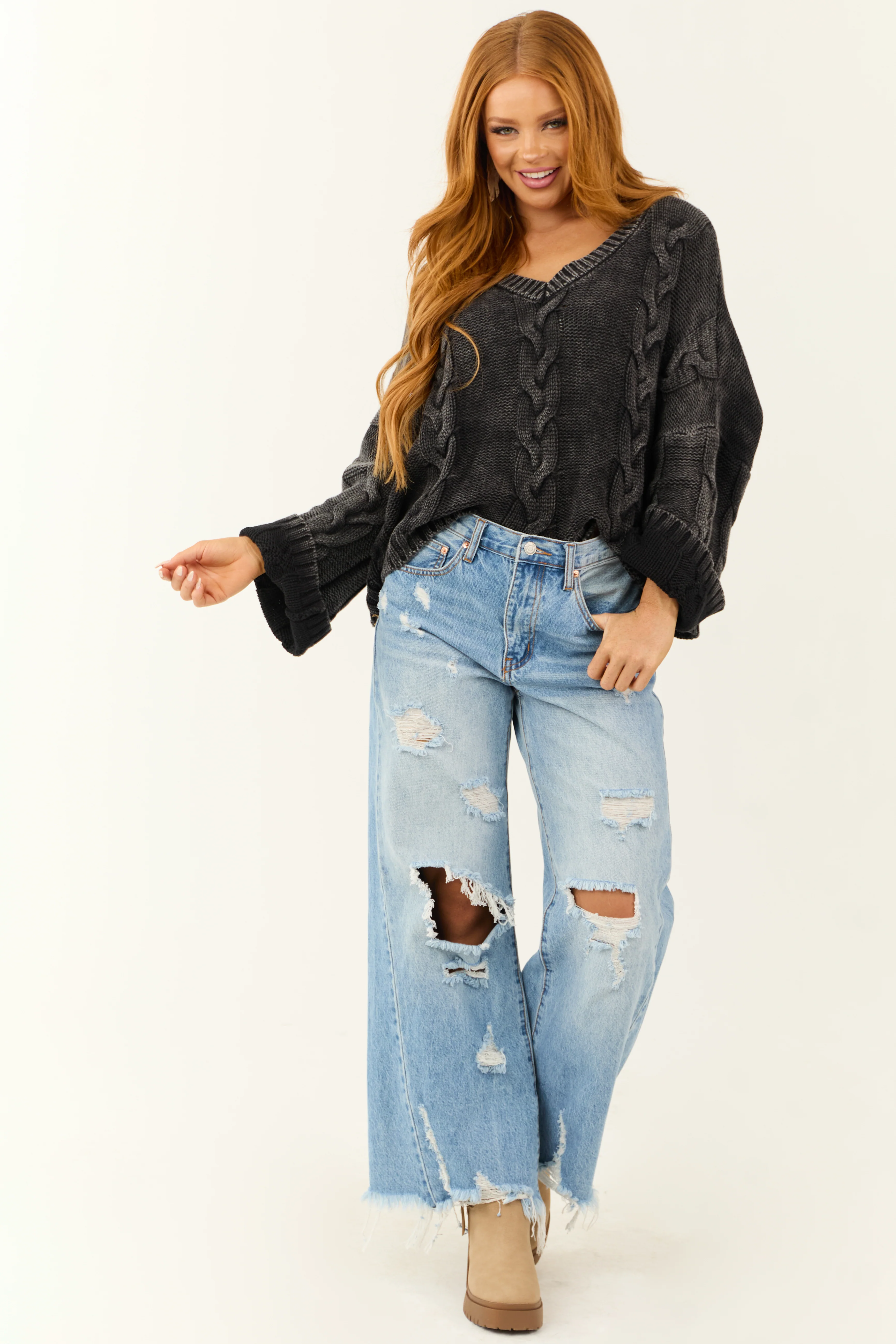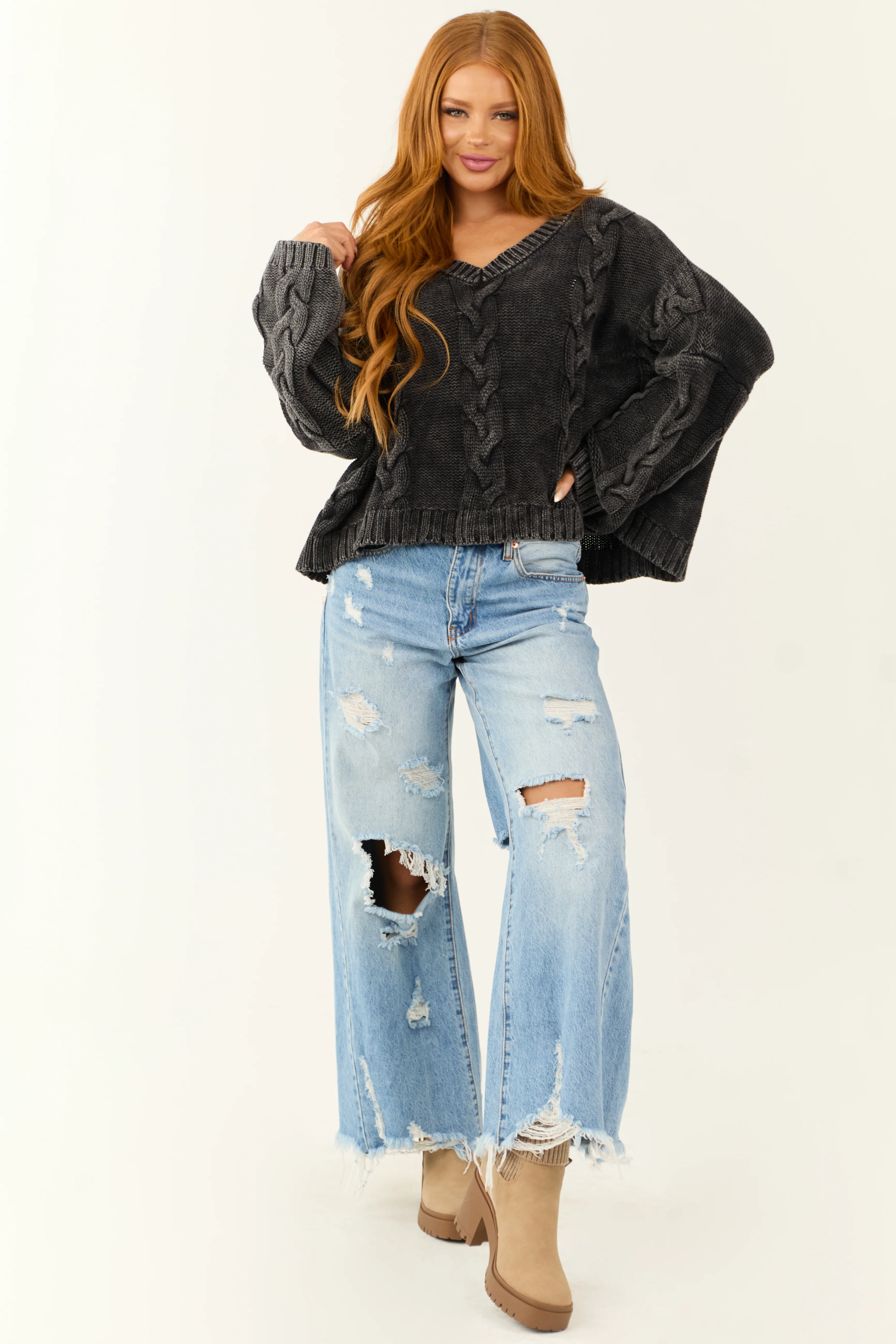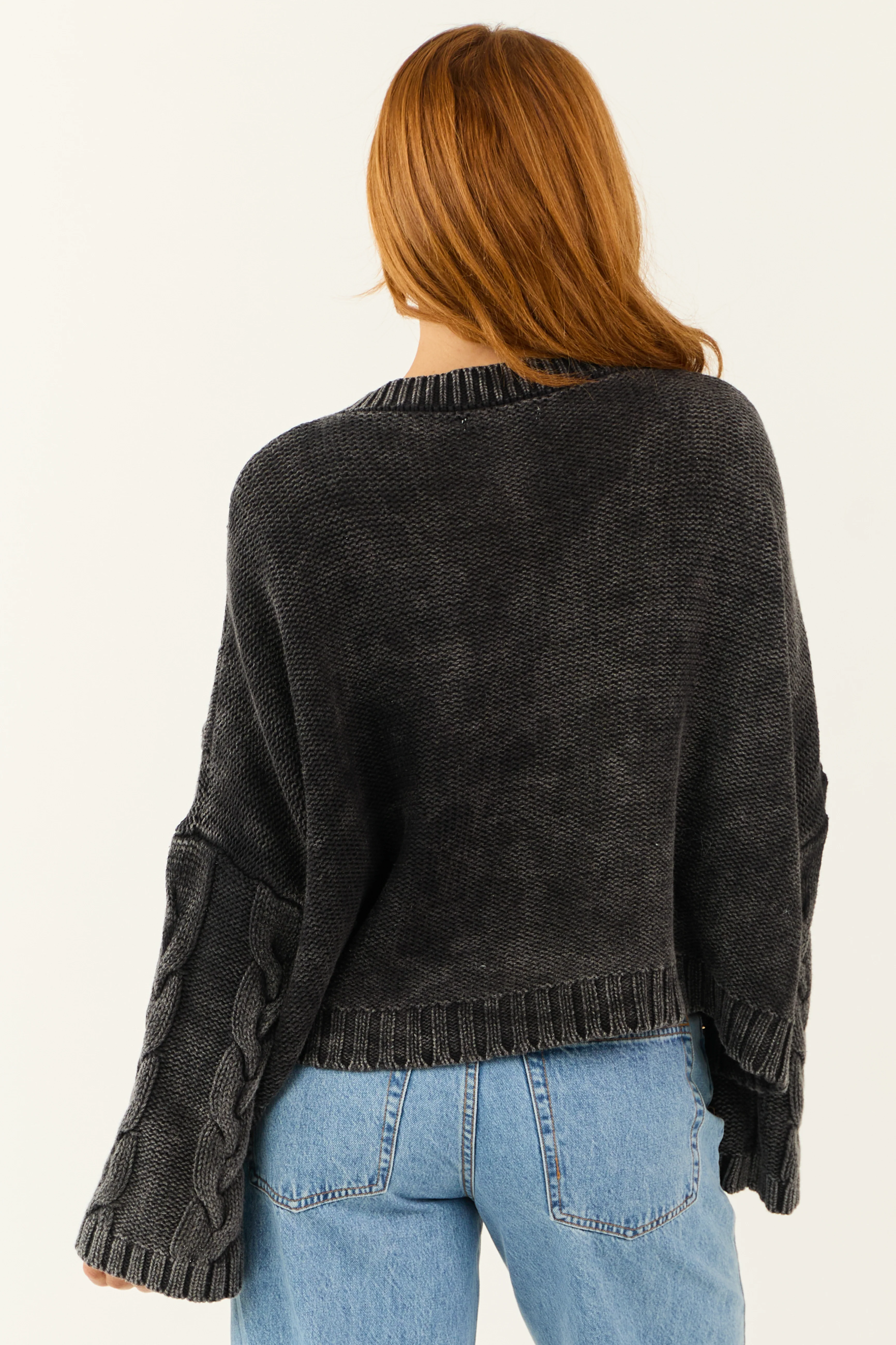 Charcoal Mineral Wash V Neck Cable Knit Sweater