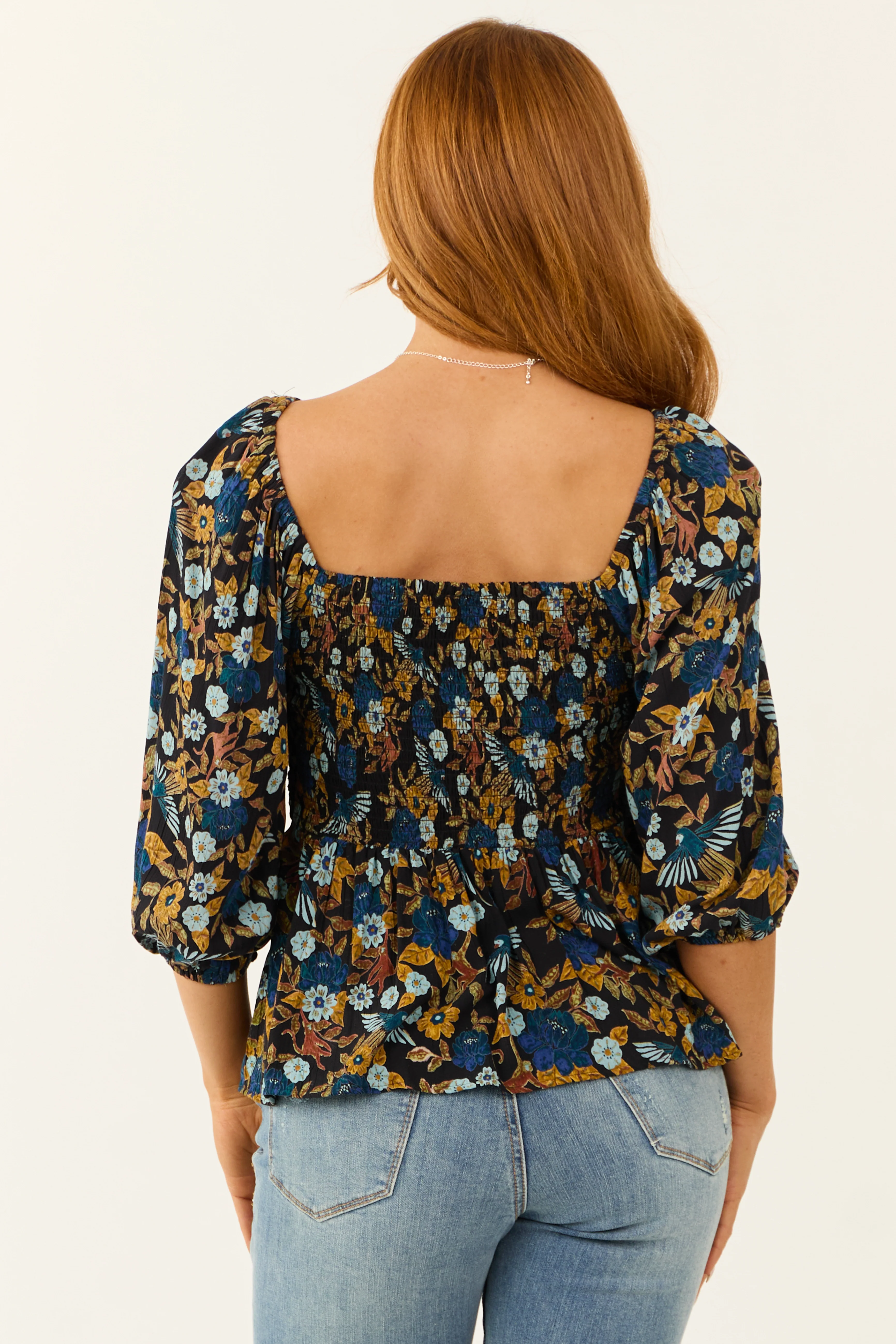 Cream Floral Print Long Sleeve Smocked Crop Top