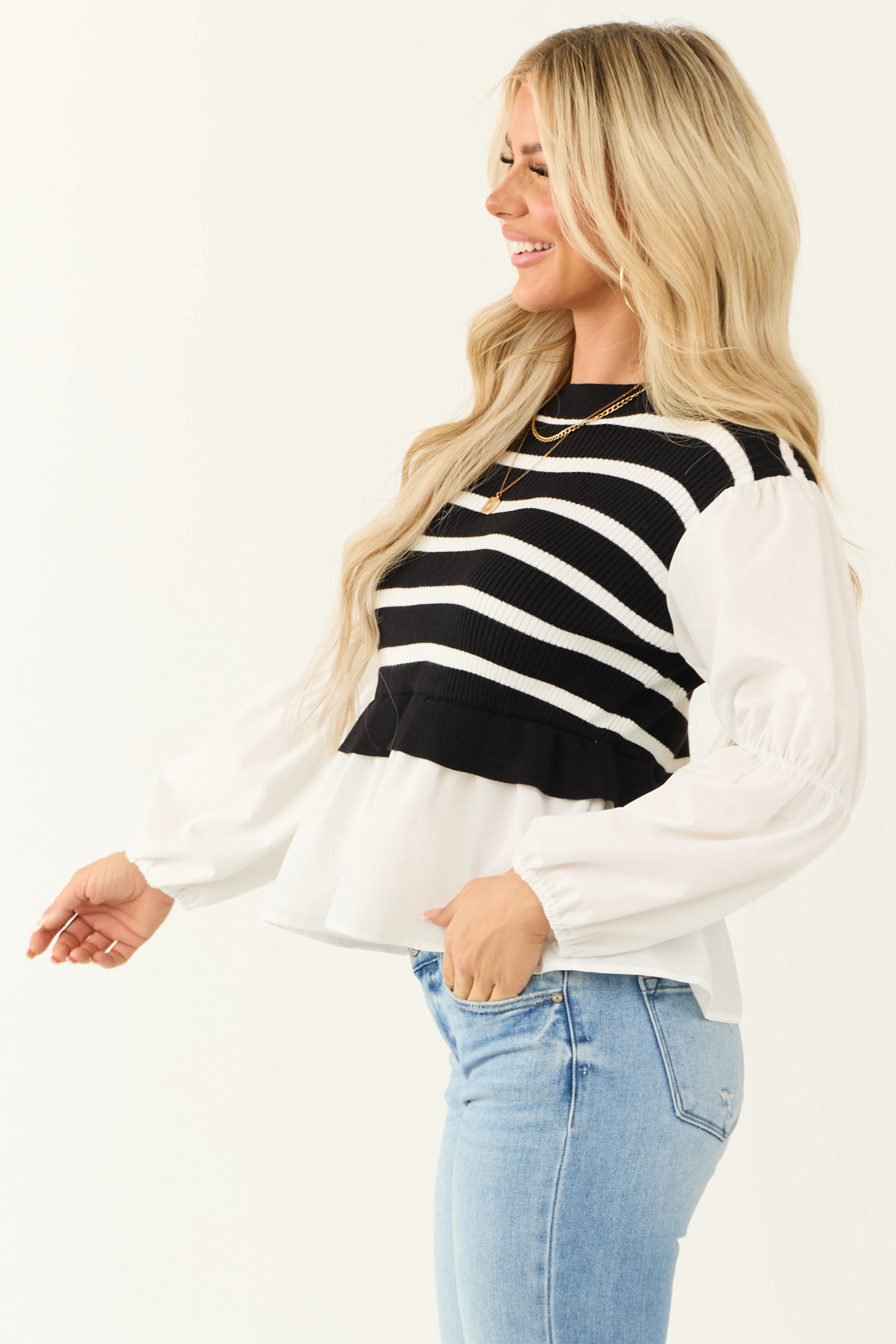 Black and Cream Striped Mock Neck Sweater