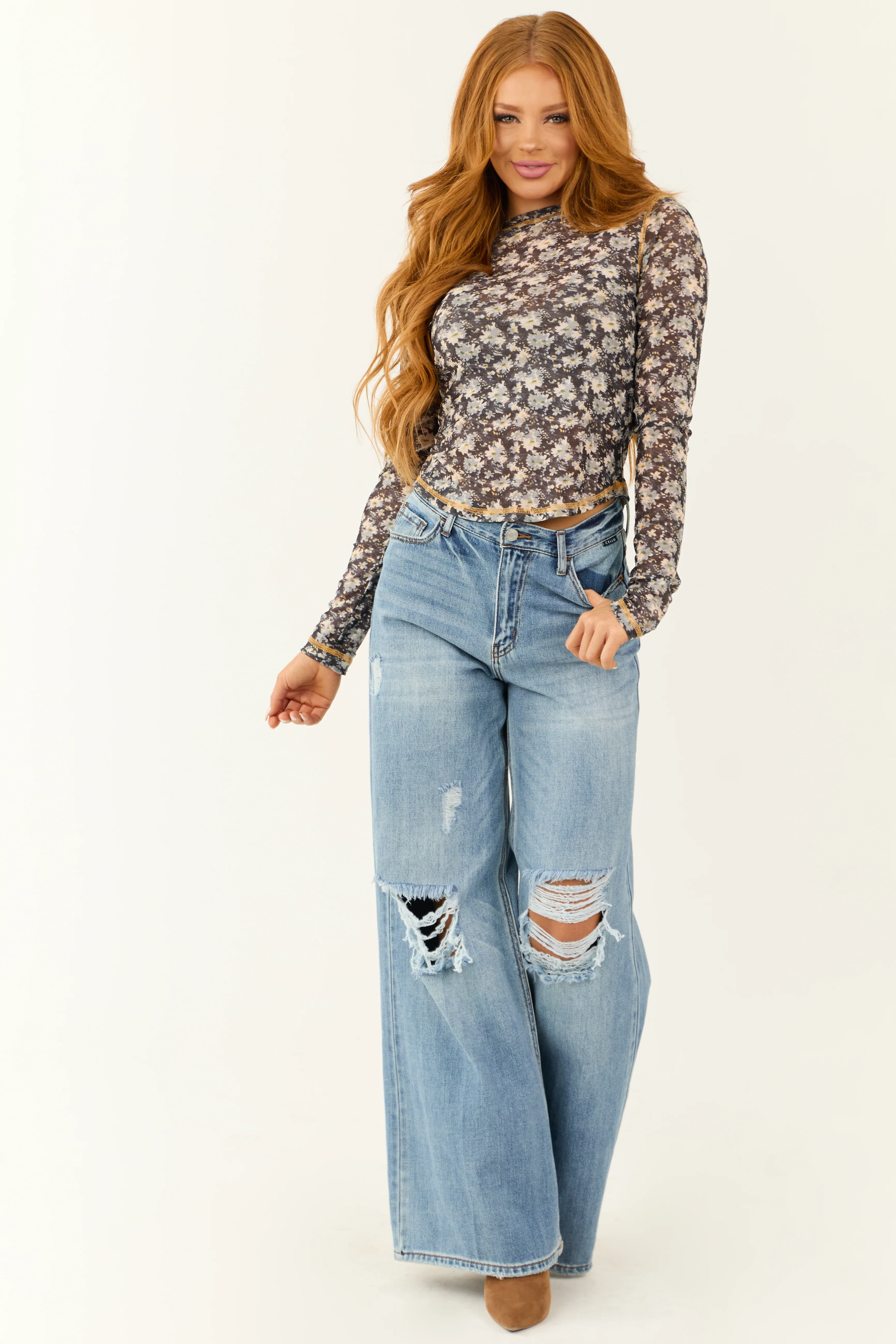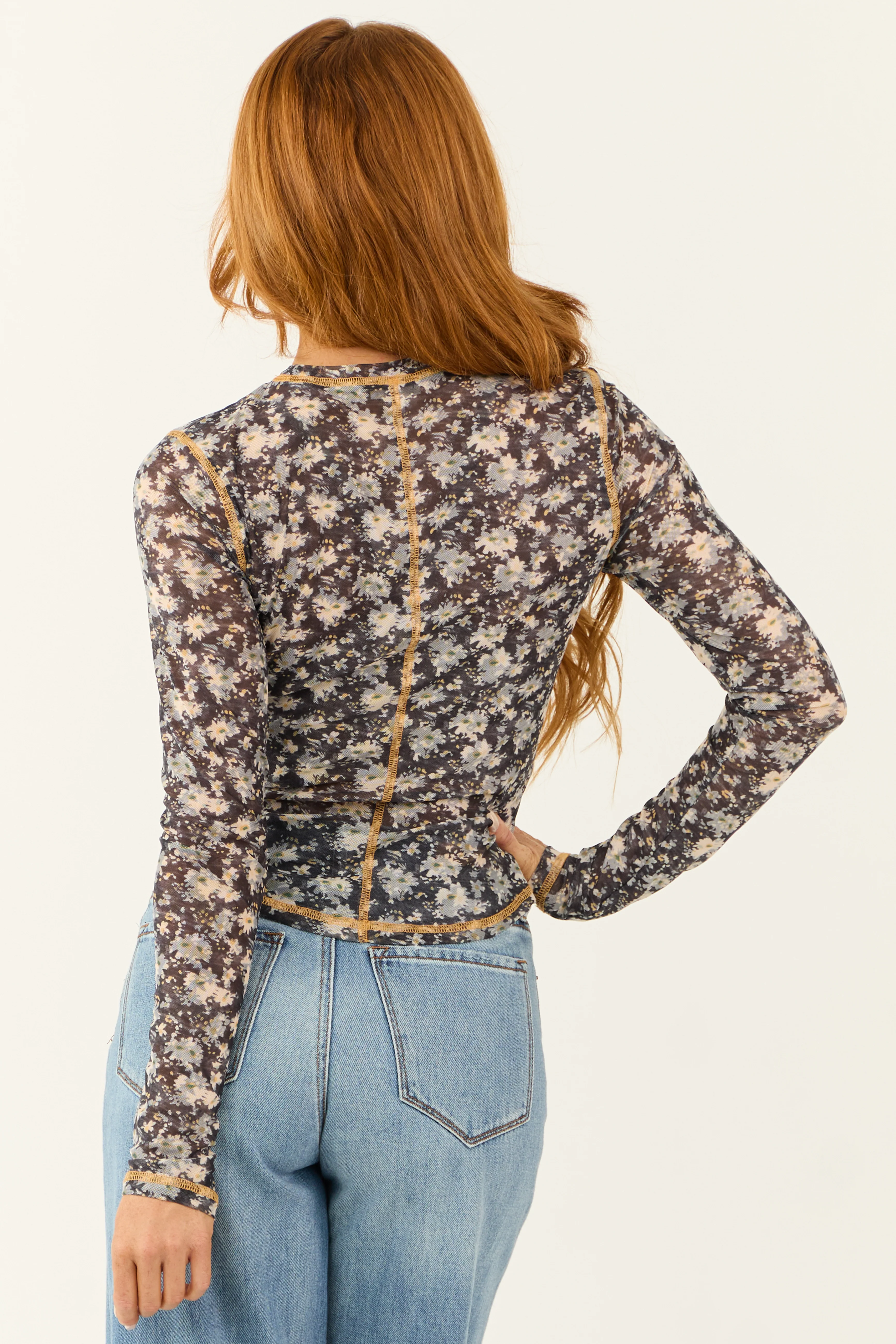Black Floral Print Long Sleeve Mesh Top
