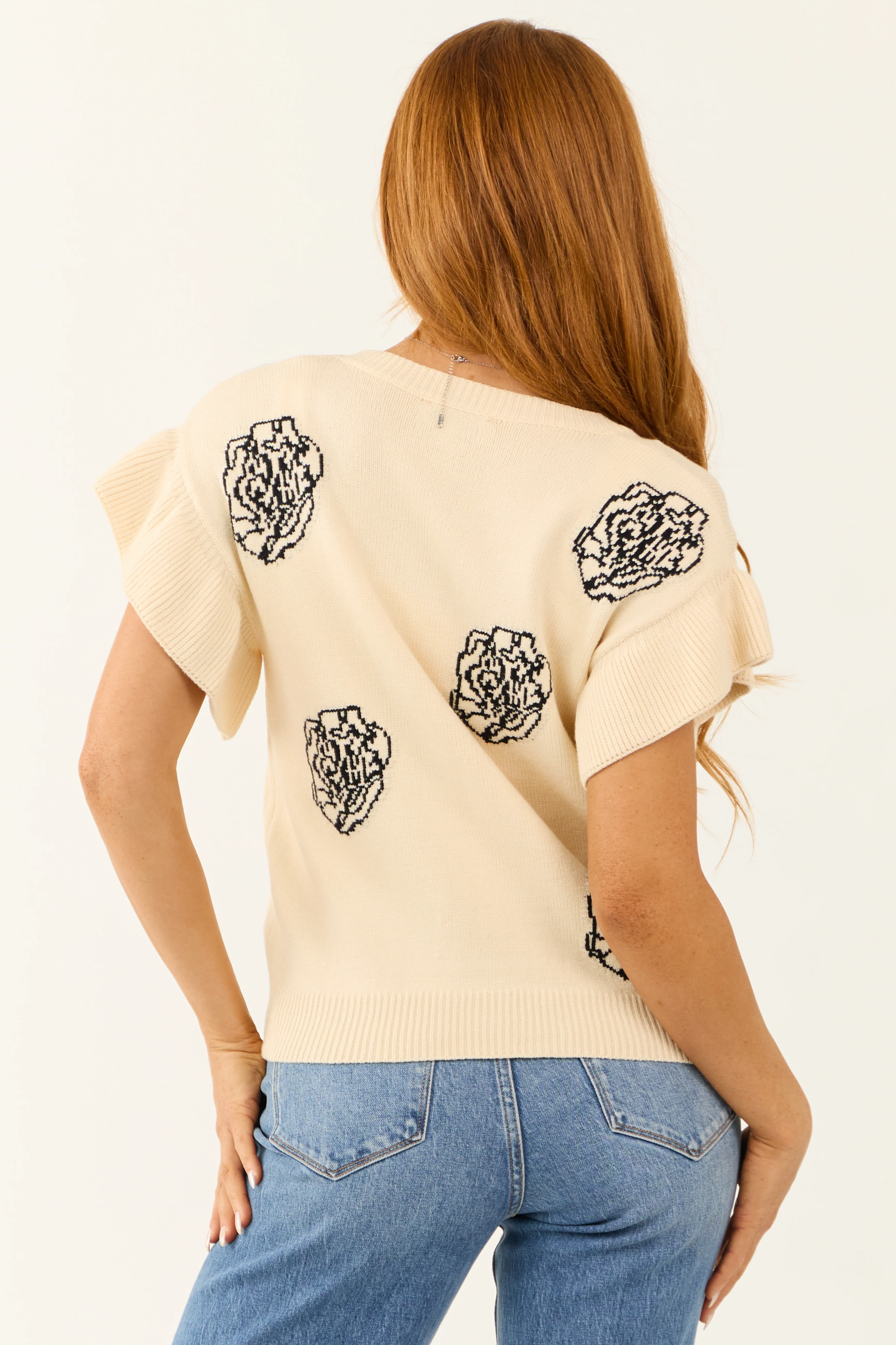 Cream Rose Print Short Ruffle Sleeve Sweater Top