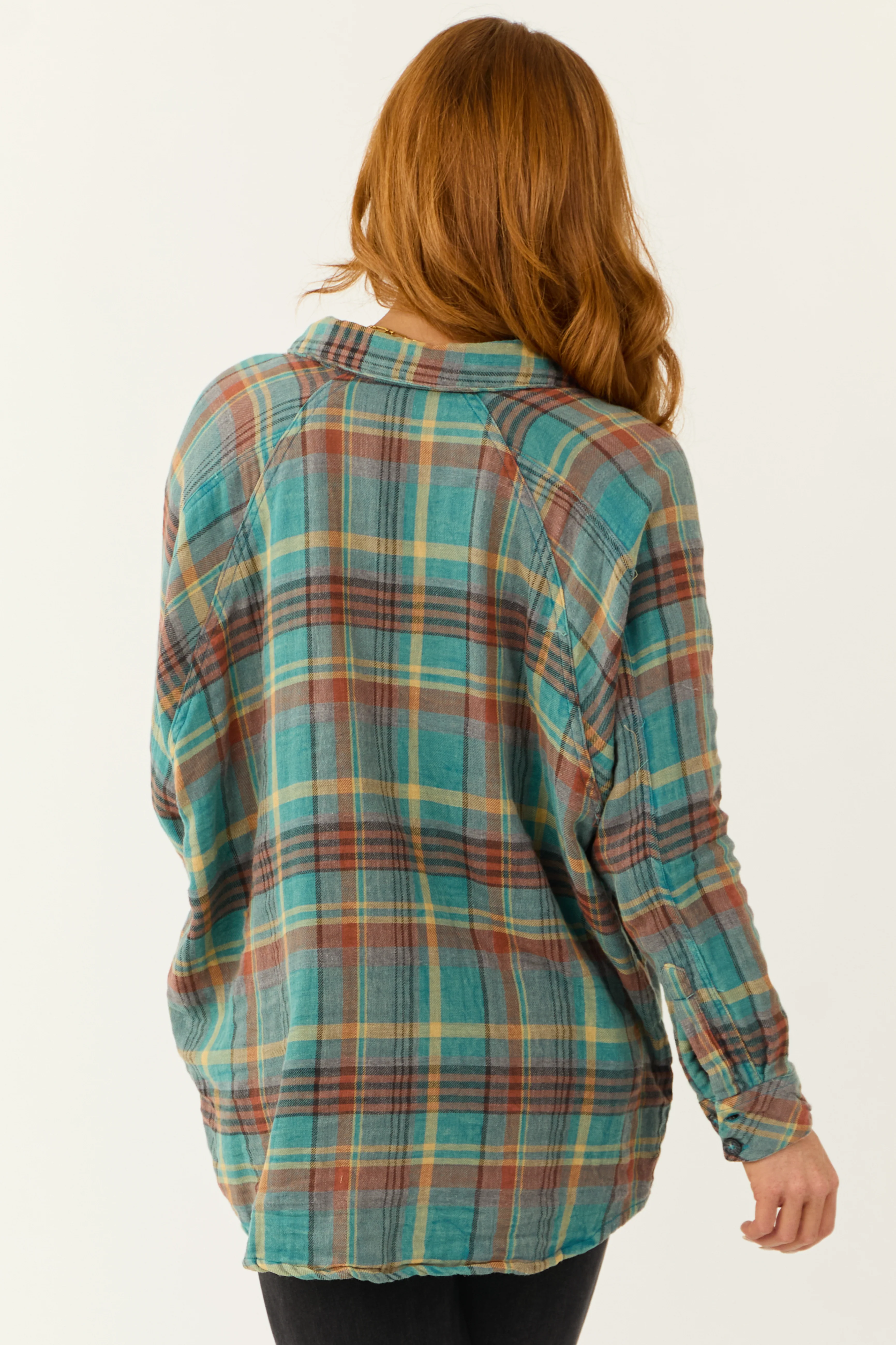 Teal Plaid Button Up Long Sleeve Flannel Shirt