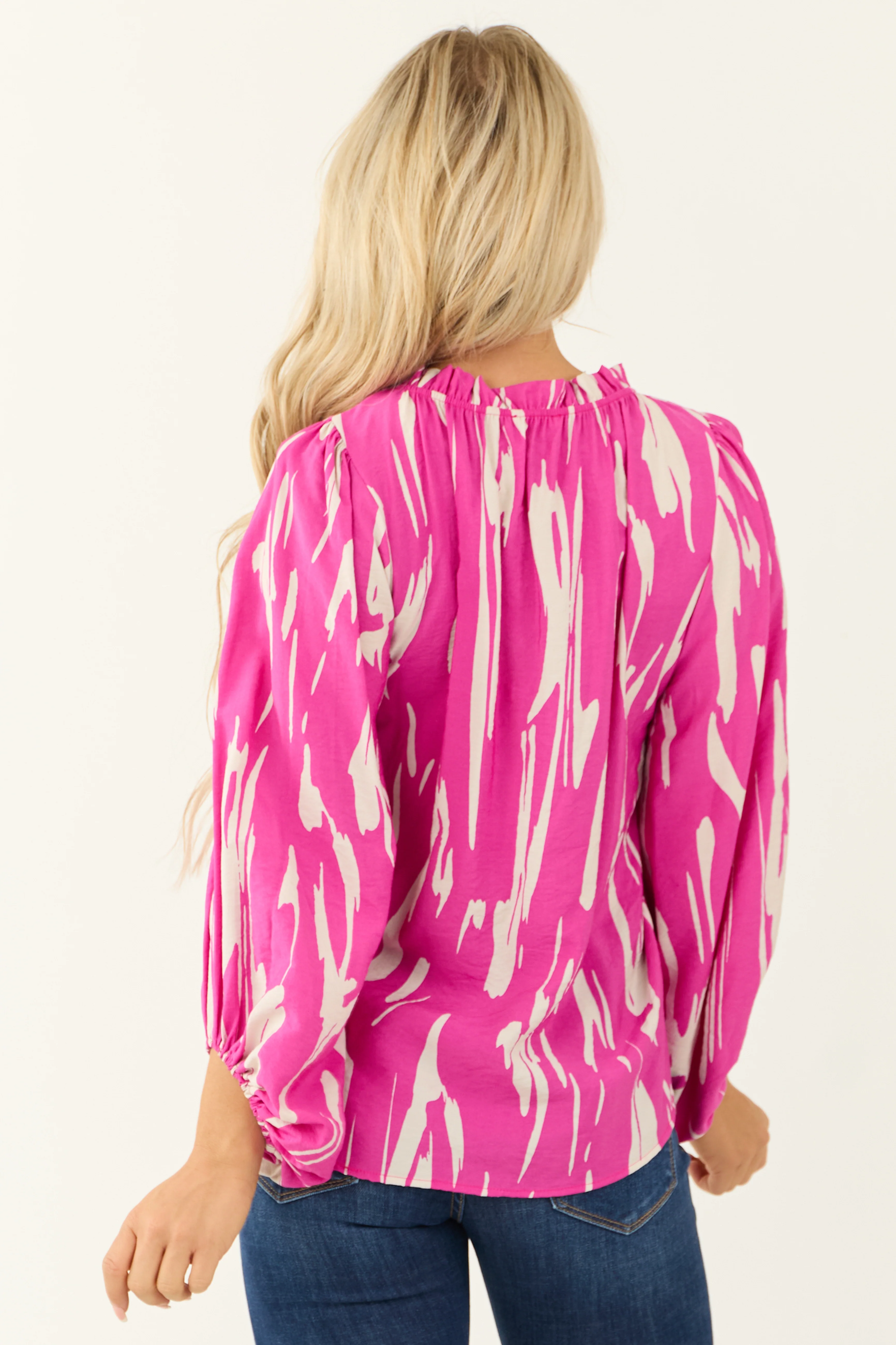 Fuchsia Abstract Print Long Puff Sleeve Top