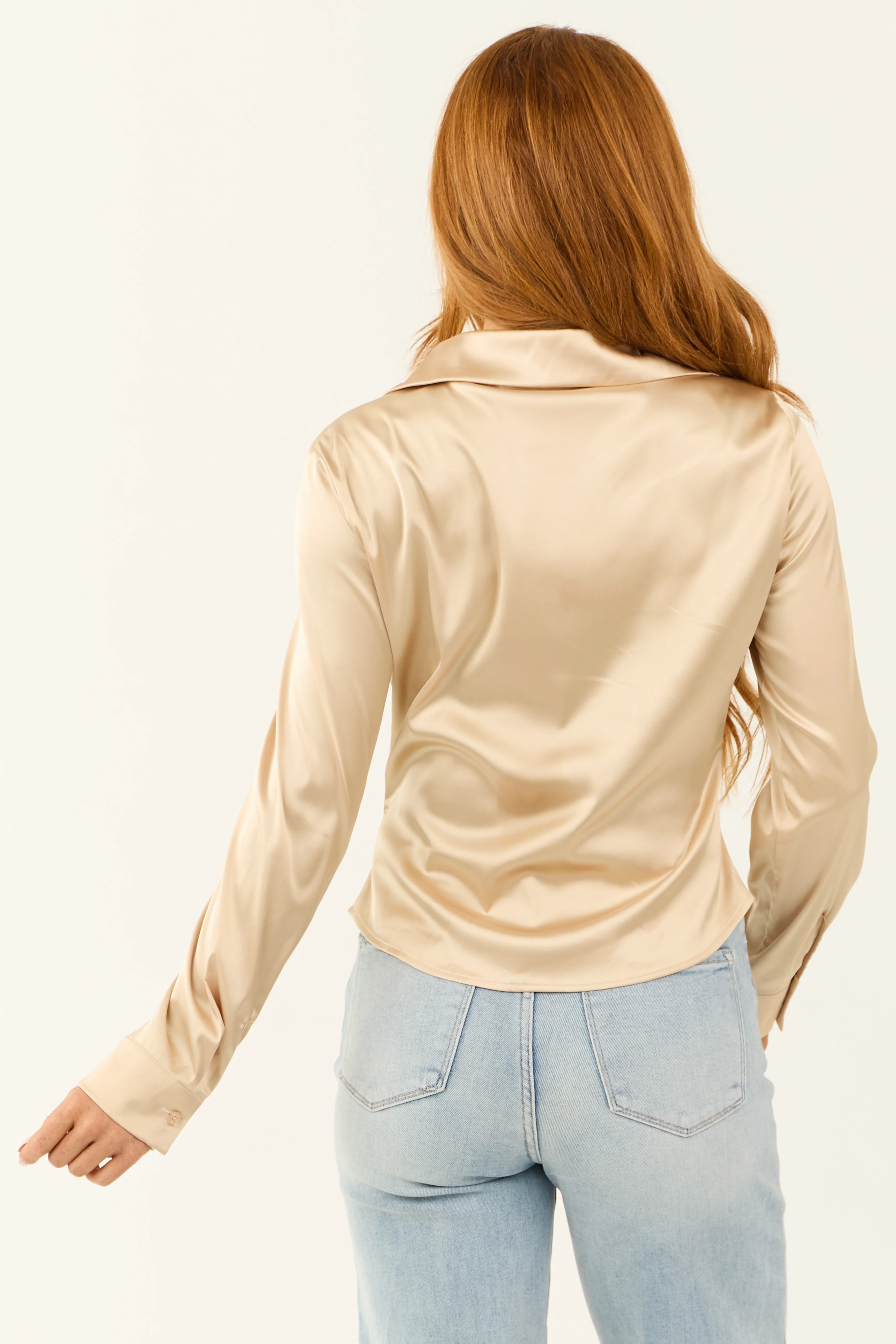 Beige Satin Long Sleeve Ruched Blouse