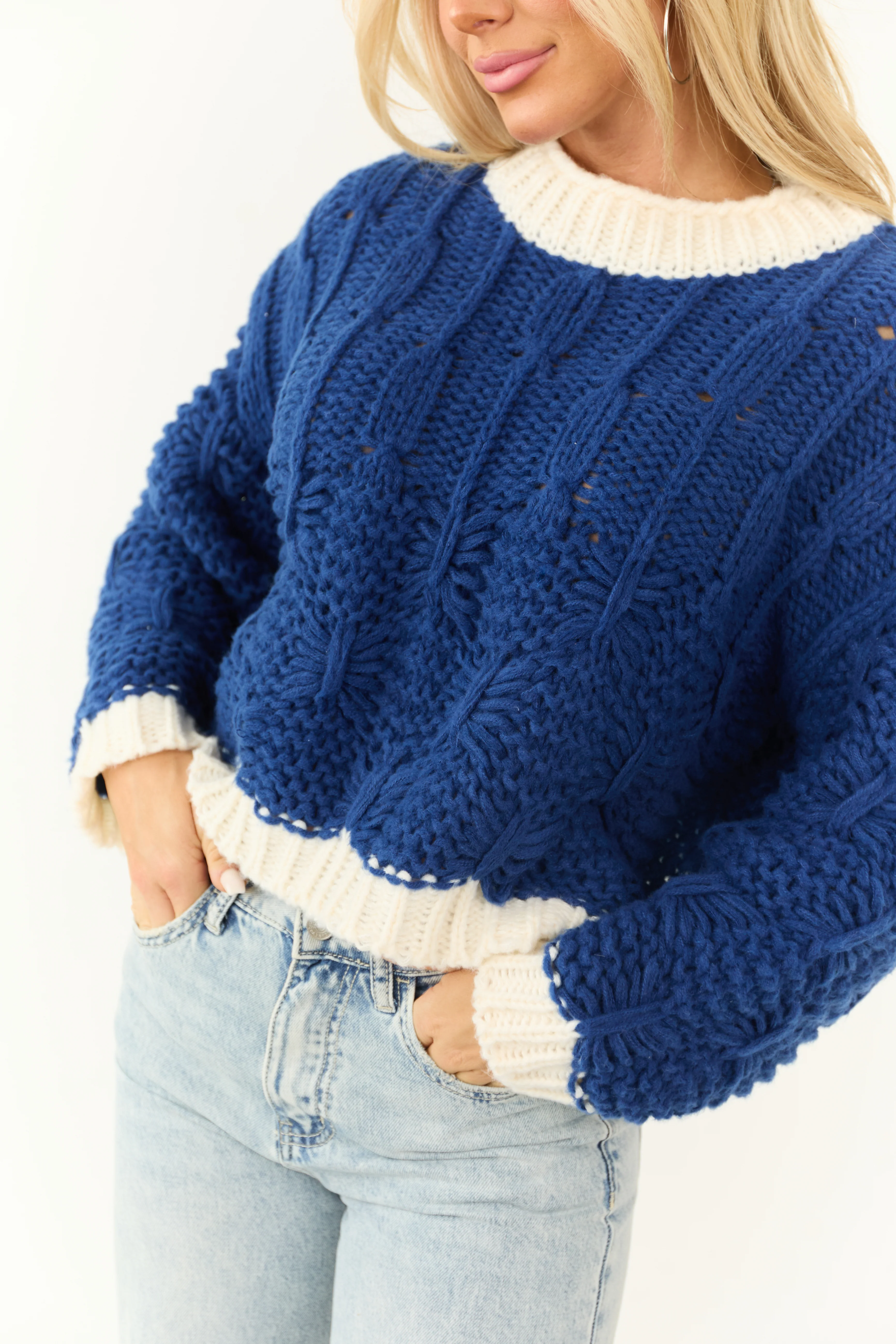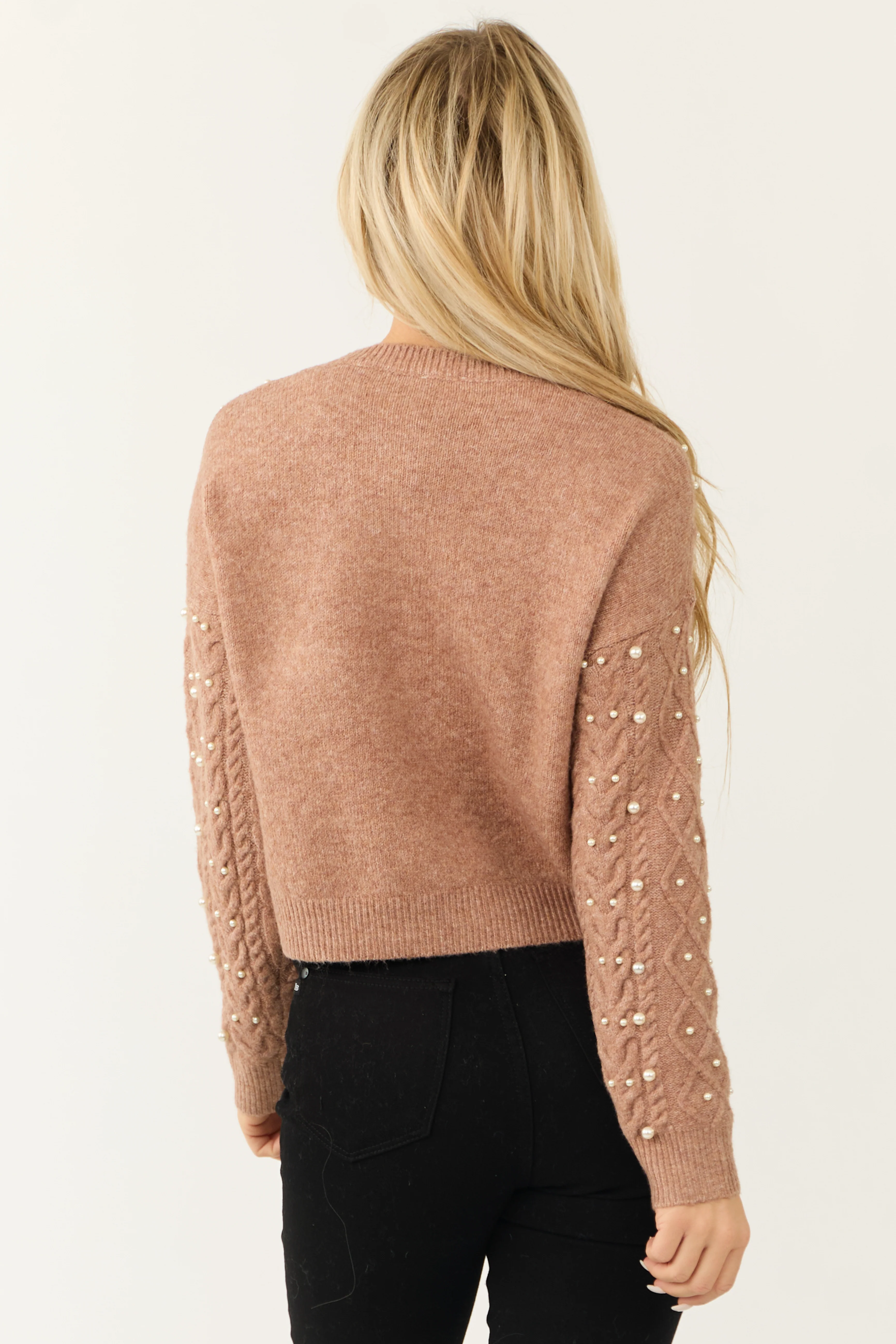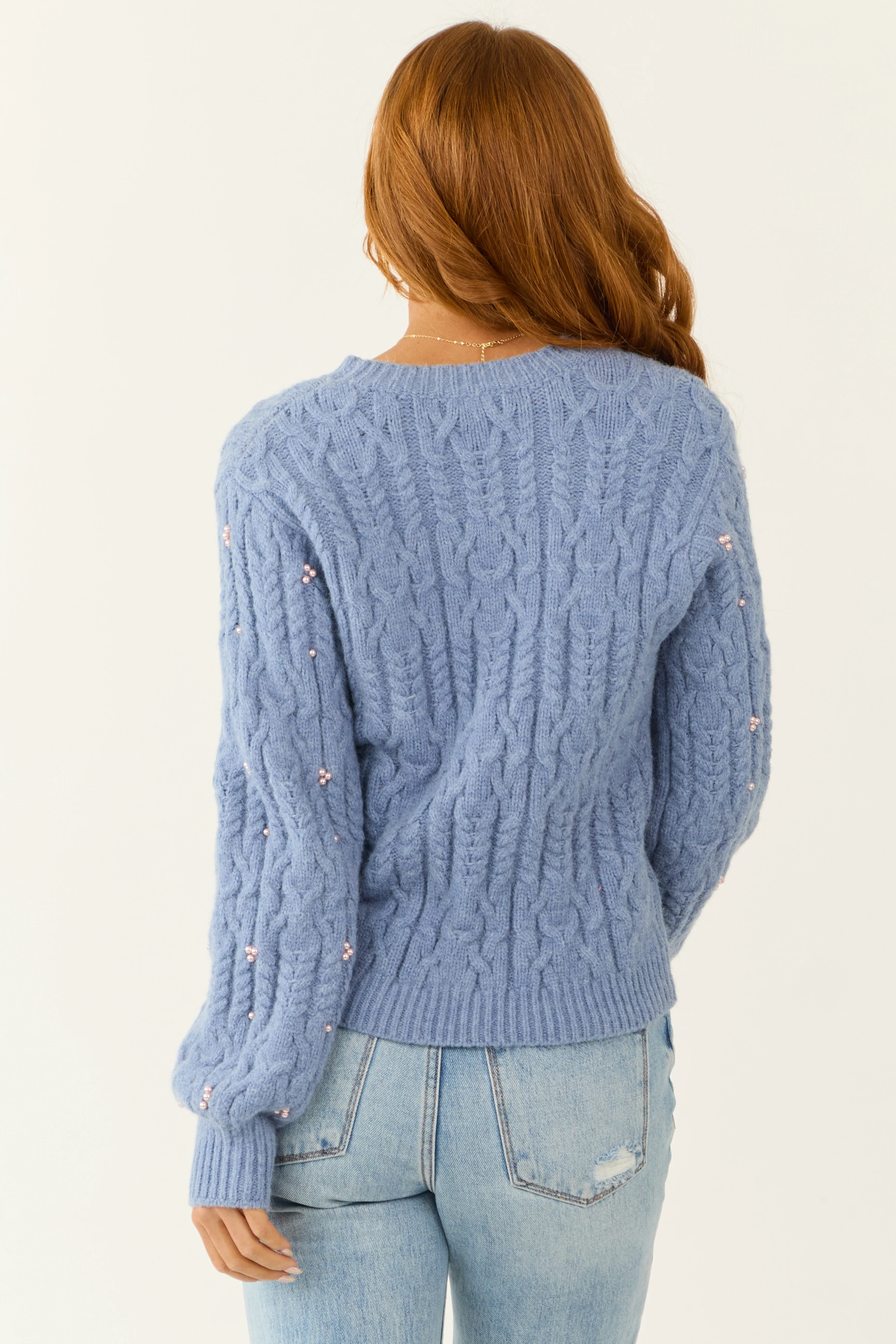 Dusty Blue Pearl Detailed Cable Knit Sweater