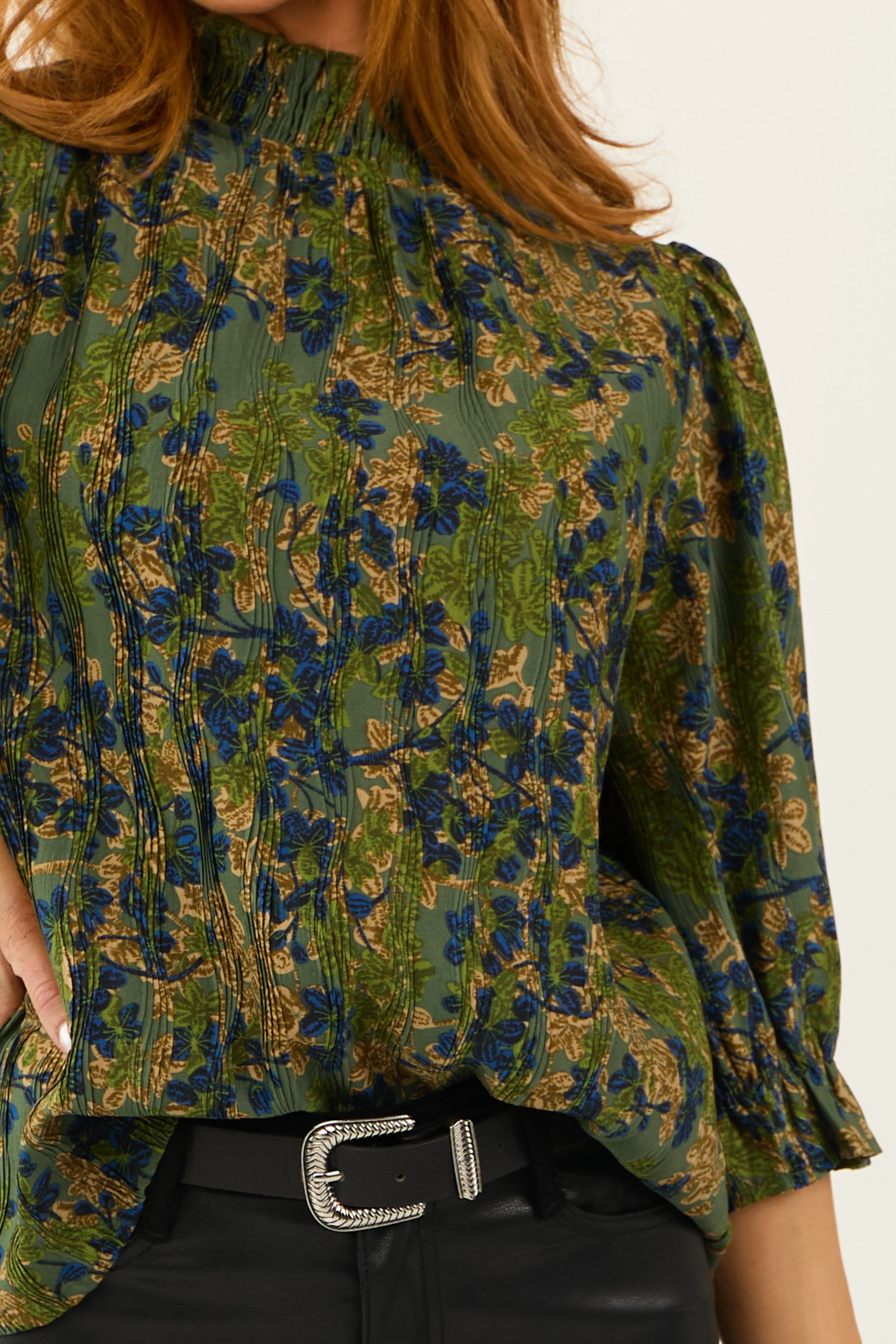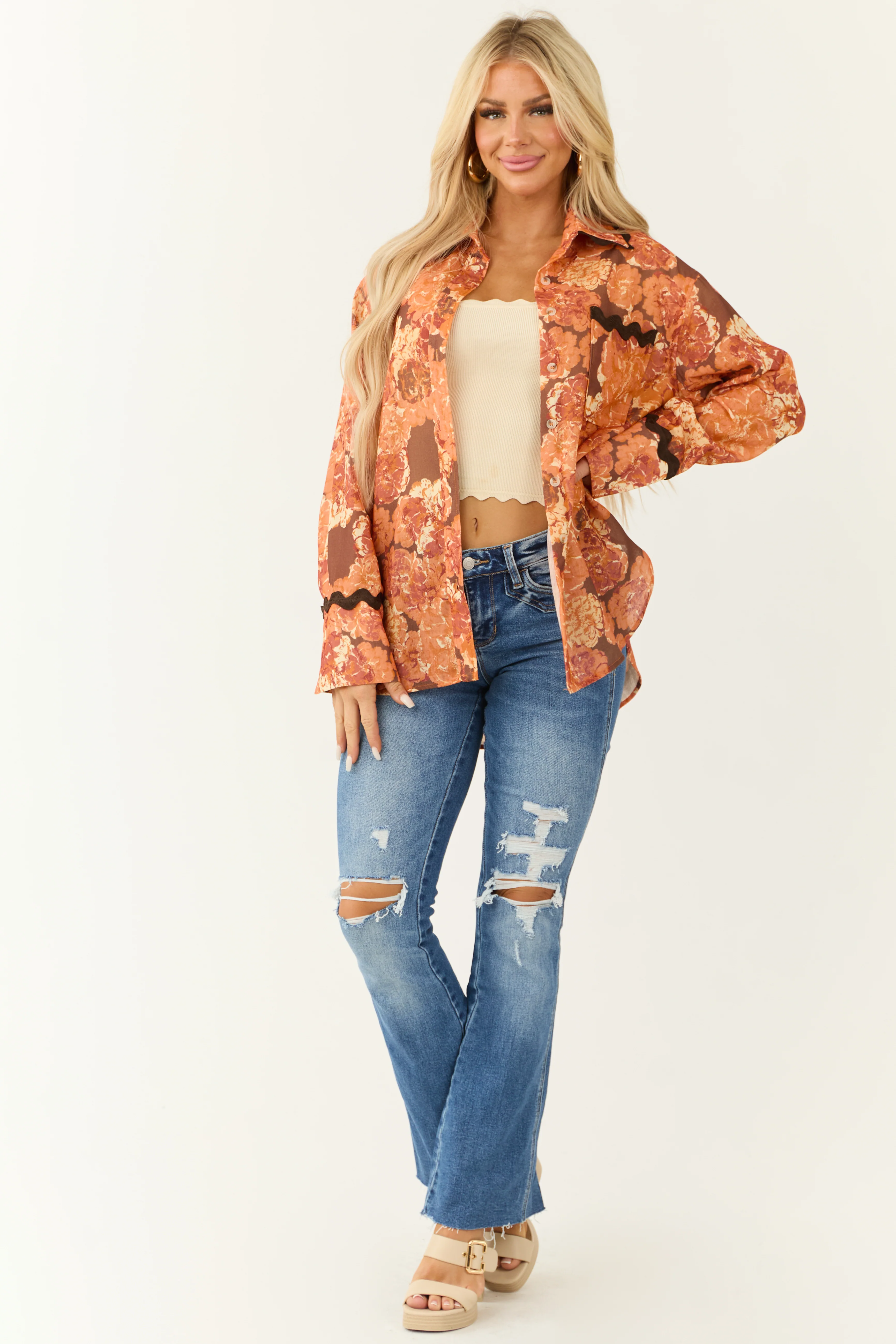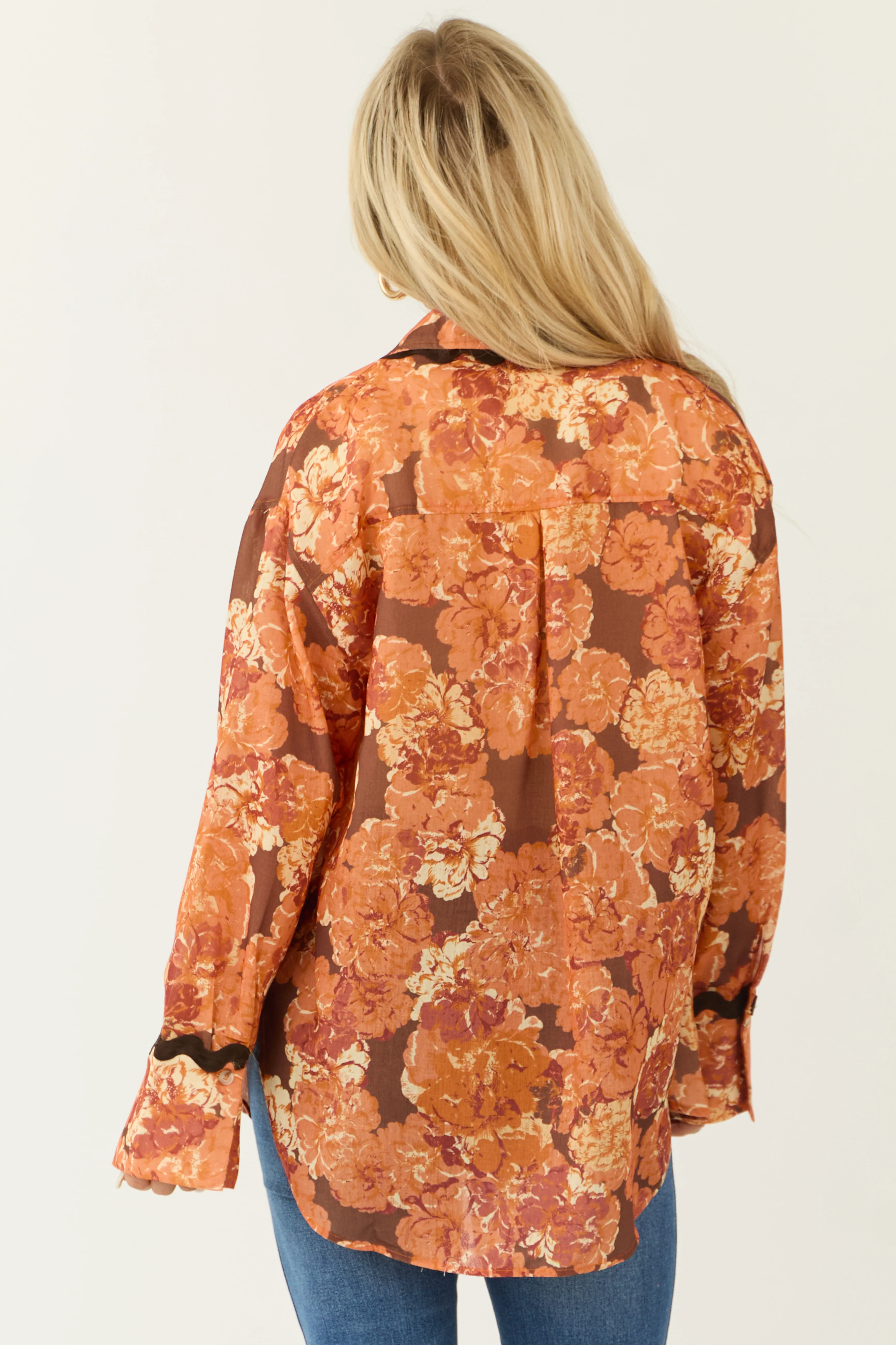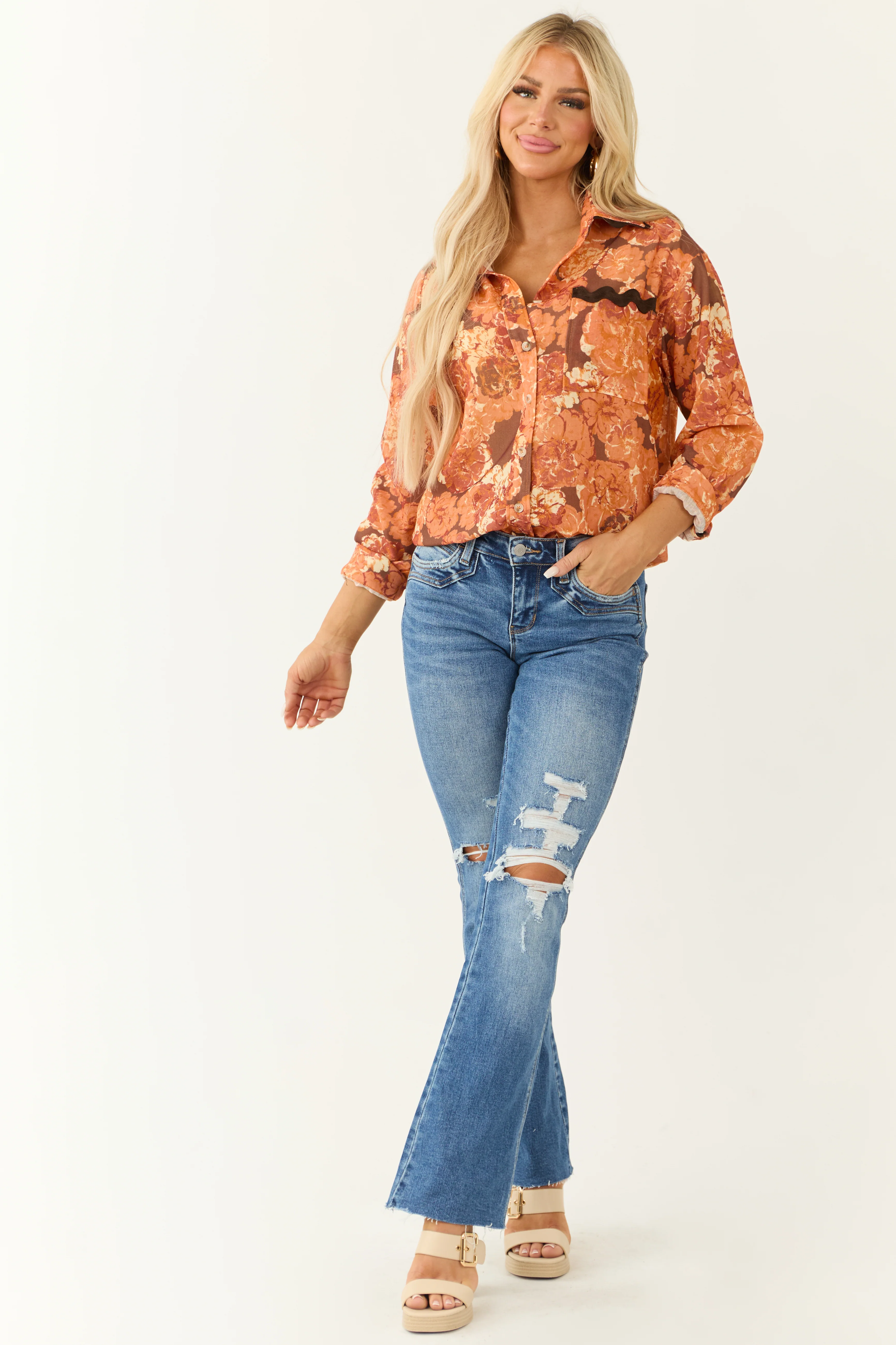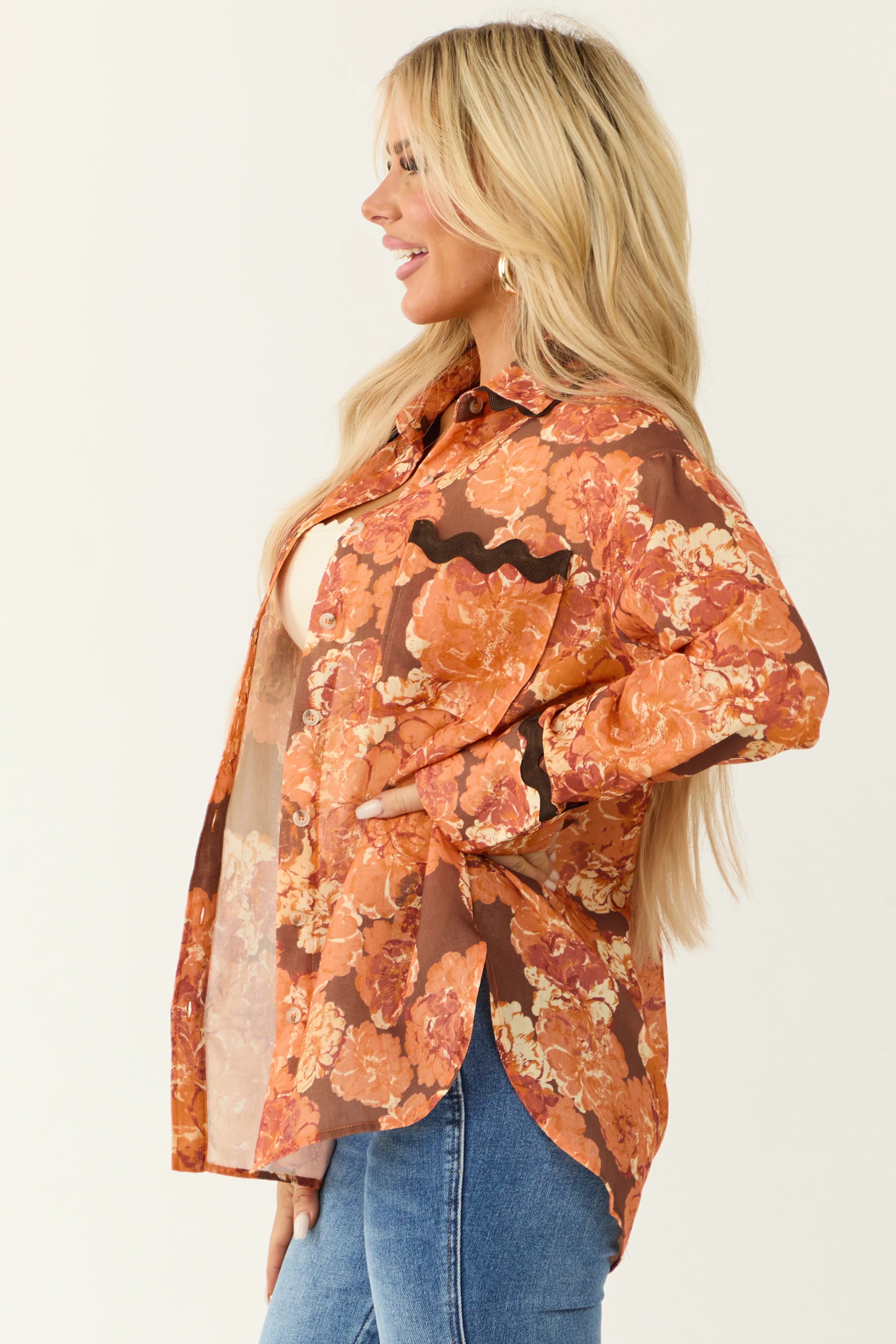 Tangerine Embroidery Trim Floral Pocket Blouse