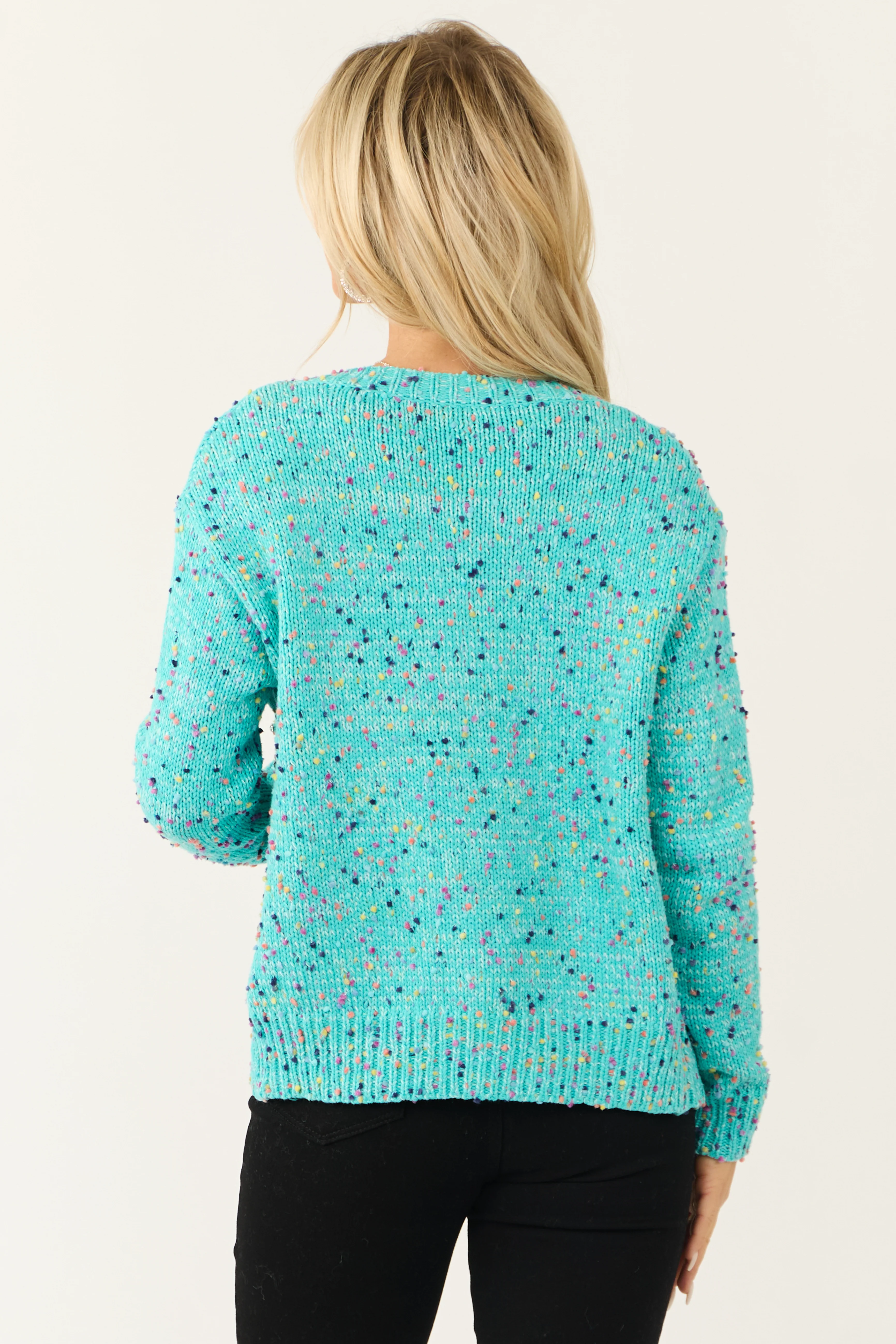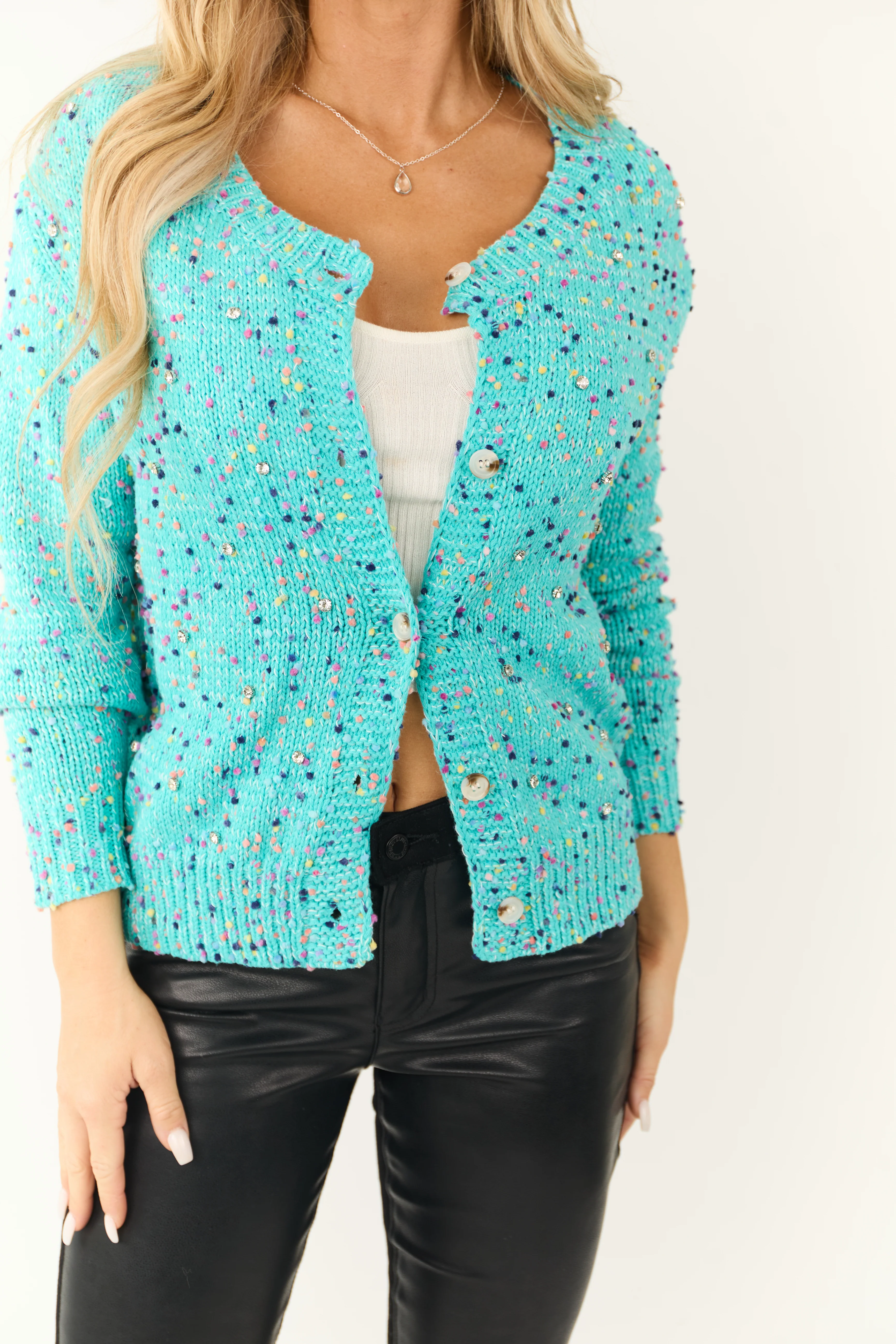 Turquoise Confetti Knit Rhinestone Detail Cardigan