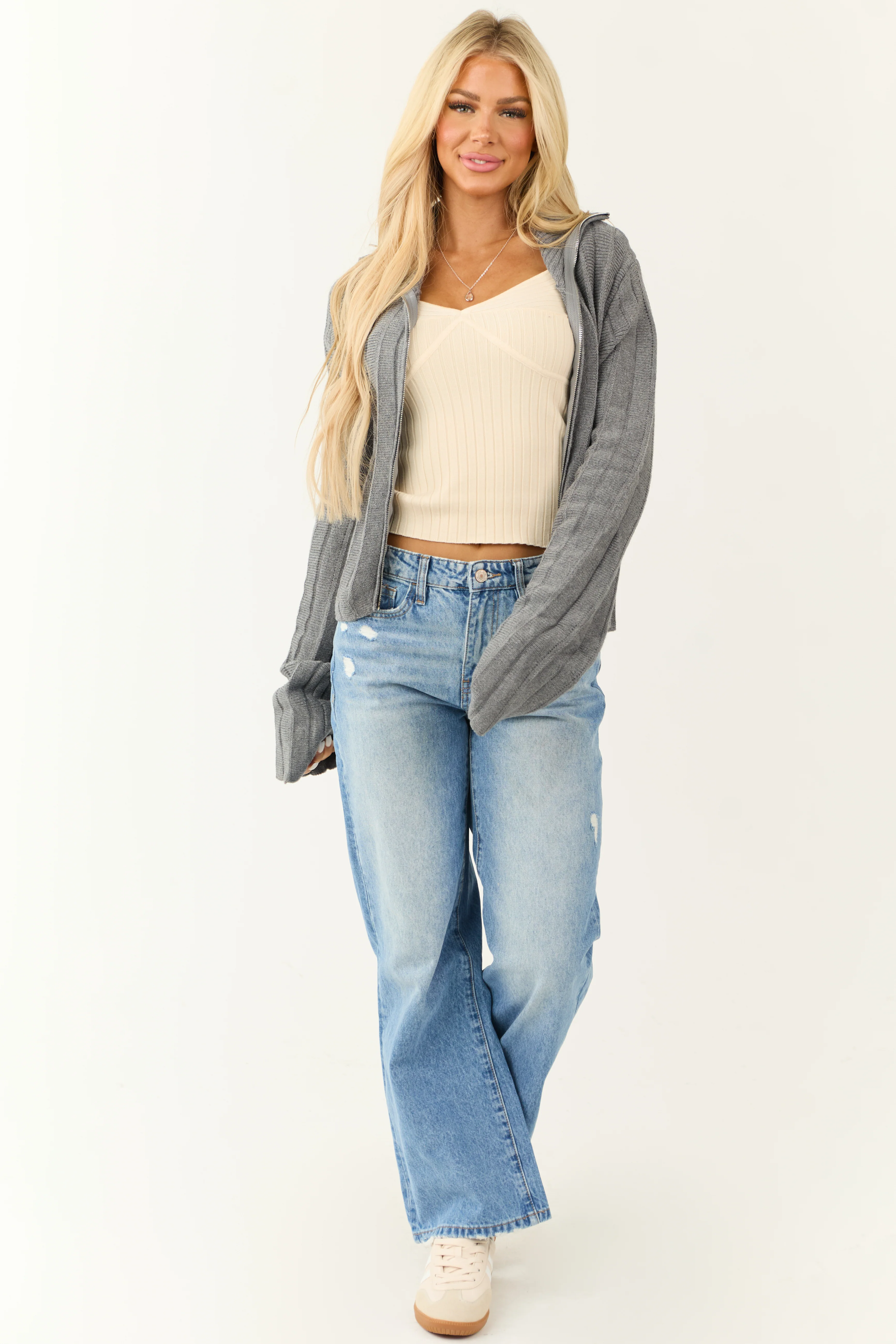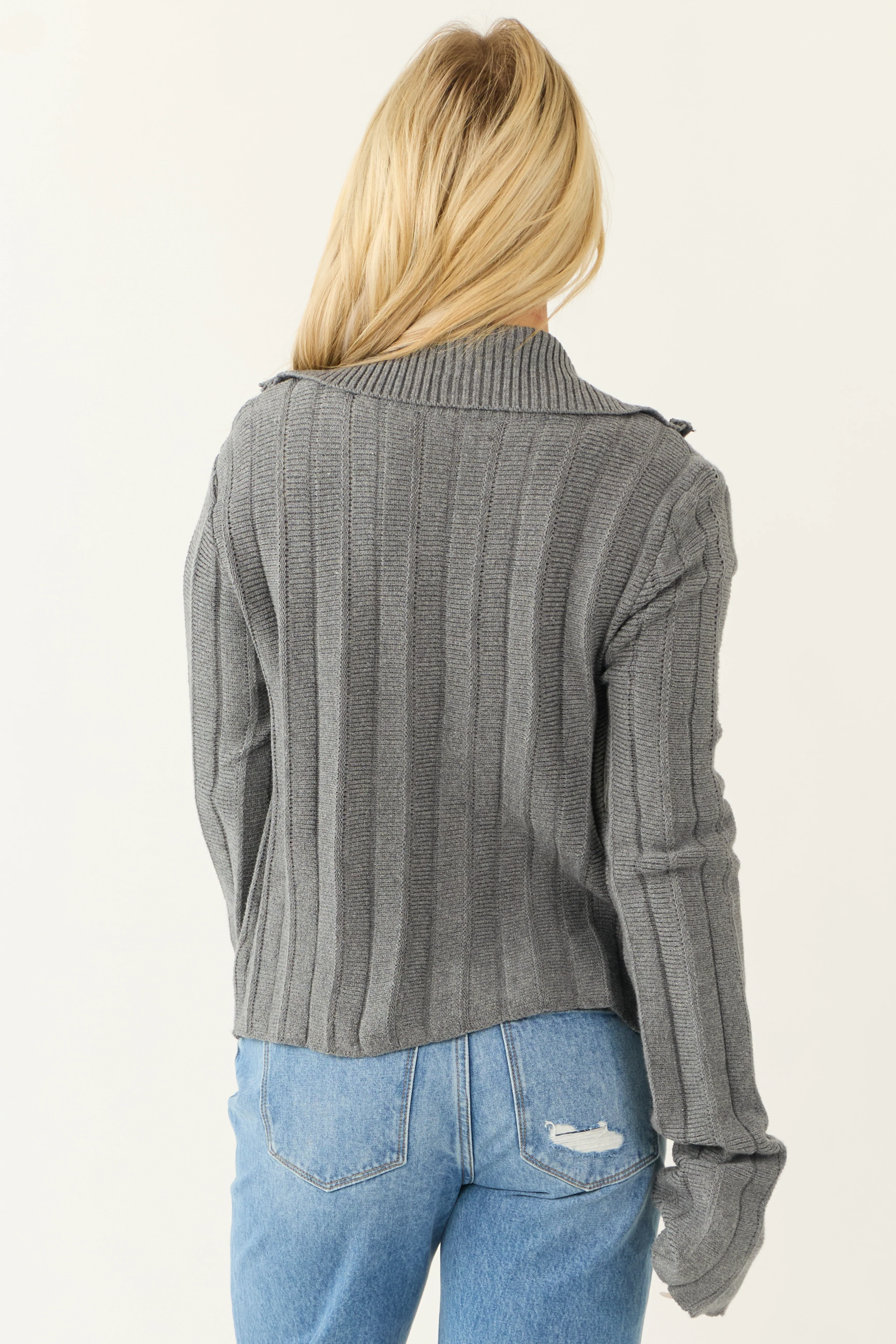 Steel Sweater Knit Zip Up Long Sleeve Jacket