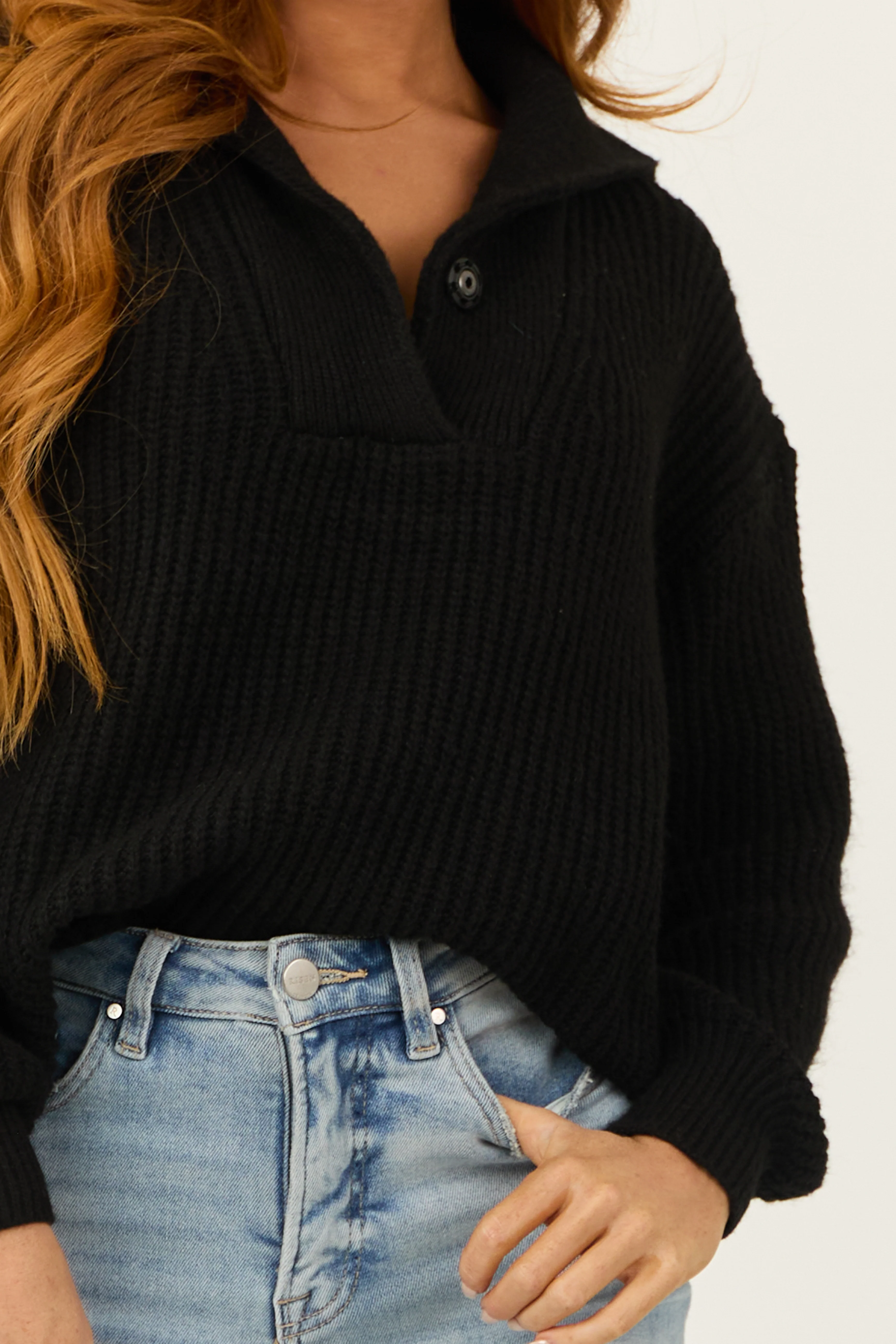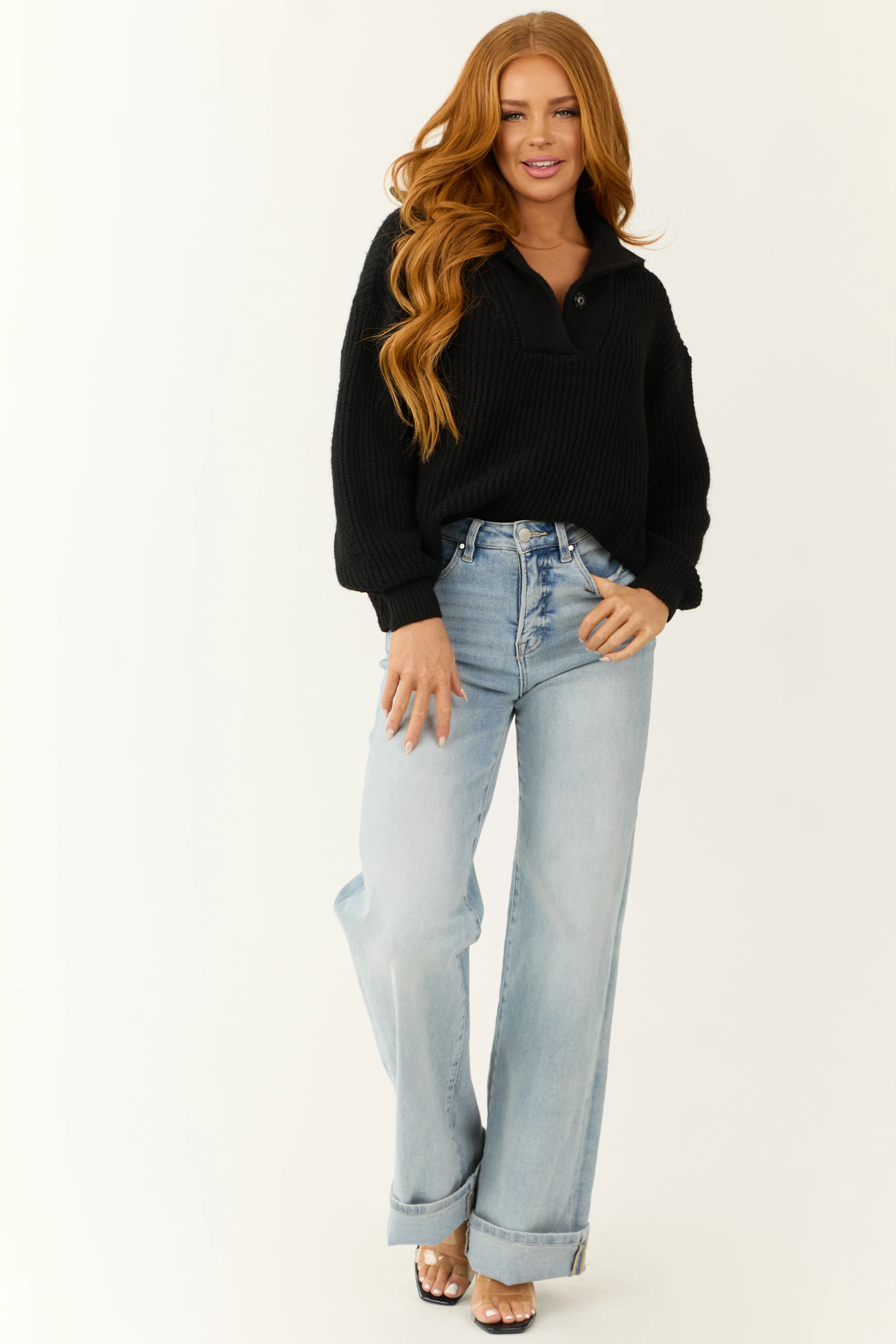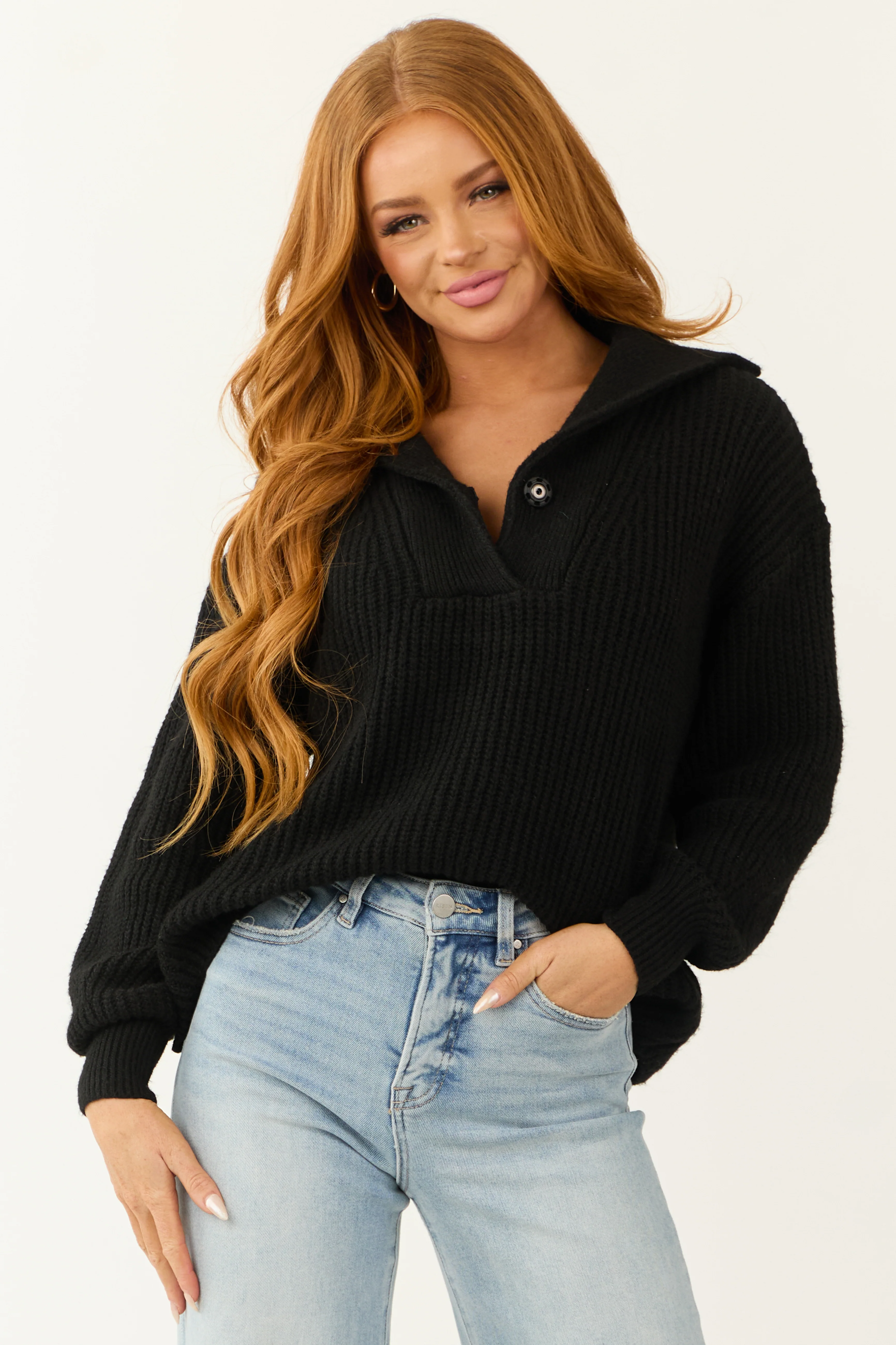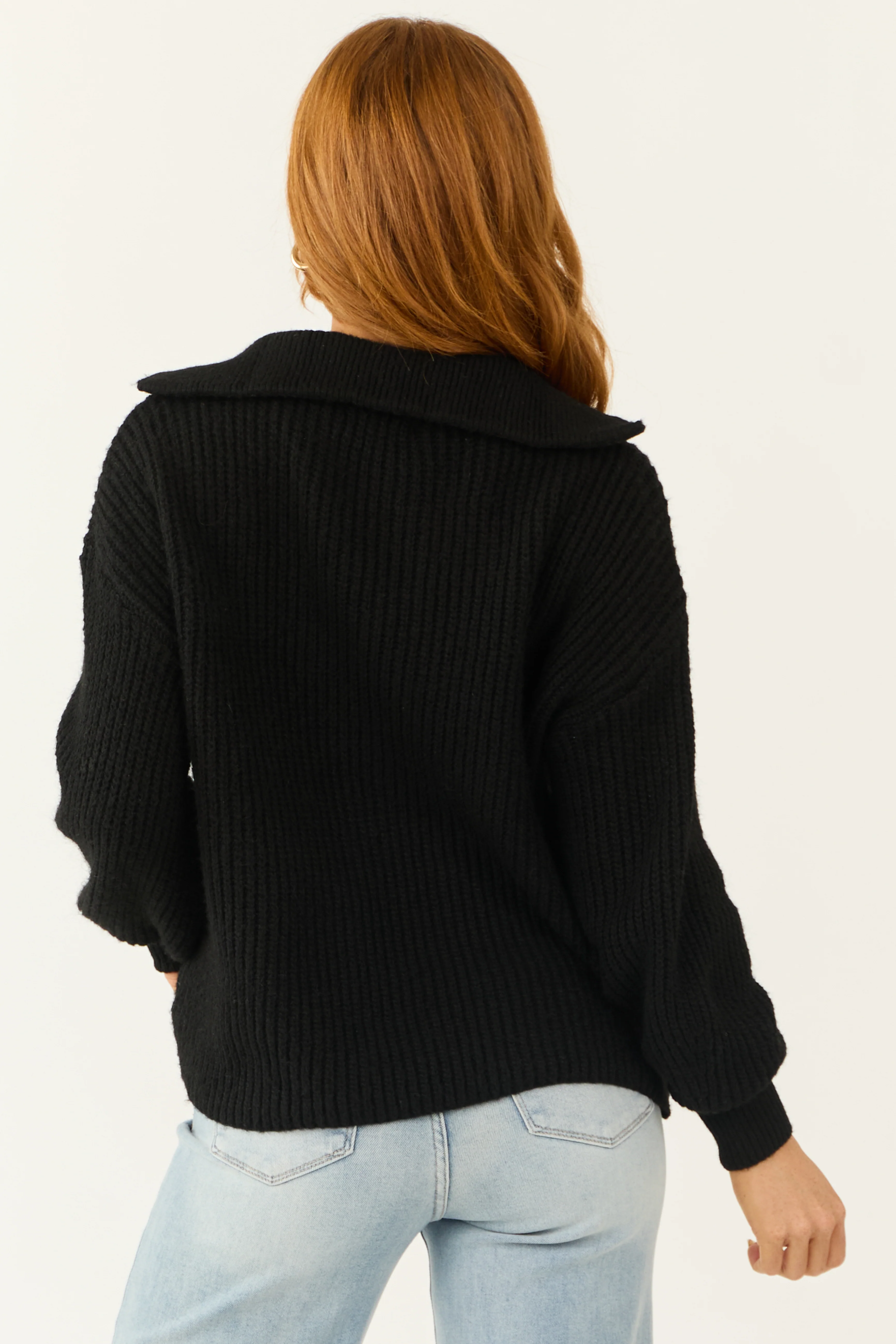 Black Long Bubble Sleeve Ribbed Knit Sweater