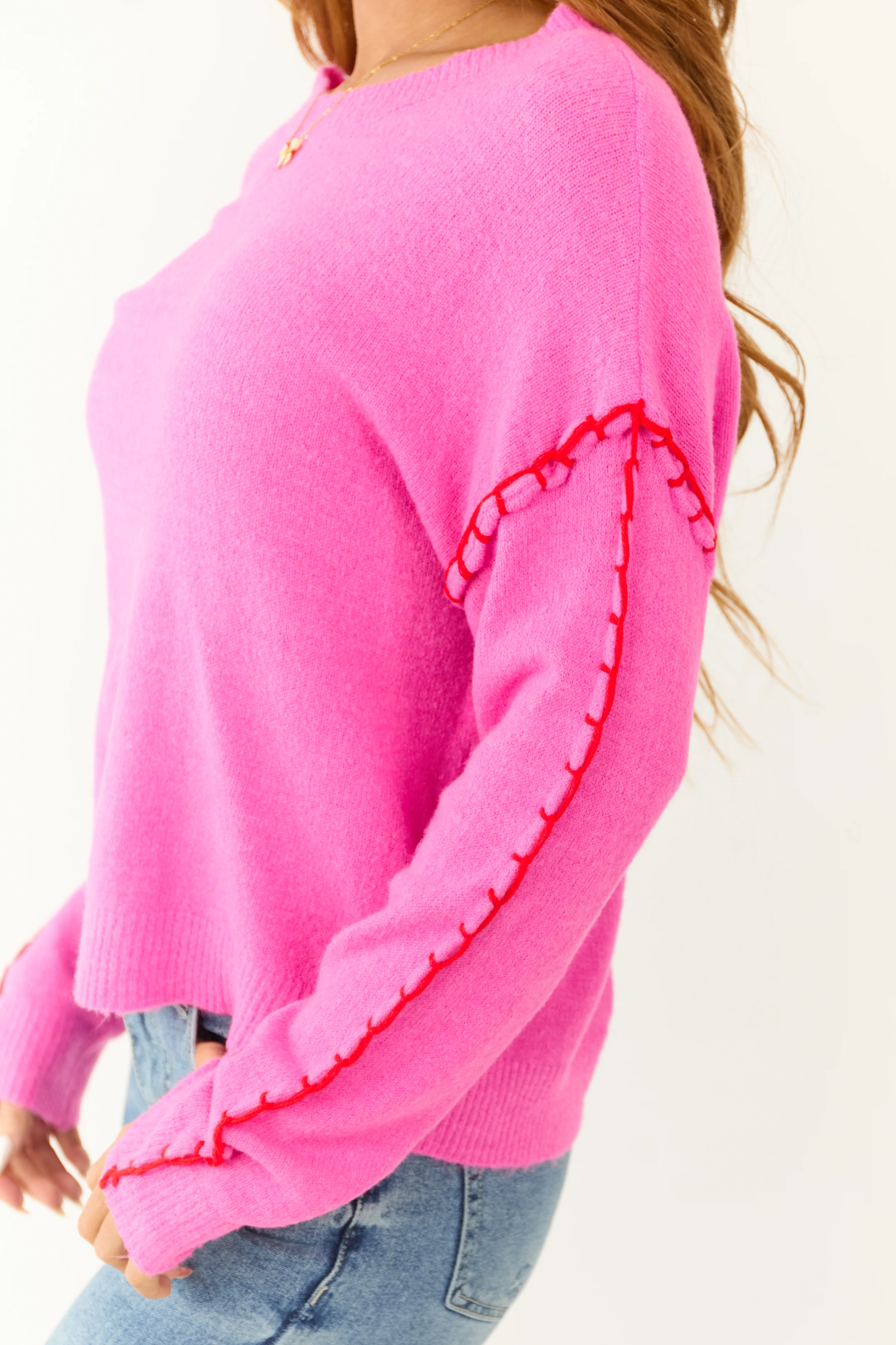 Light Fuchsia Long Sleeve Contrast Stitch Sweater
