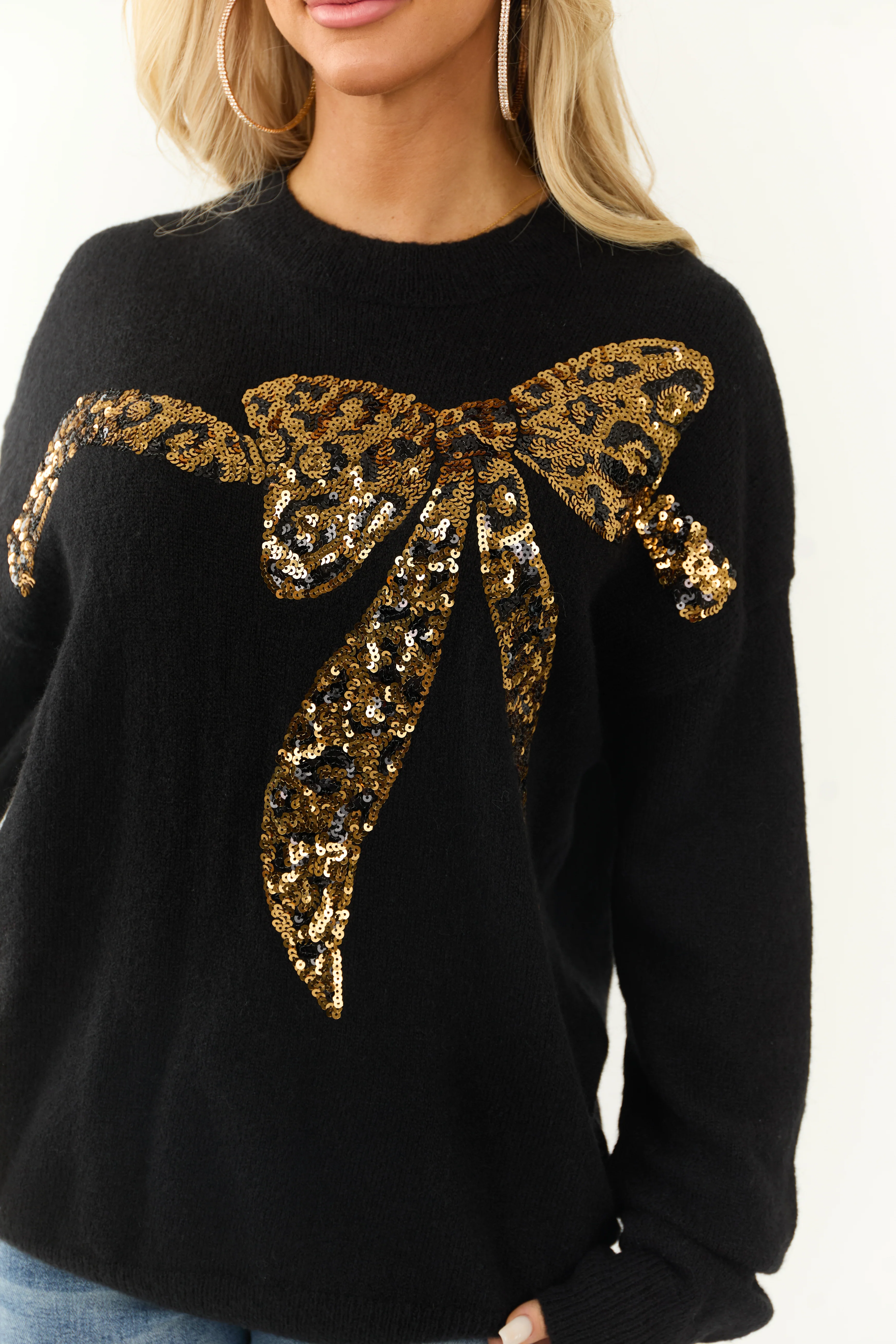 Black Sequin Bow Graphic Long Sleeve Sweater
