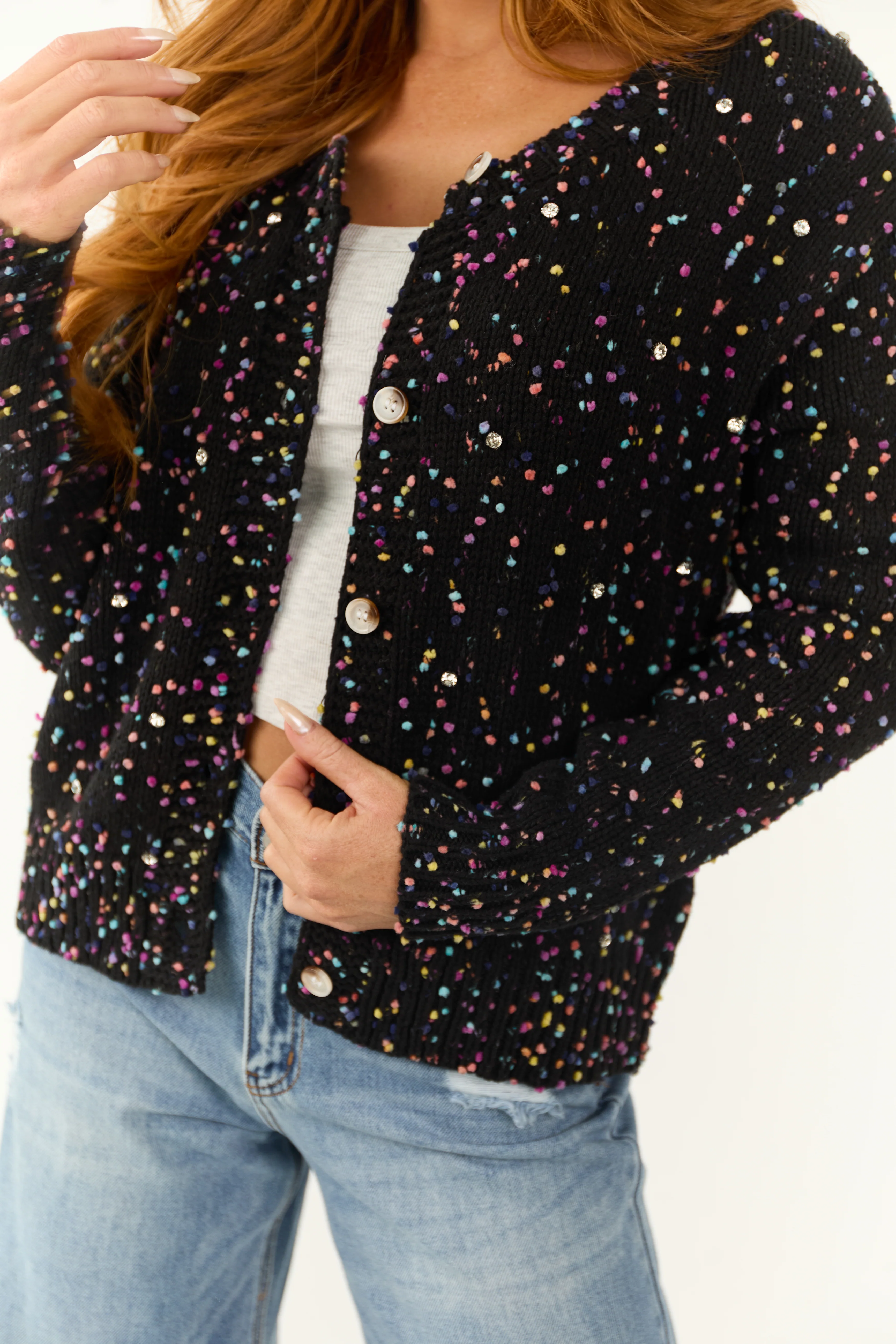 Black Confetti Knit Rhinestone Detail Cardigan