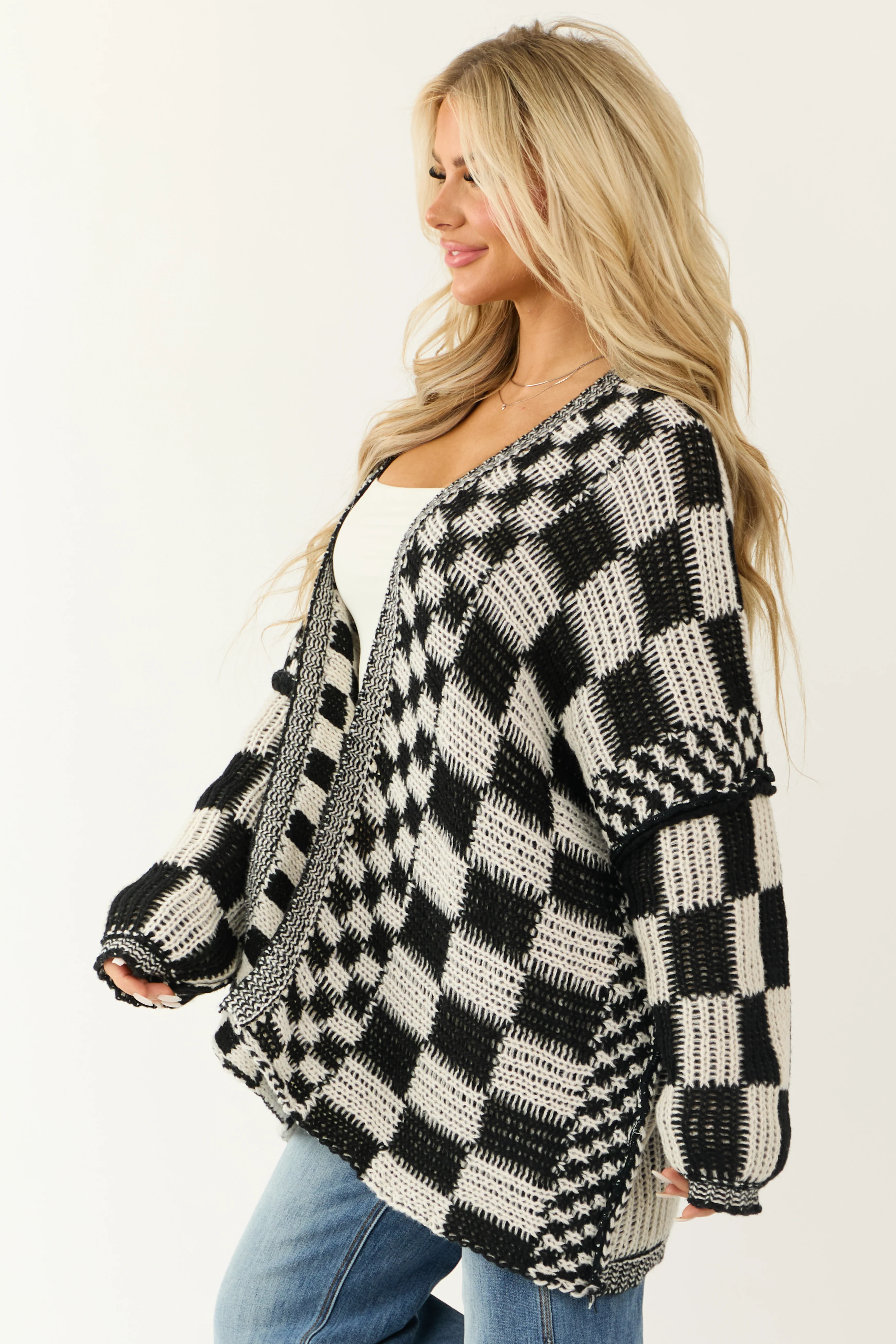Cream and Black Checkered Open Front Cardigan