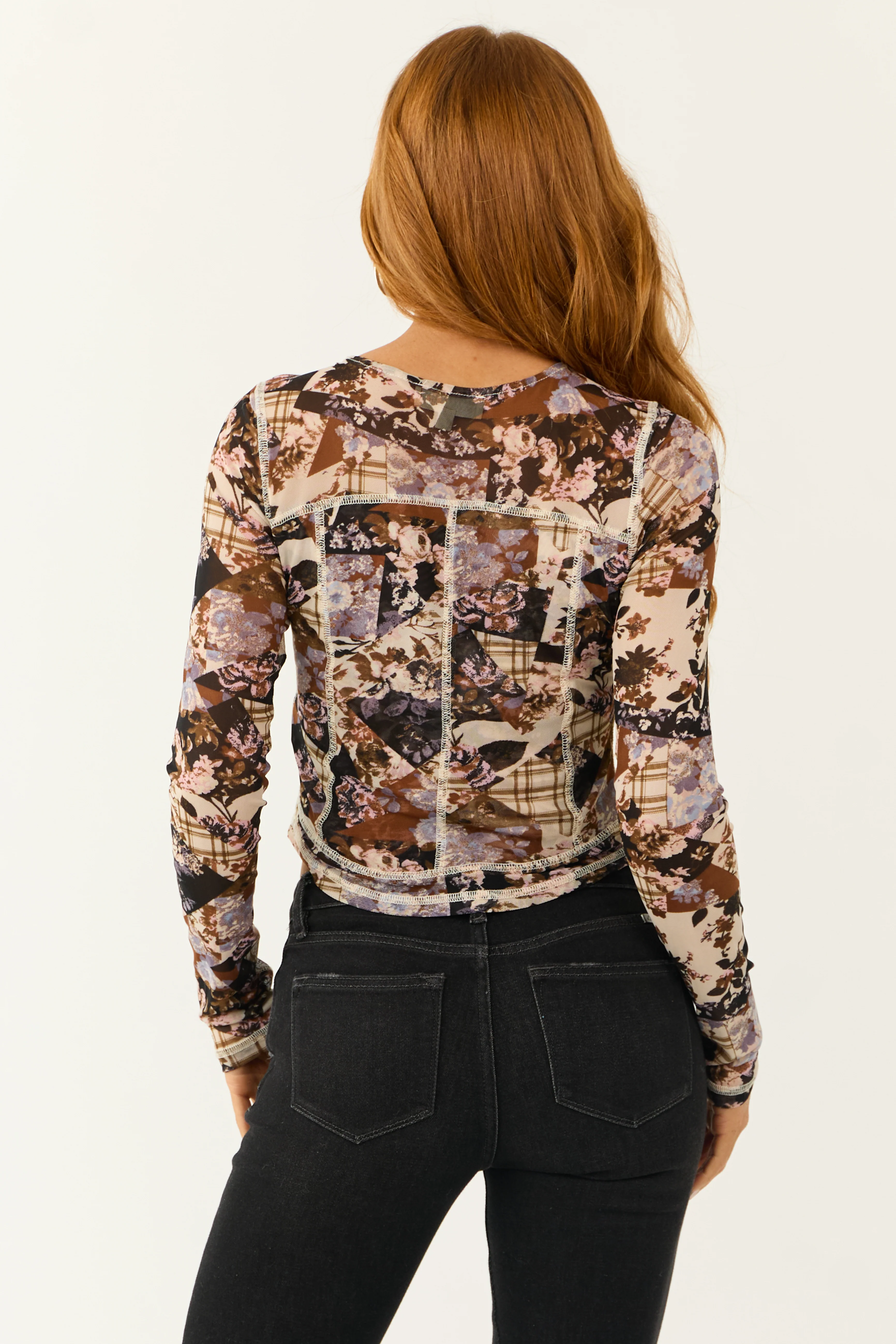 Almond Floral Mesh Fitted Long Sleeve Top