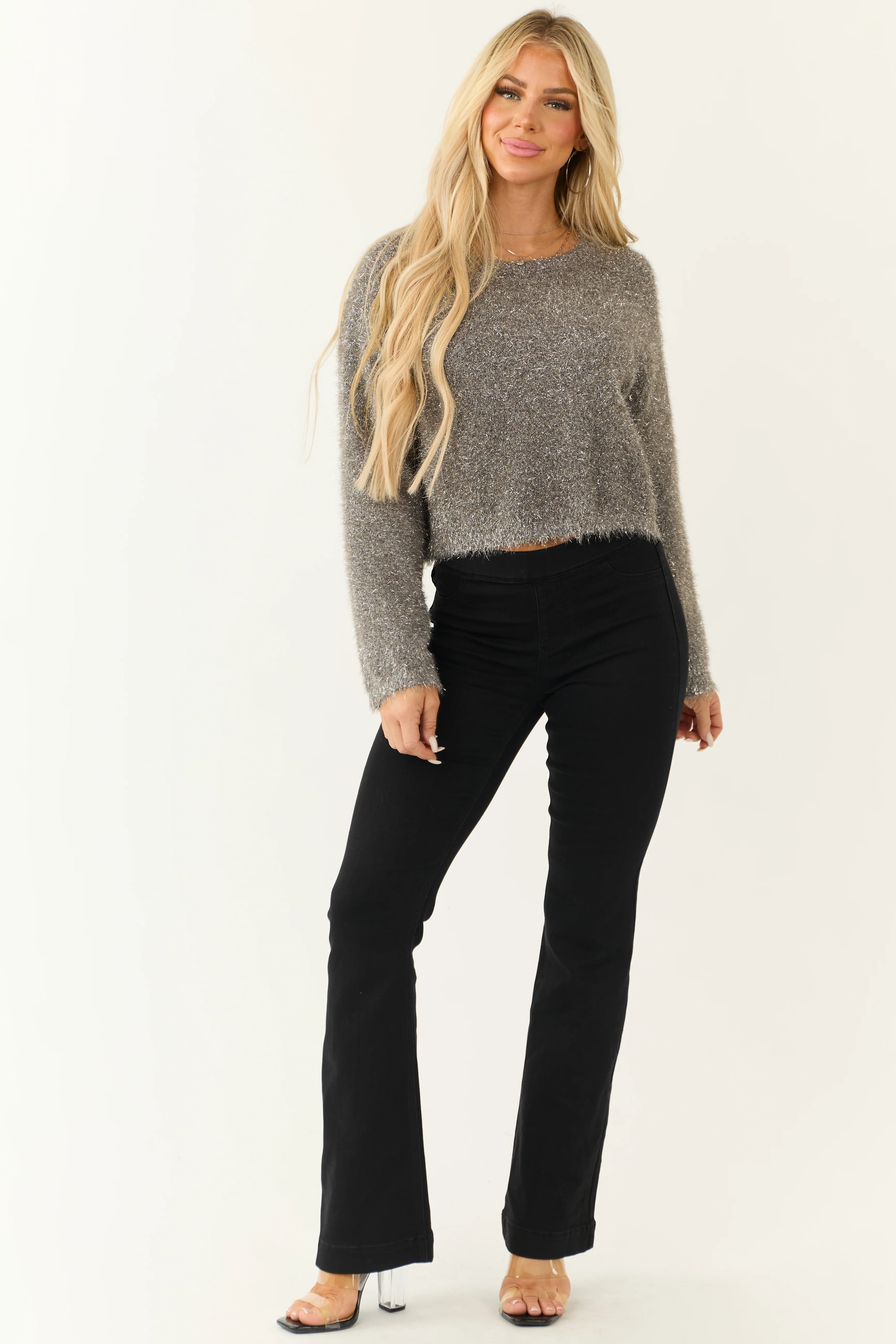 Metallic Stone Lurex Fuzzy Knit Cropped Sweater