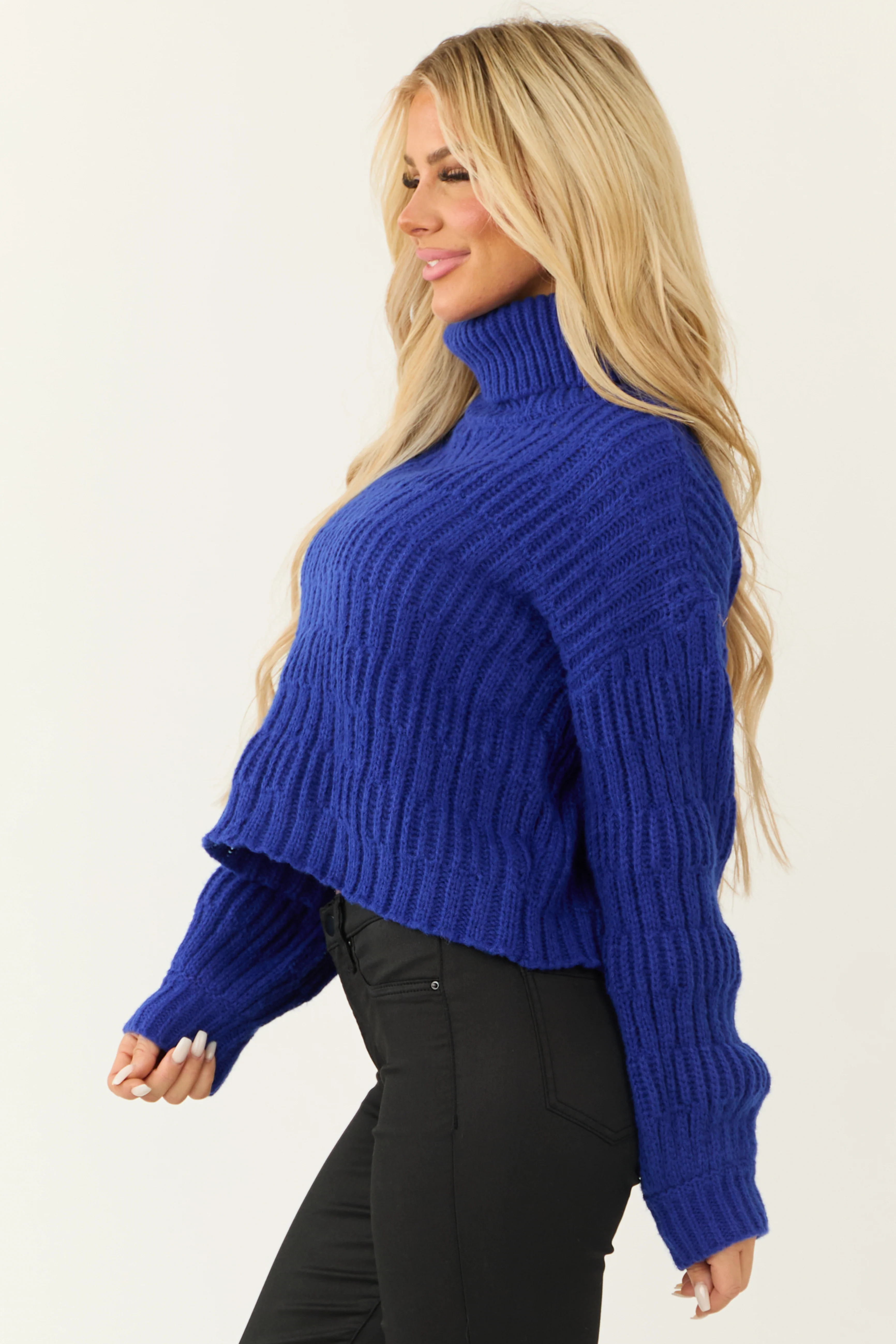 Royal Blue Turtleneck Textured Knit Sweater
