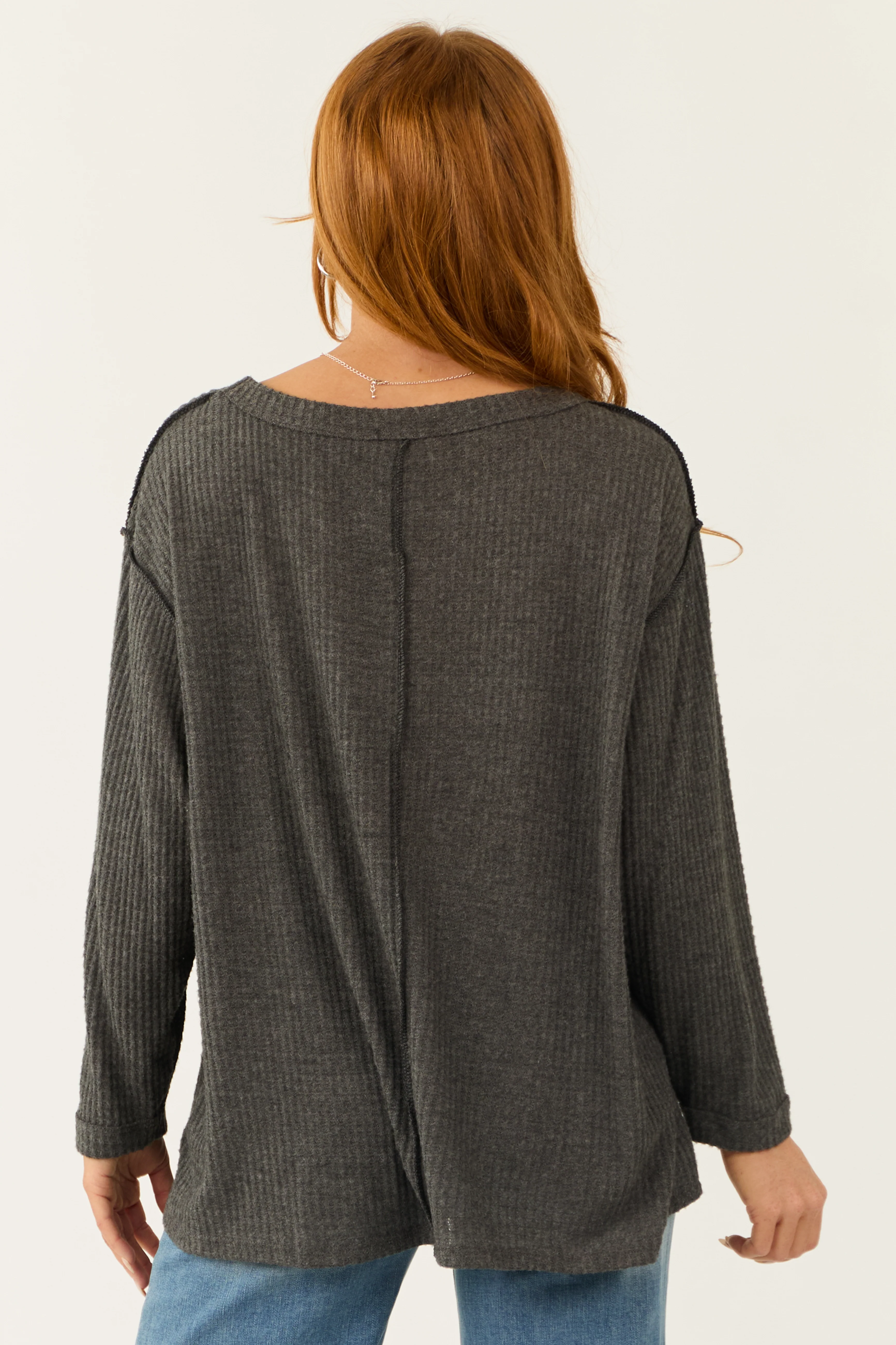 Graphite Long Sleeve Round Neck Waffle Knit Top