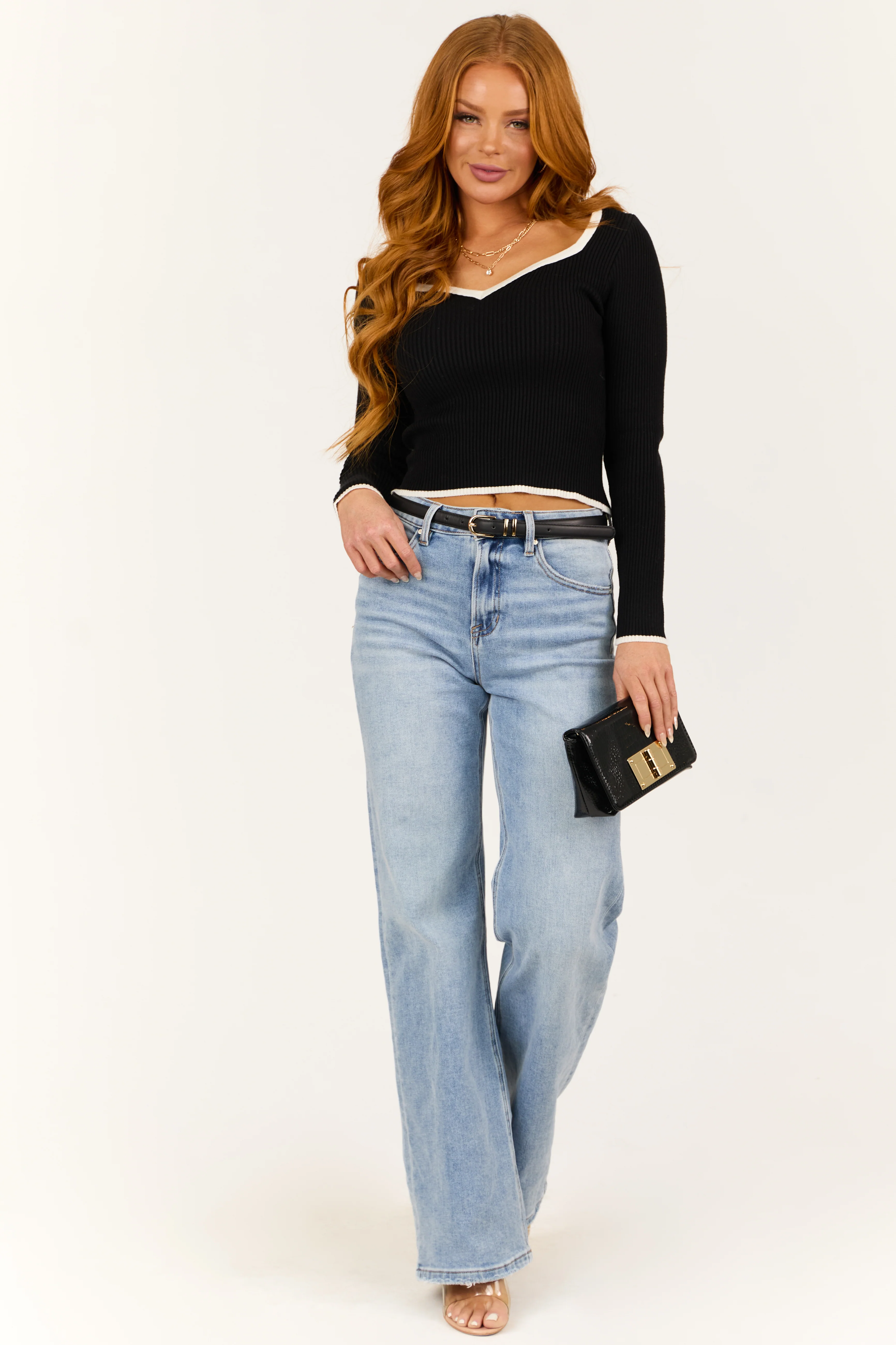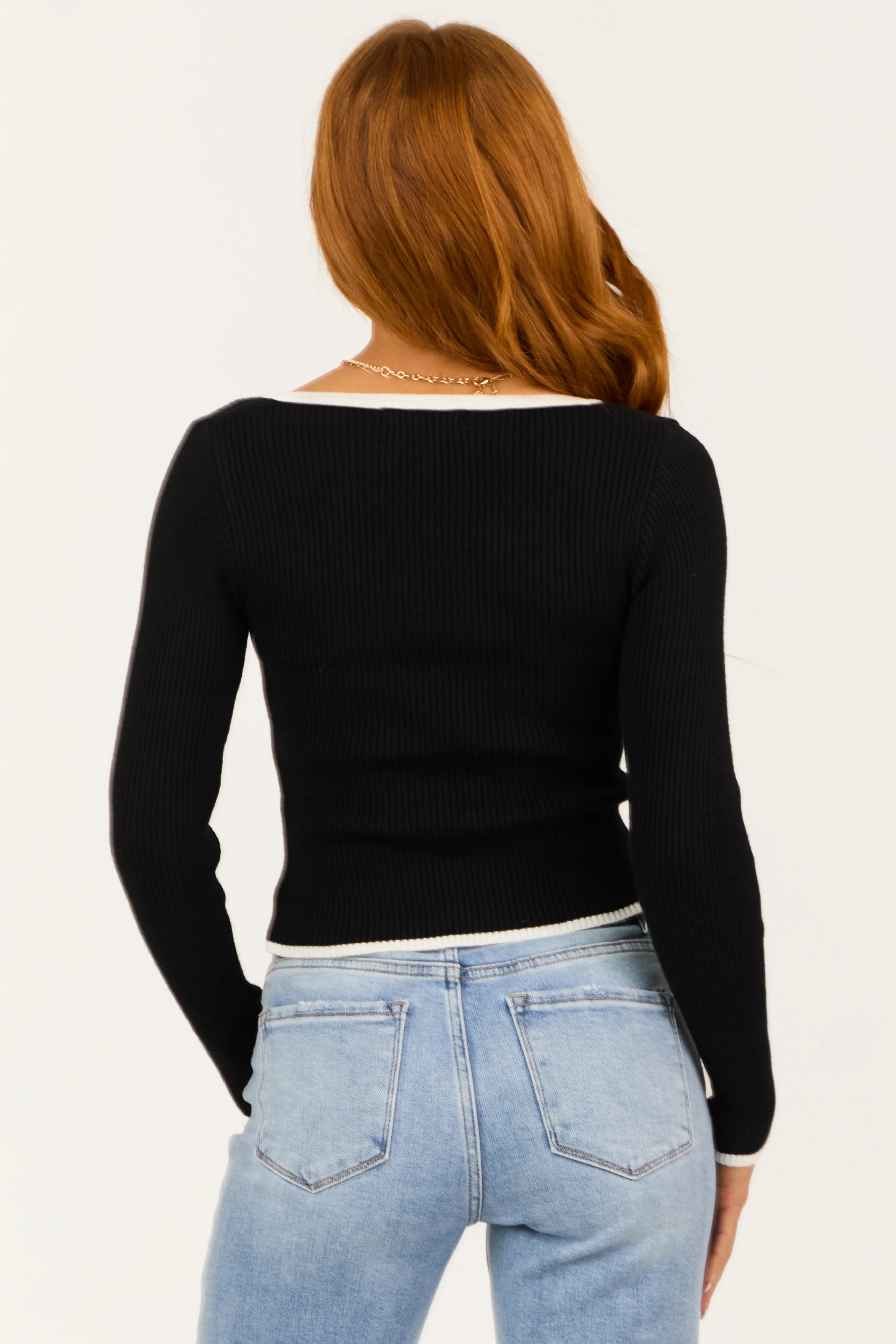 Black Long Sleeve Contrast Trim Ribbed Sweater