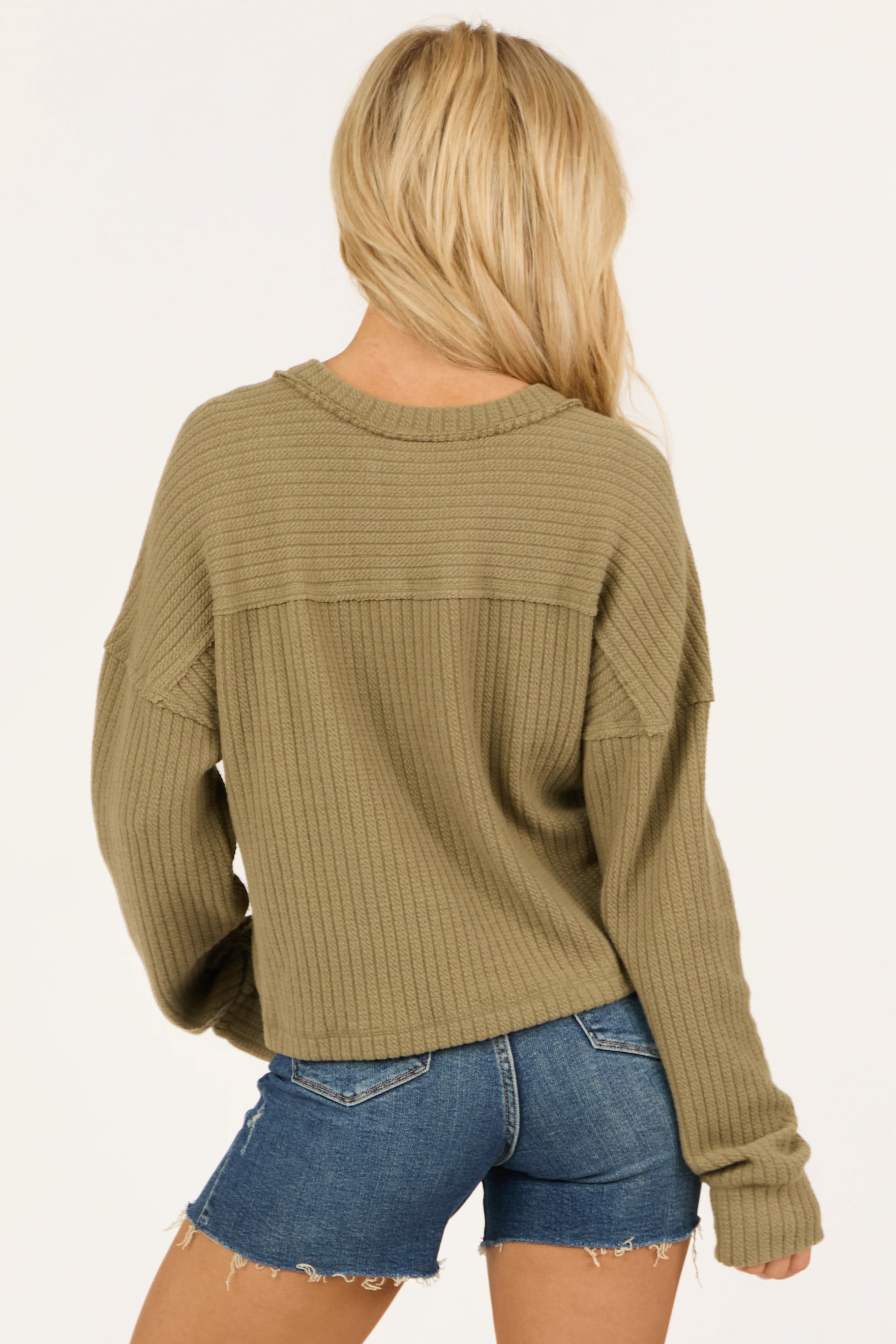 Olive V Neck Exposed Seam Ribbed Sweater