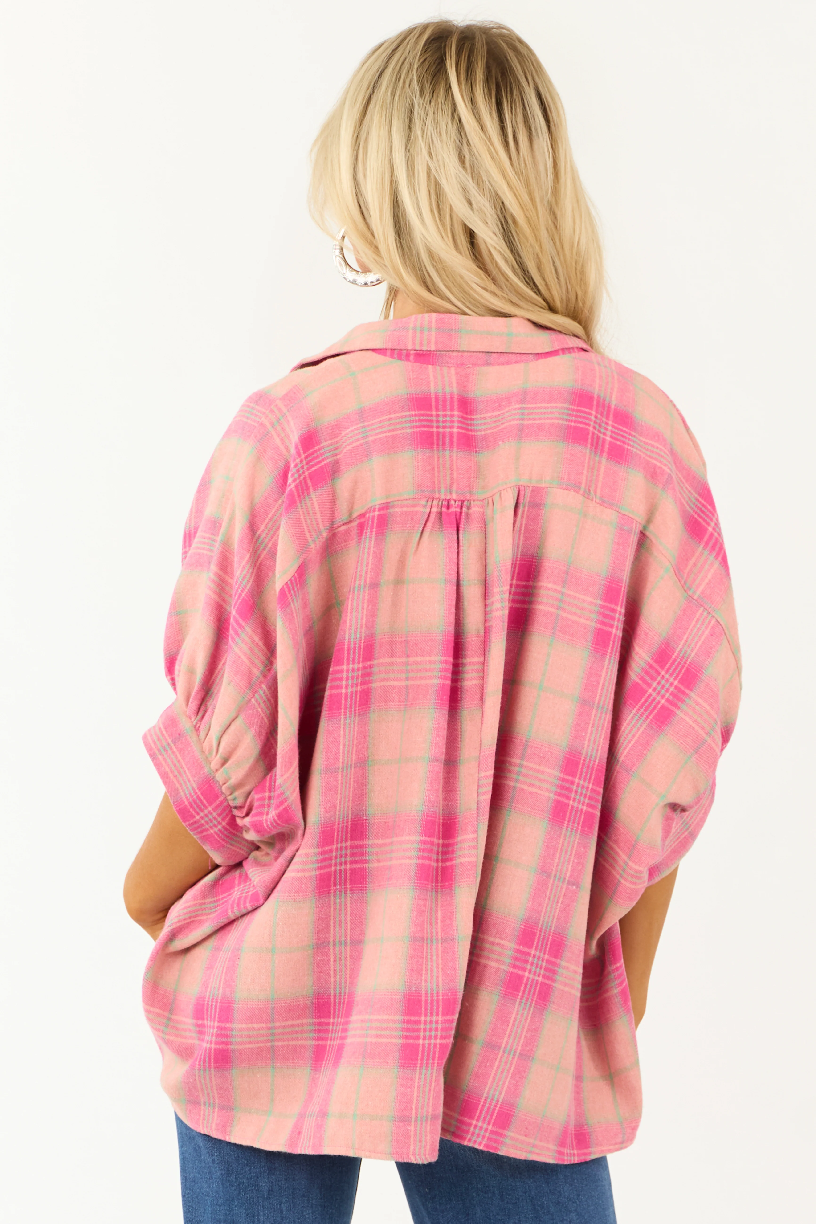 Punch Plaid Oversized Button Up Half Sleeve Shirt