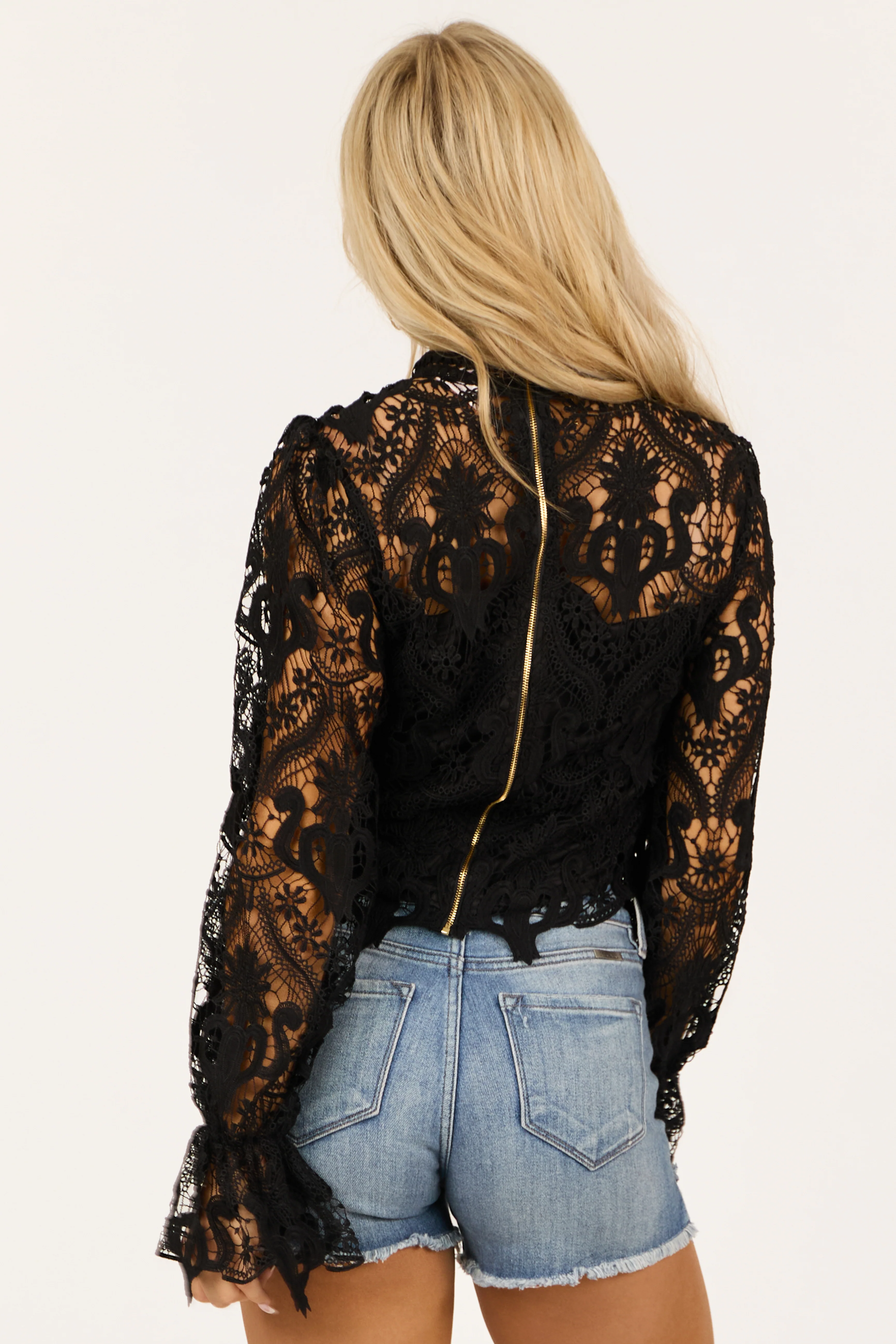 Black Floral Lace Flared Cuff Long Sleeve Top