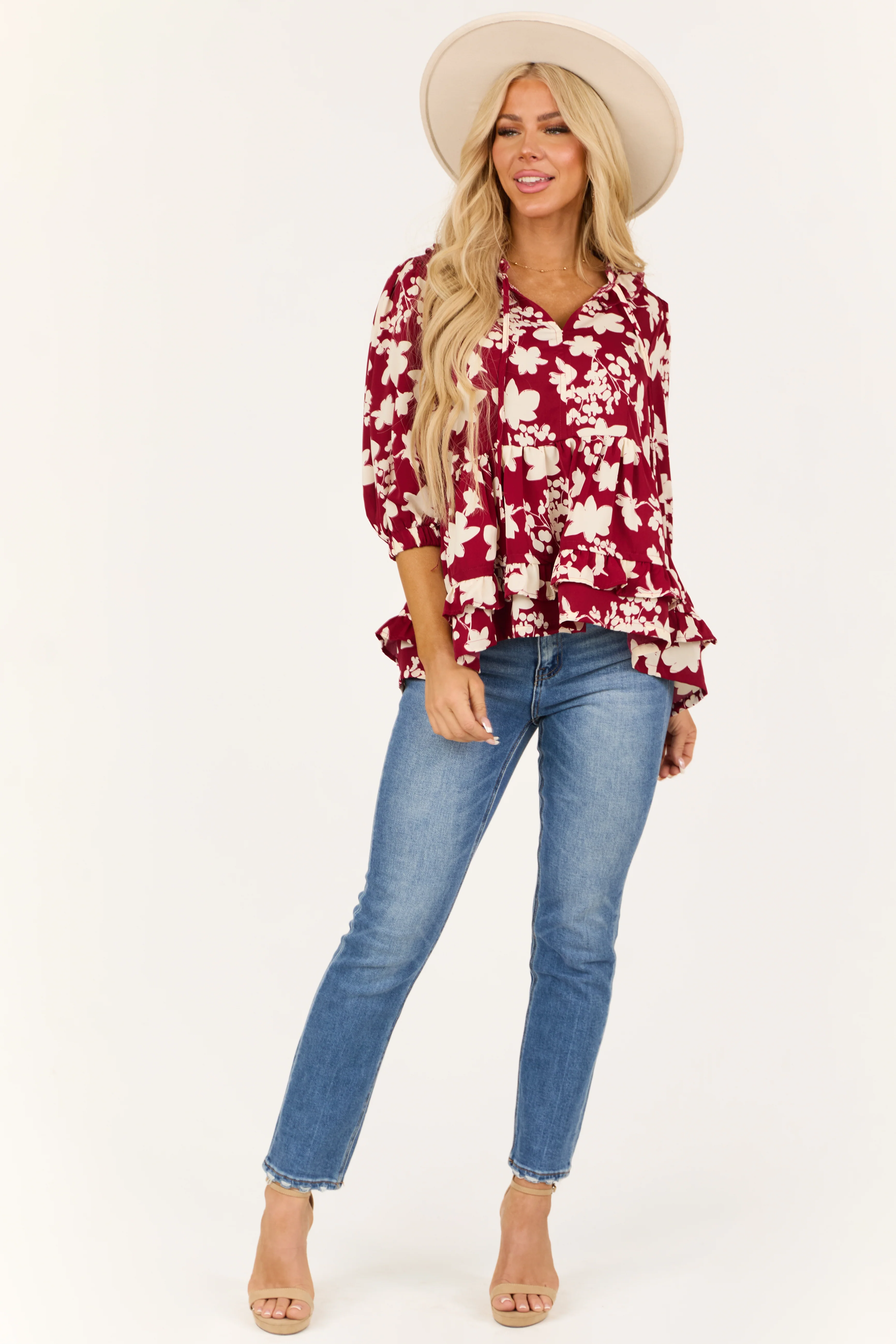 Maroon Floral Outline Ruffle 3/4 Sleeve Top