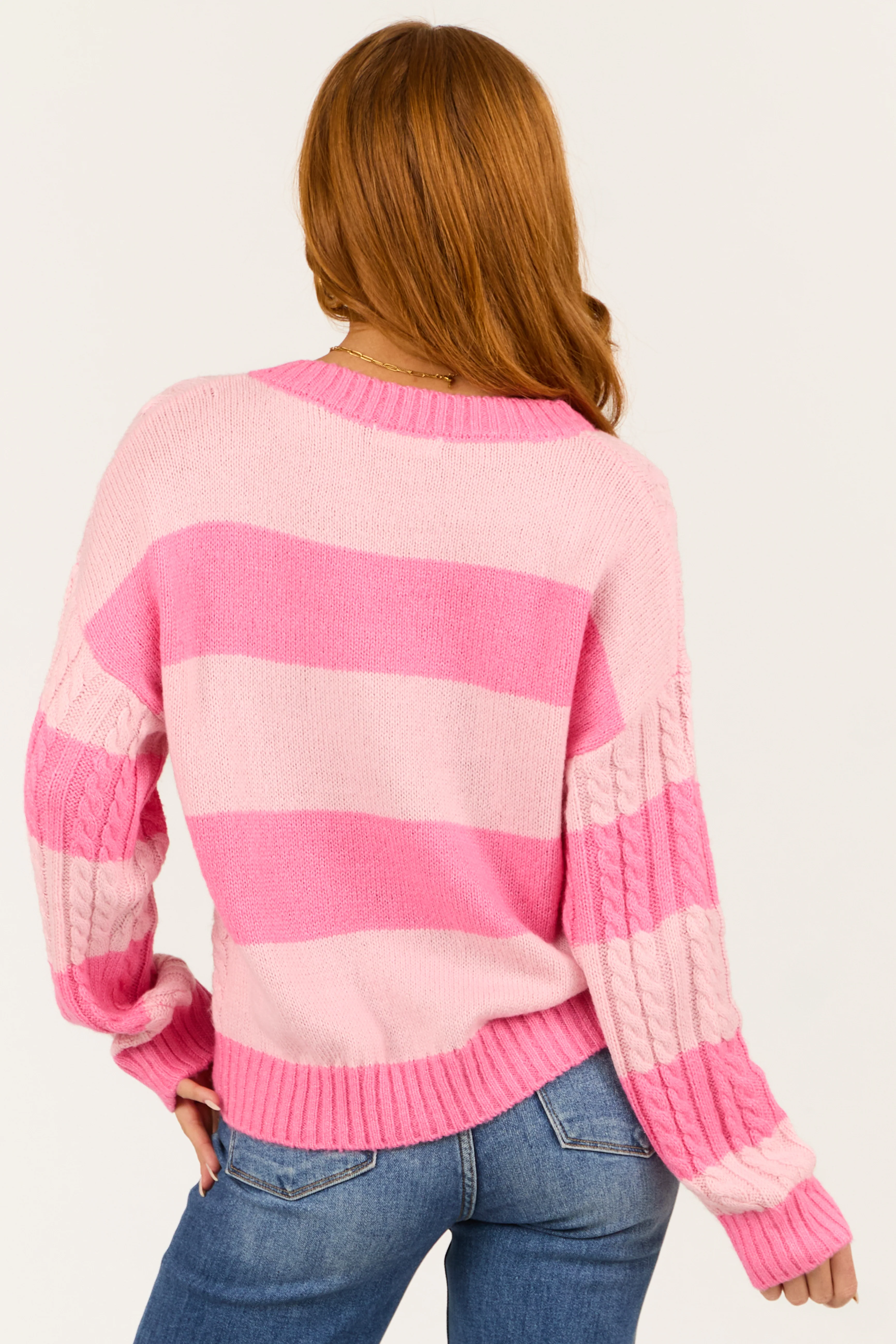 Baby Pink Striped V Neck Cable Knit Sweater
