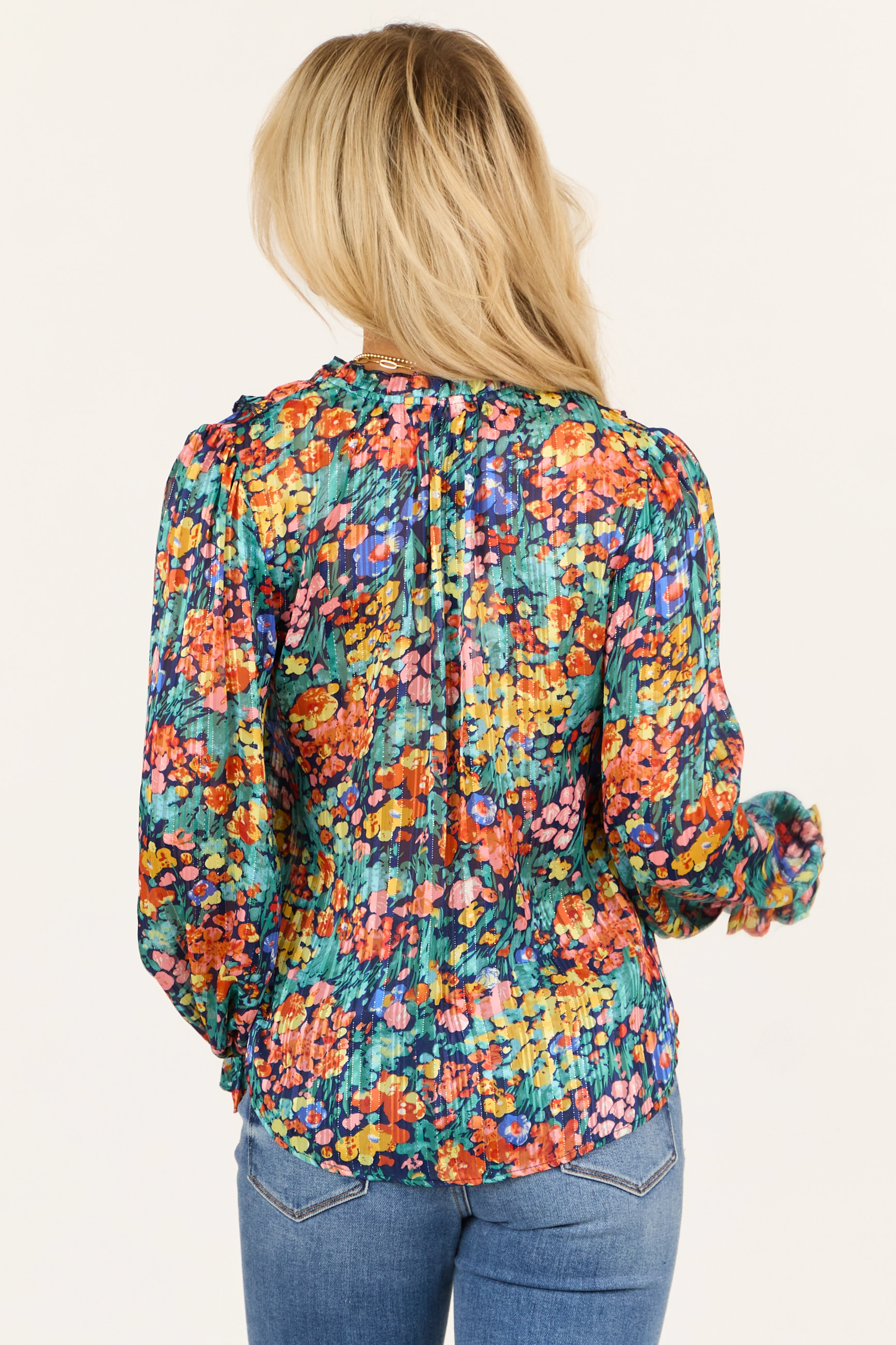 Teal Colorful Floral Lurex Frill V Neck Blouse