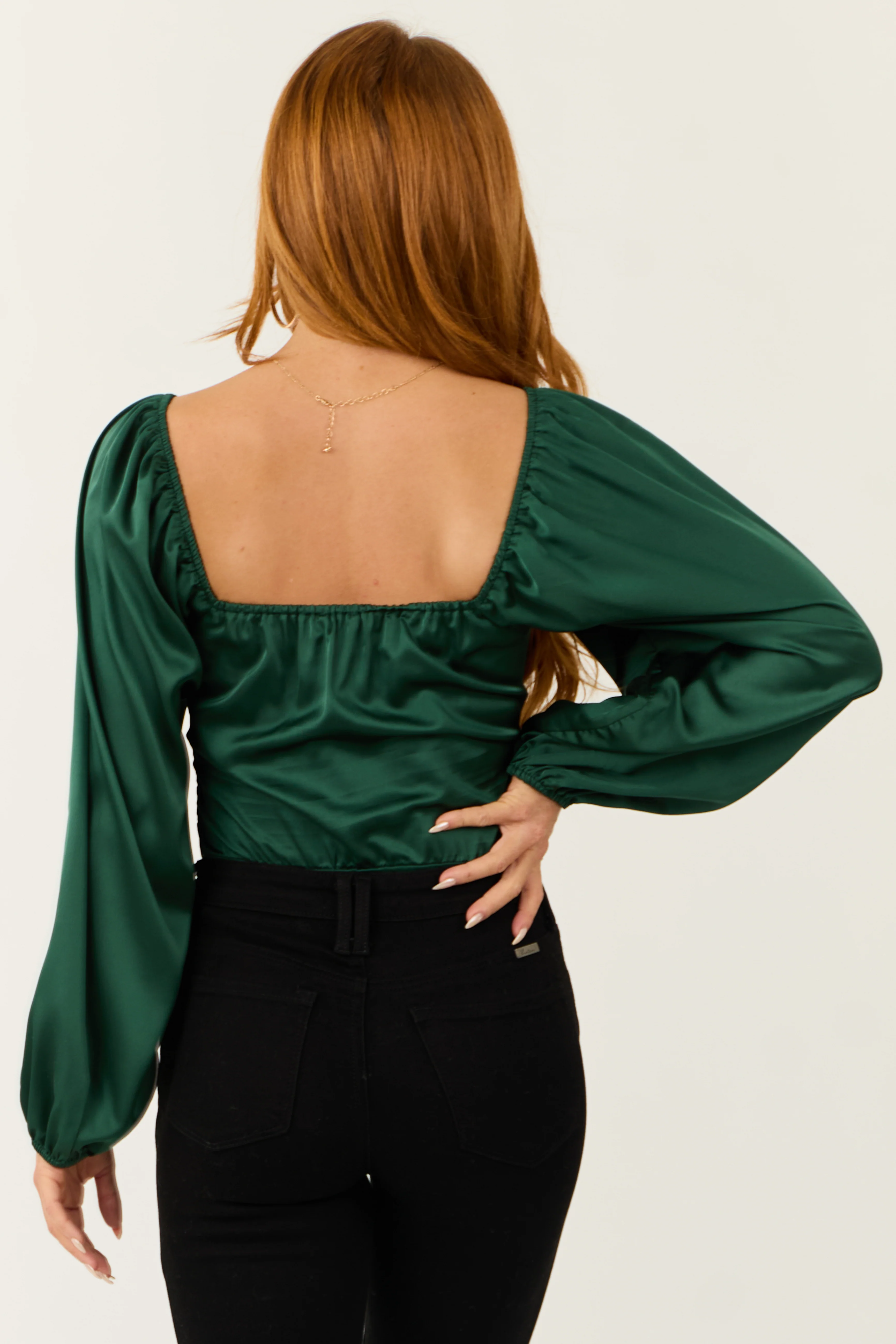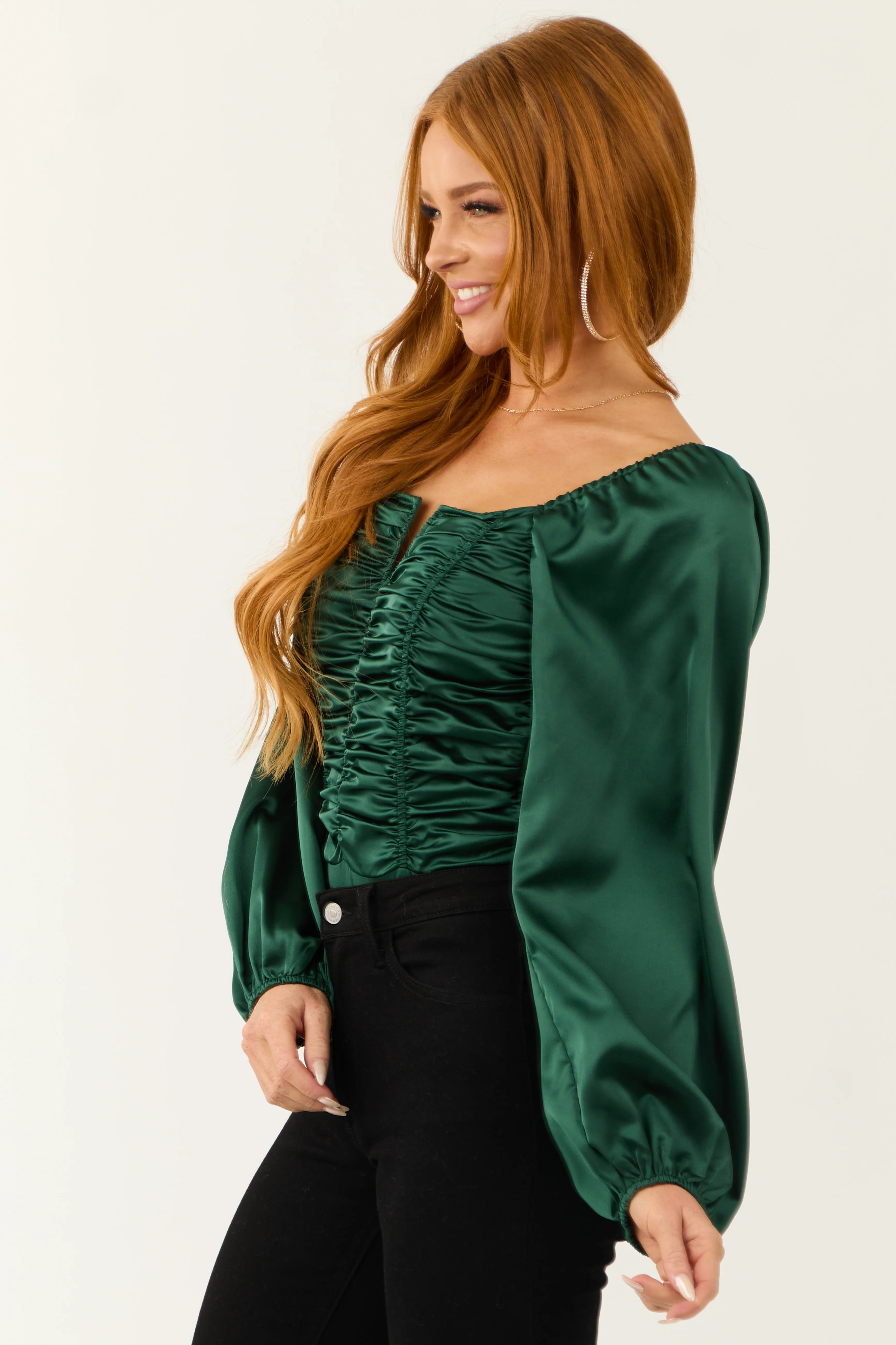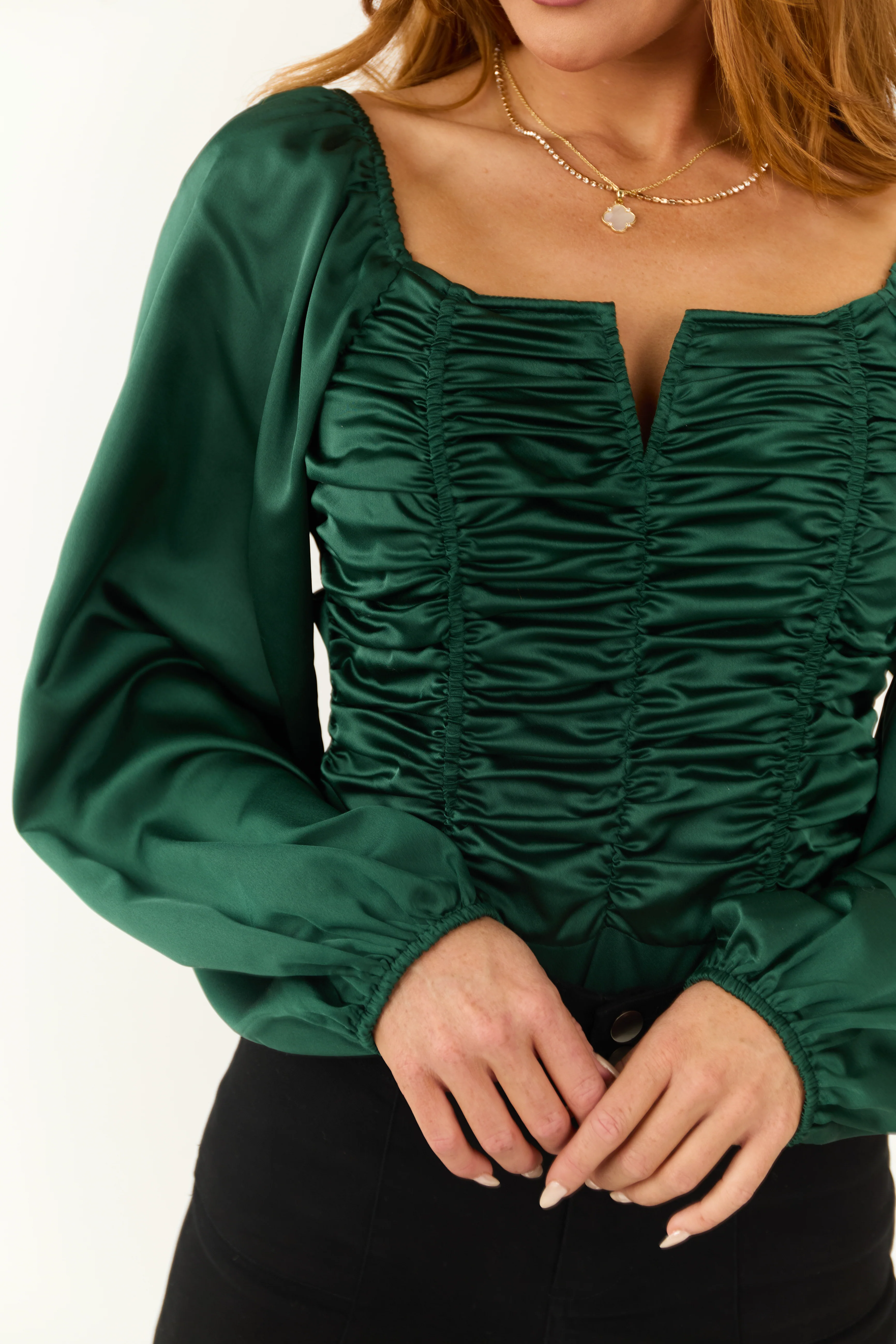 Deep Pine Long Bubble Sleeve Ruched Satin Bodysuit