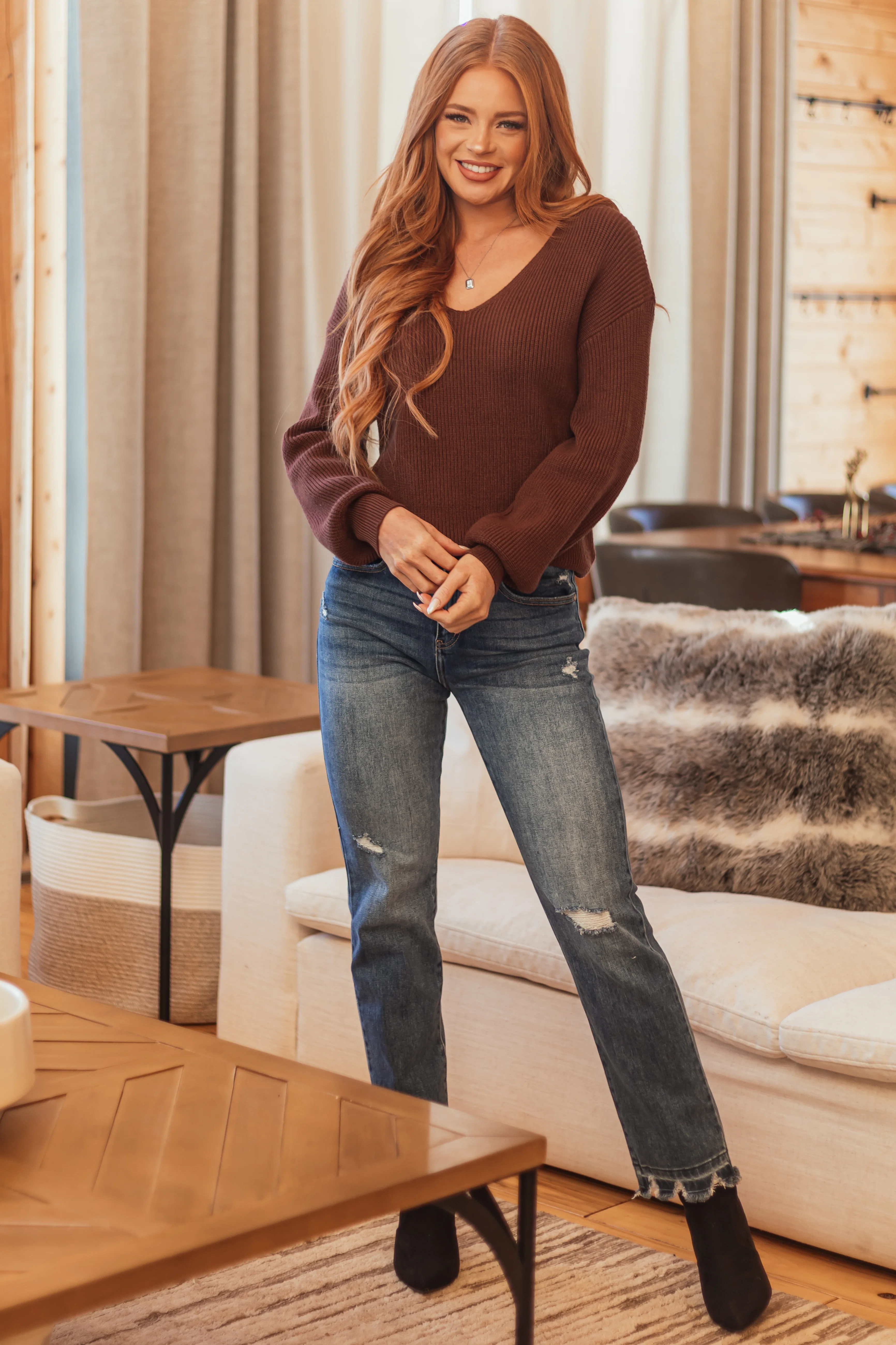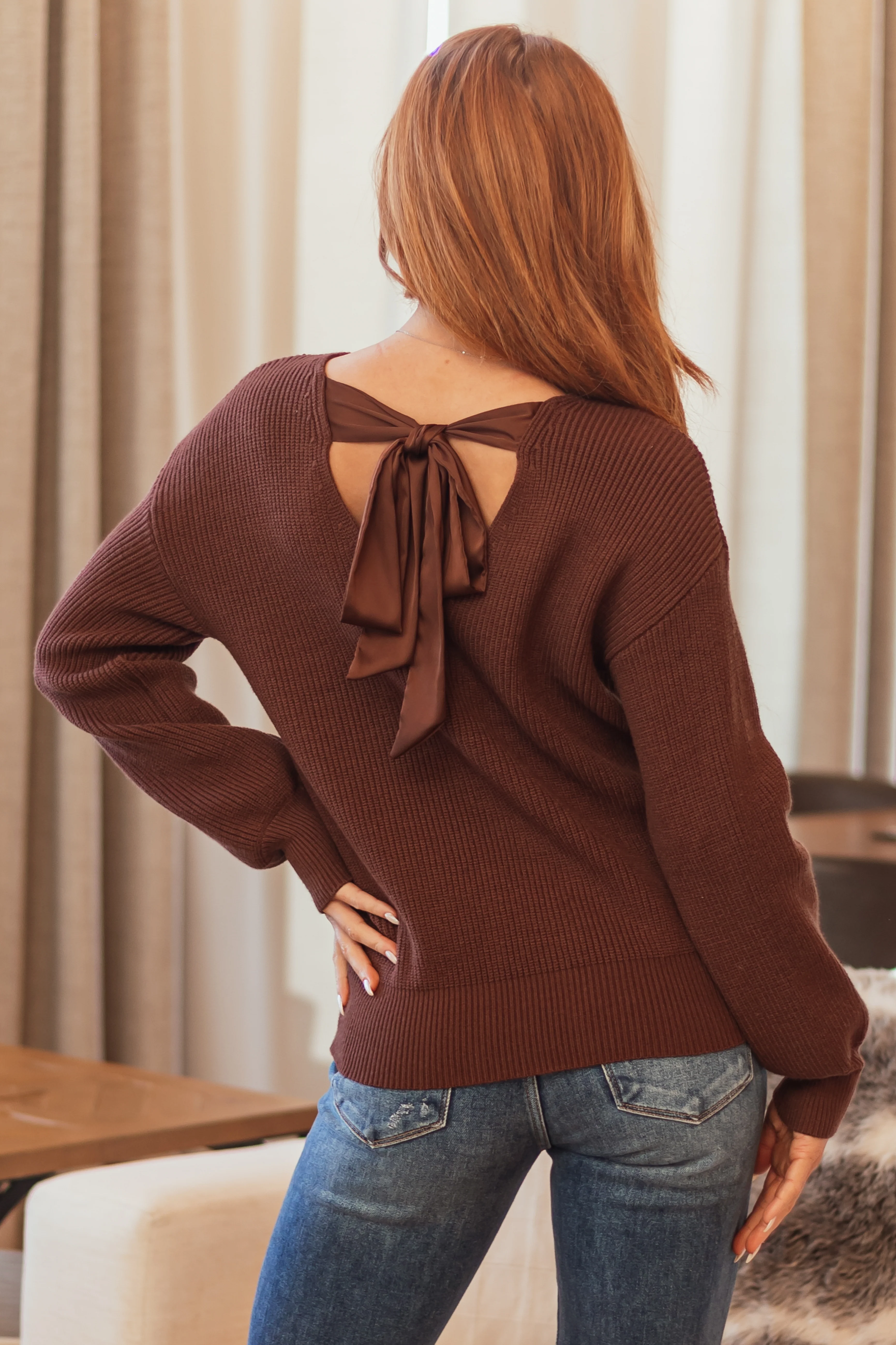 Cocoa V Neck Back Tie Puff Long Sleeve Sweater