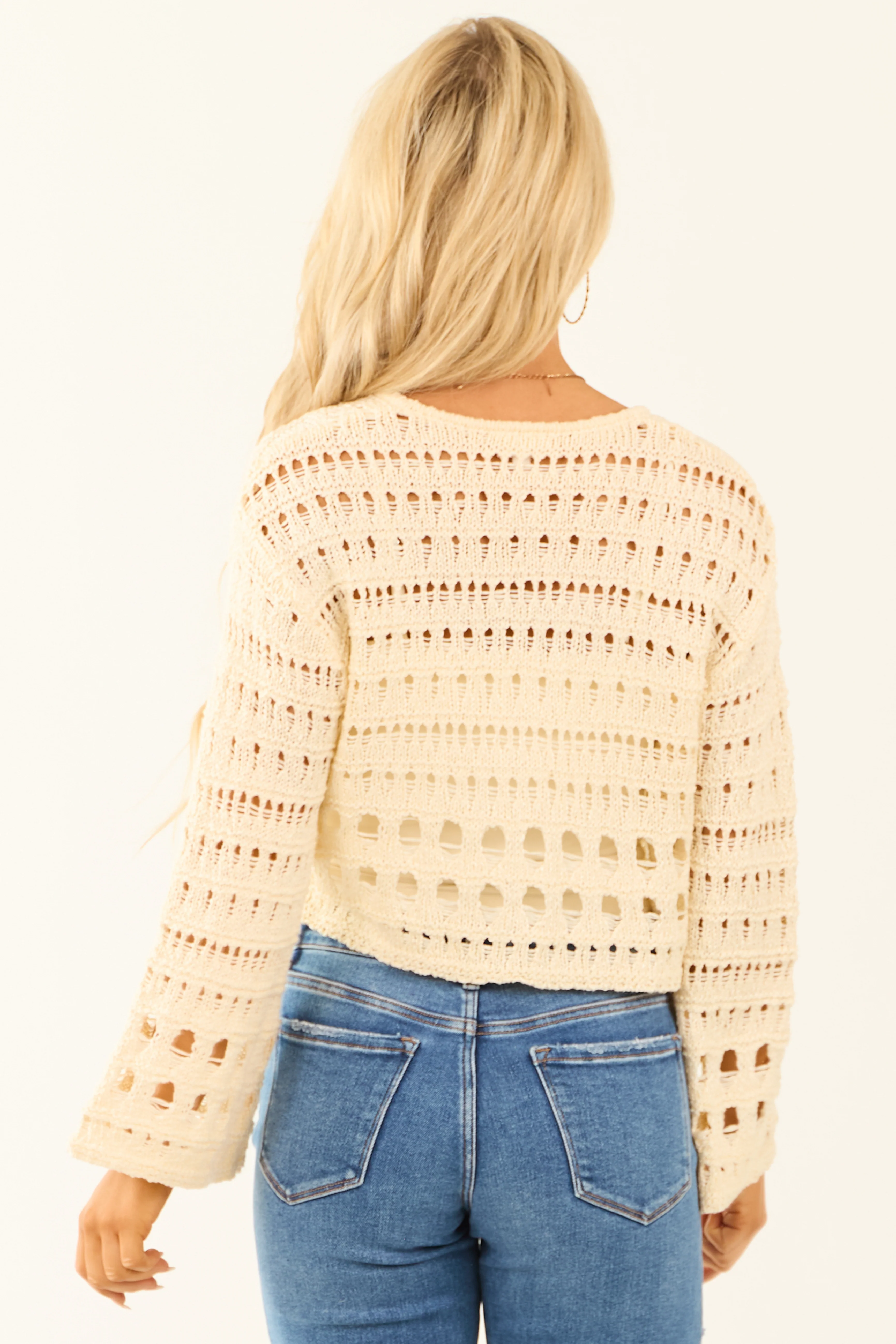 Cream V Neck Flare Sleeve Cropped Sweater