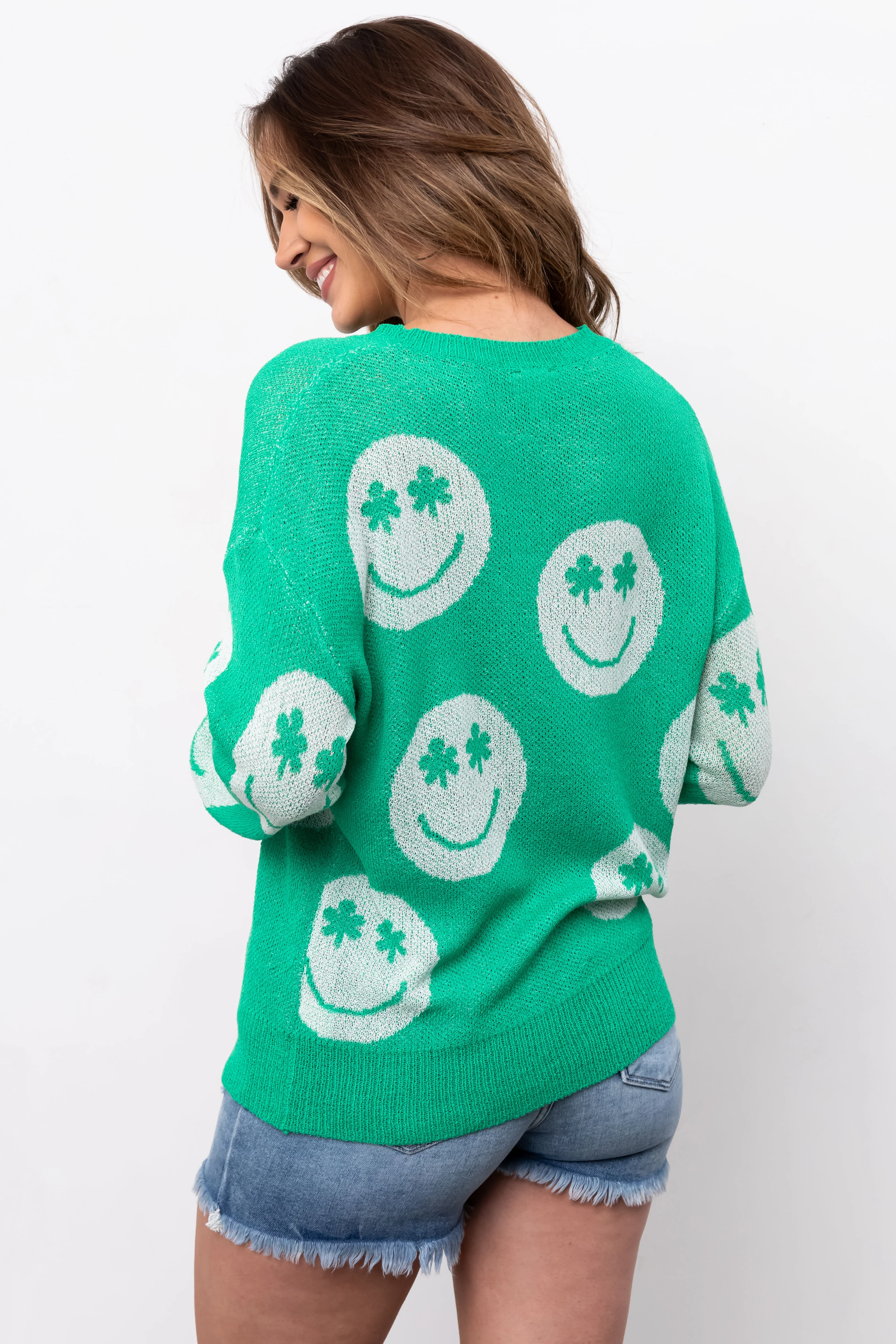 Kelly Green Clover Smiley Face Sweater