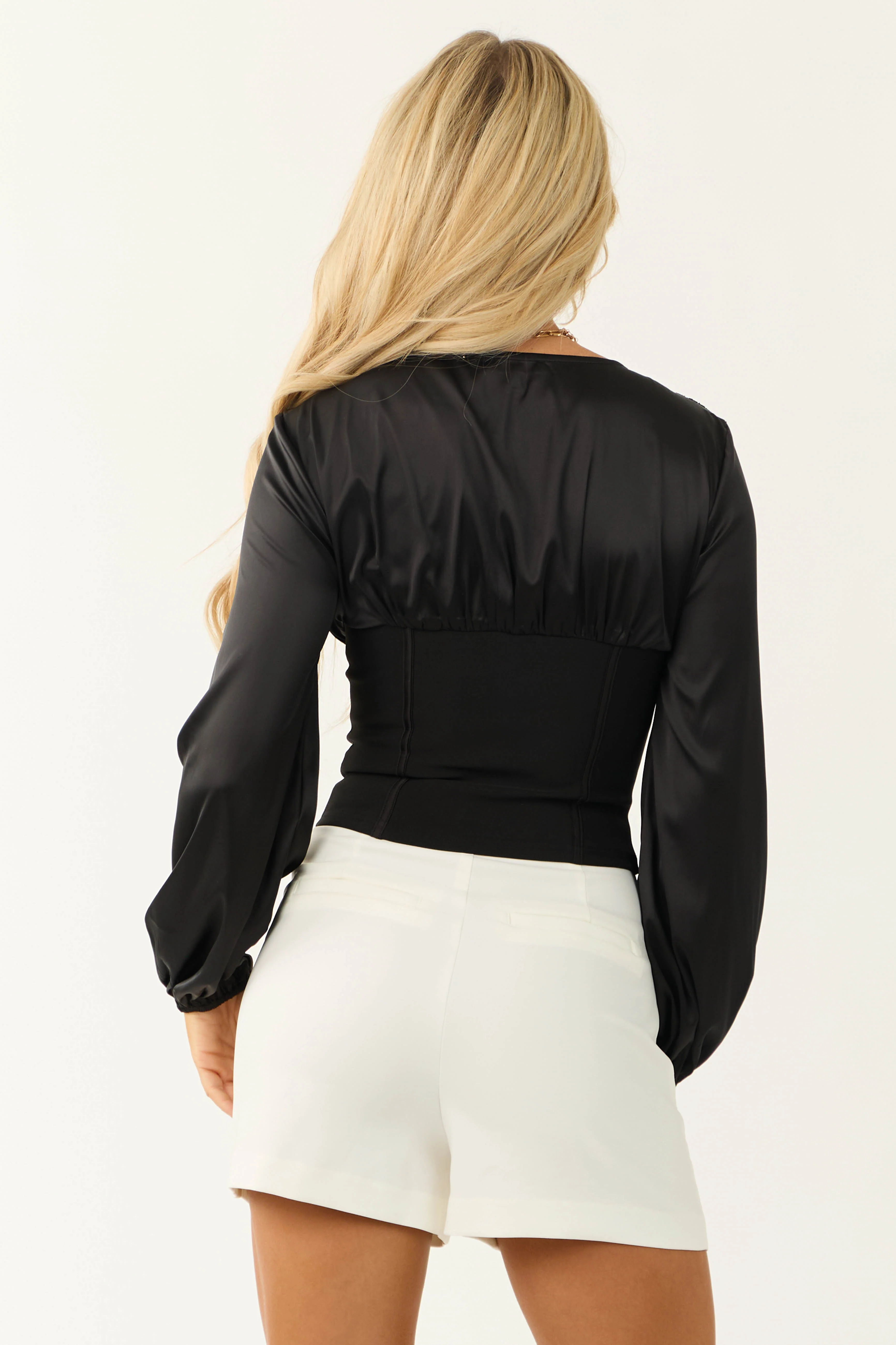 Black Deep V Neck Long Sleeve Corset Waist Blouse