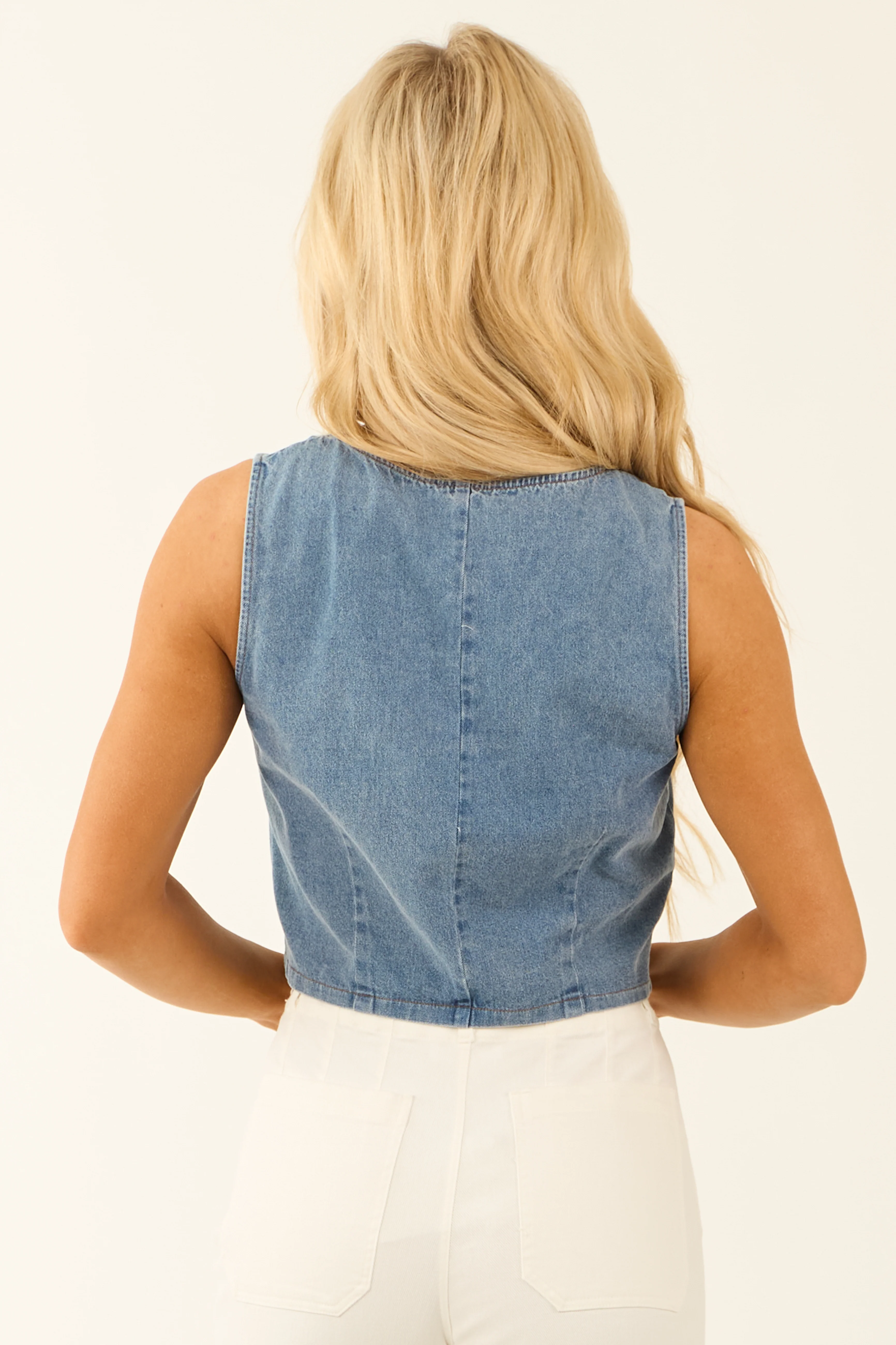 Medium Wash Denim Triple Front Tie Crop Top