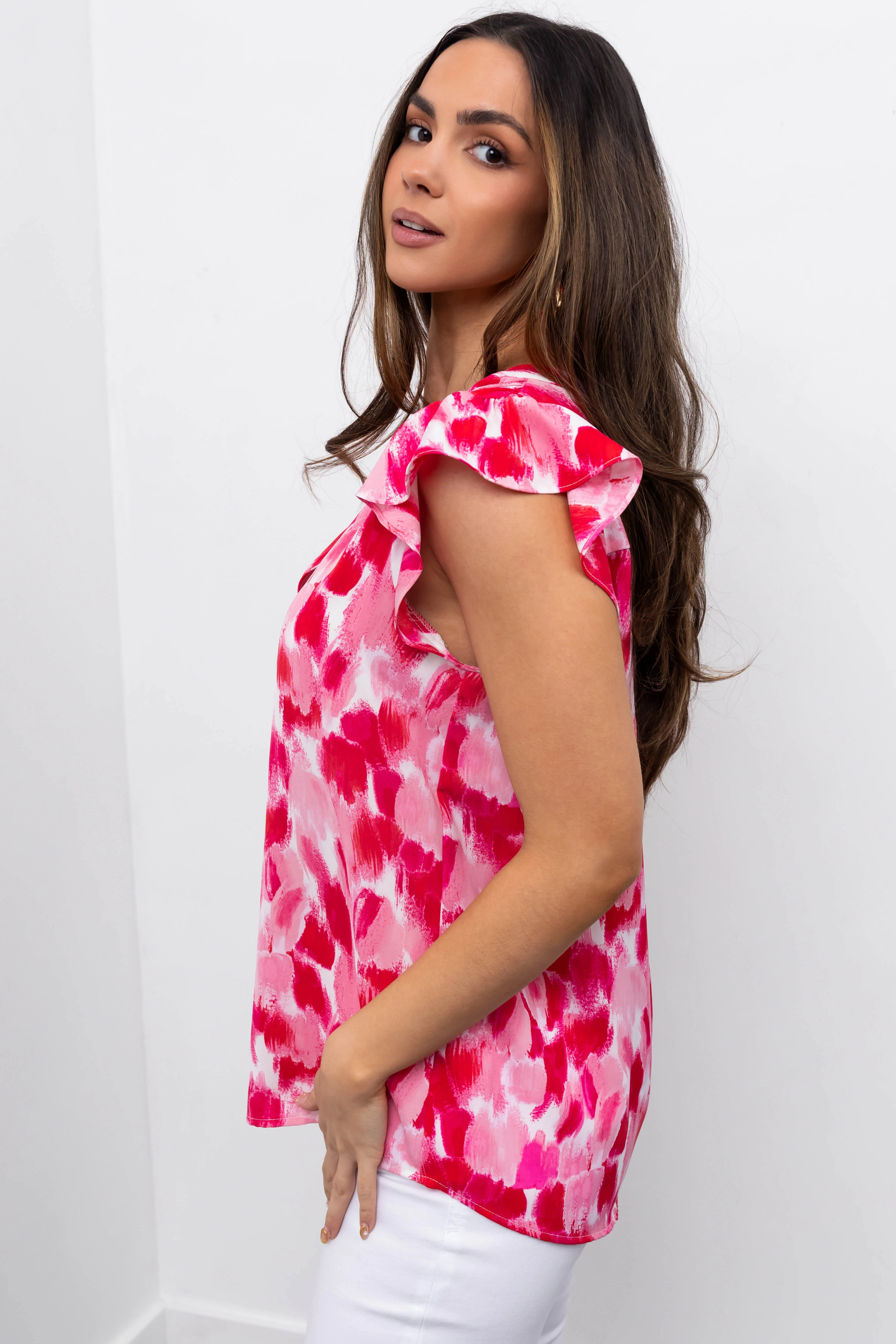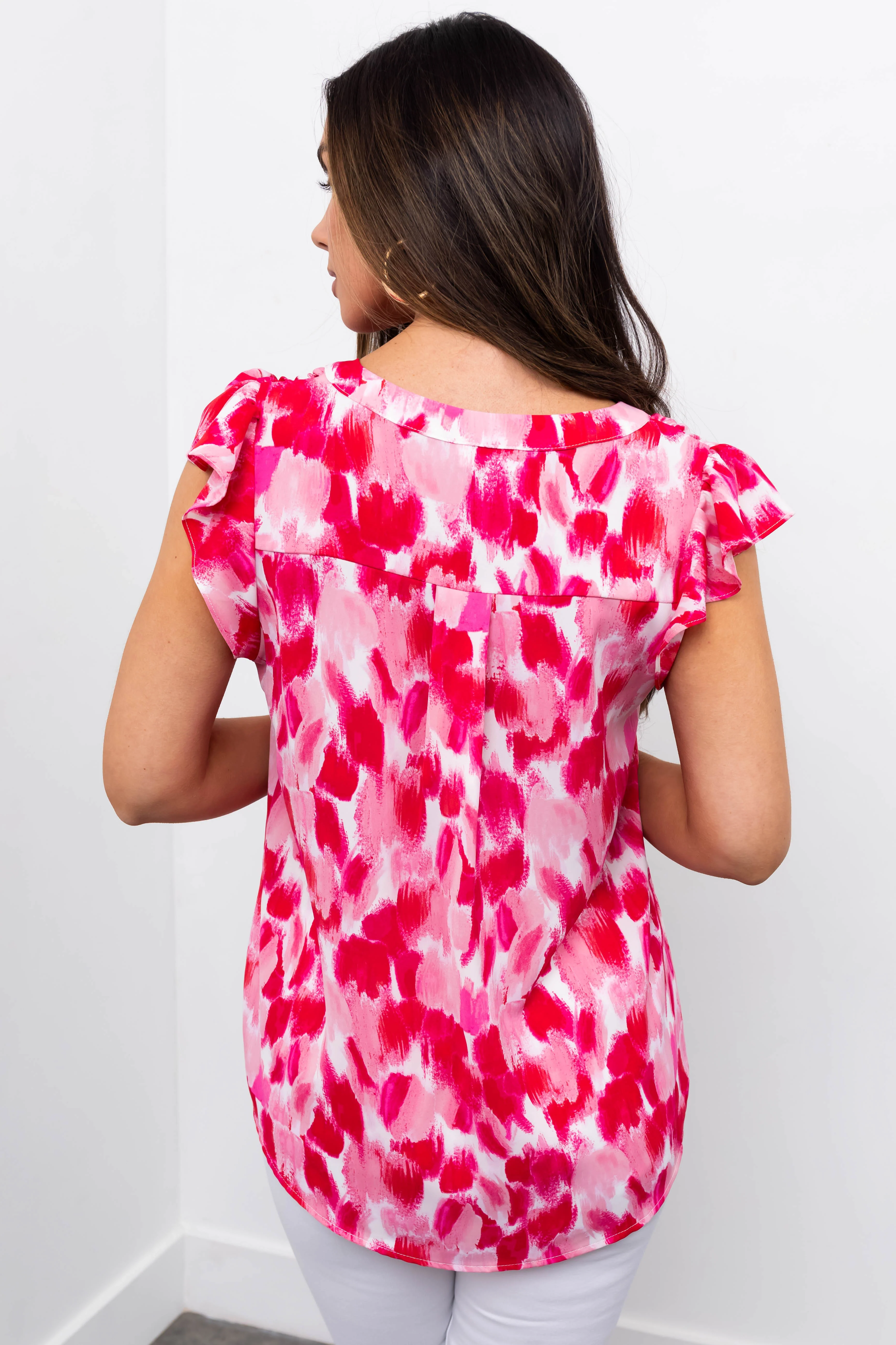 Hot Pink Brush Stroke Notch Neck Ruffle Sleeve Top